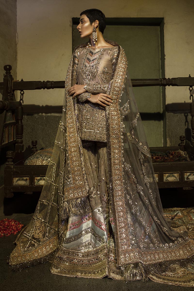 Bibi Joon is a dust gold kameez set on a rawsilk base with a chatta patti neckline and a symmetrical hem paired with a cotton net gharara with heavily embellished borders, chatta patti and resham rosettes. The look is complete with a net jaal dupatta with heavy zari borders.