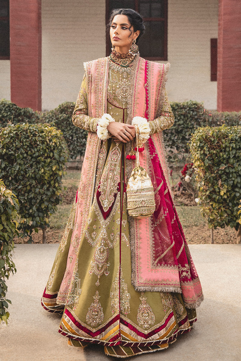 Ambreen Afzal breathes life into our 5 piece Mithran bridal, a beautiful heavily worked peshwas constructed on a rich moss green cotton net base with hand appliqued jamawar and velvet patches in the shades of rust and burgundy. The peshwas is heavily embellished with gota and zari which makes it an illustrious affair made especially keeping the mehndi event in mind. It is paired with a salmon pink heavy jaal dupatta with carefully place hand embellished motifs and gotta finish and a deep  fuchsia organza dupatta with heavy marori embroidery and salmon silk borders. Worn on top of a cotton net lehnga for an added volume and oomph effect.