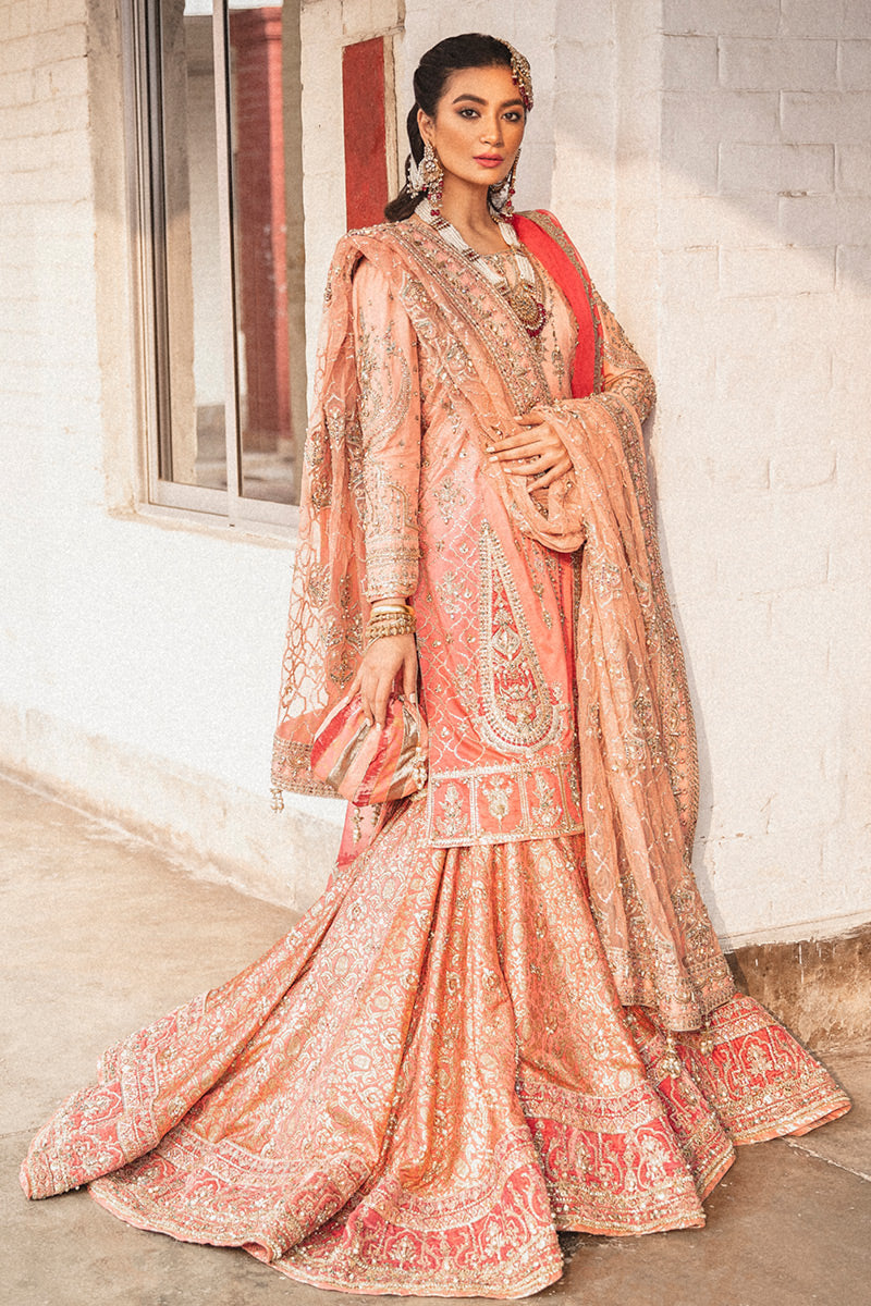 Abeer Asad Khan is the true embodiment of an empress in our 5 piece Mojgan bridal. Beautiful hues of peach and powder pink make up for this stunning bridal look that exudes allure and elegance. An ombre silk kameez with heavily hand-worked details and a beautiful chahaar bagh daaman. Worn over a beautiful brocade farshi ghararaa accentuated by fine tilla and dabka embroidery and a heavily hand embellished velvet border. The pair is worn with a delectable net jaal dupatta with hand embellished motifs and borders and our signature marori gota dupatta in a beautiful deep salmon color.
