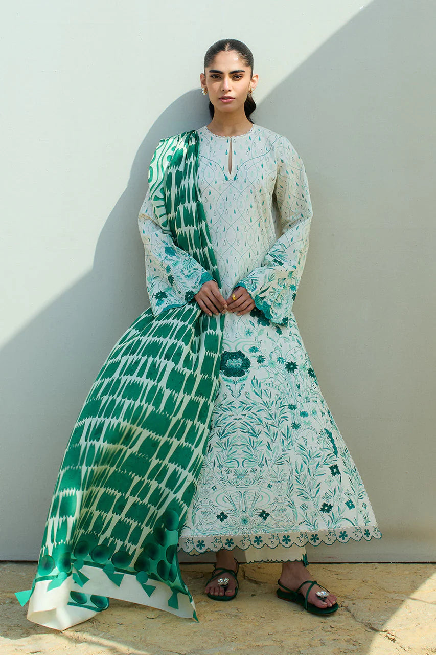 Intricately embroidered with vines and floral applique, this ivory hued jacquard lawn shirt exudes quiet luxury with its scalloped sleeves and organza lace finishing. Paired with a pure medium silk dupatta featuring an abstract print in a clover green hue and ivory coloured jacquard lawn culottes with a scalloped hem.