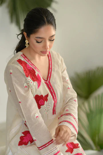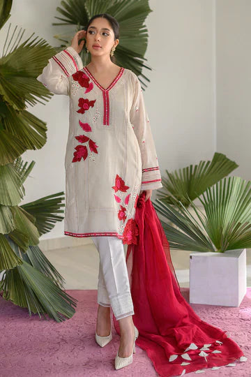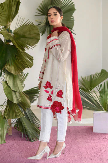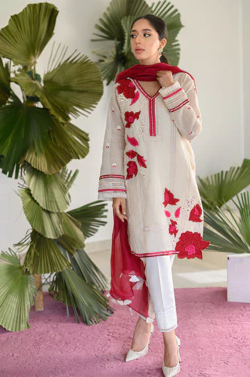 Be sure to turn heads in this cool, modern ivory shirt with big bold appliques in contrasting hues of red. Stunning lace details and contrasting dupatta completes the look.Pant (INDIAN RAW SILK )Dupatta (PURE ORGANZA)