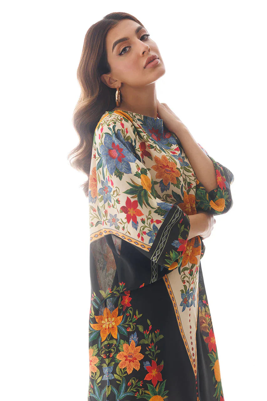 This crepe kaftan has a striking floral print on a black and white colour-blocked base, capturing our love of colour and print.