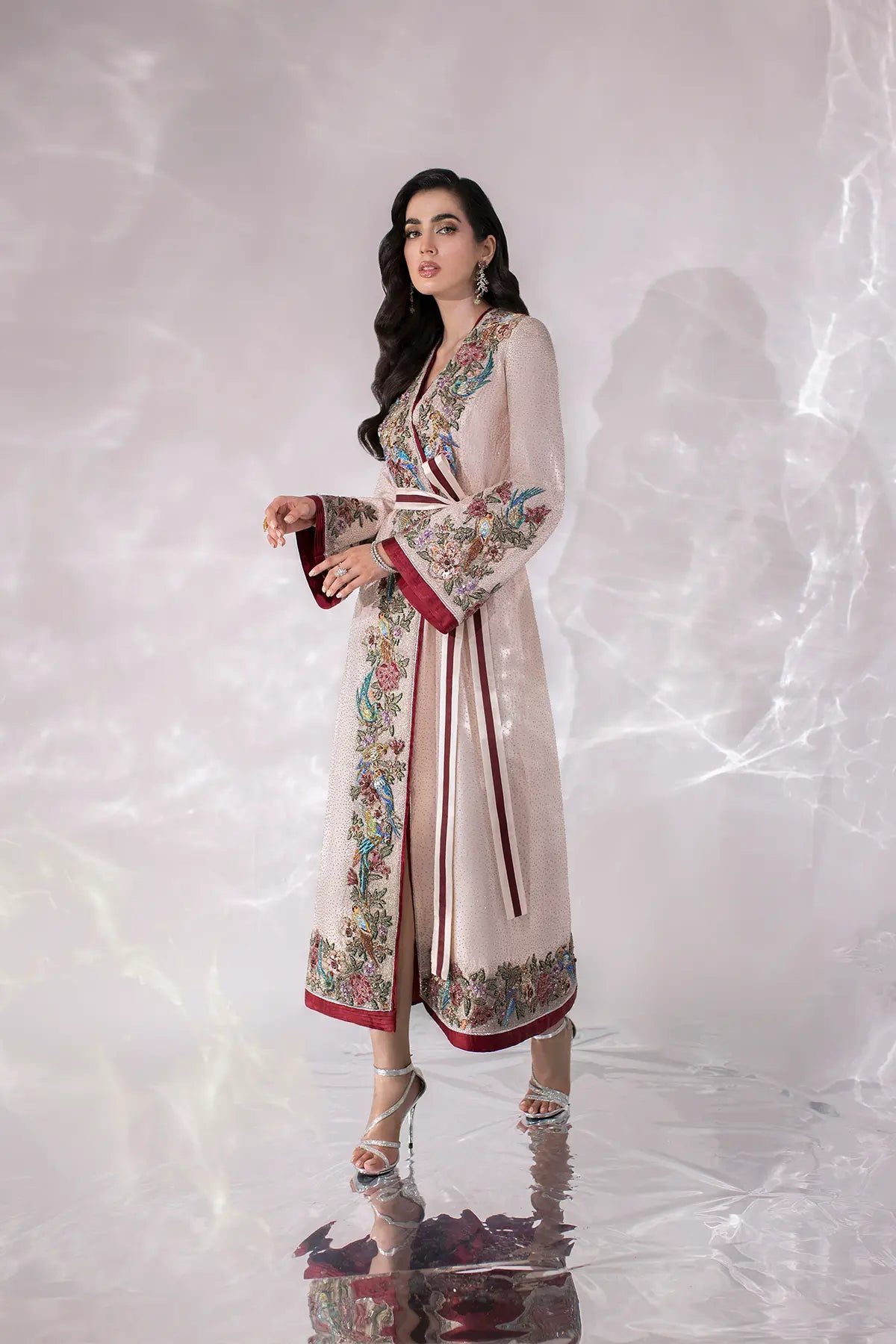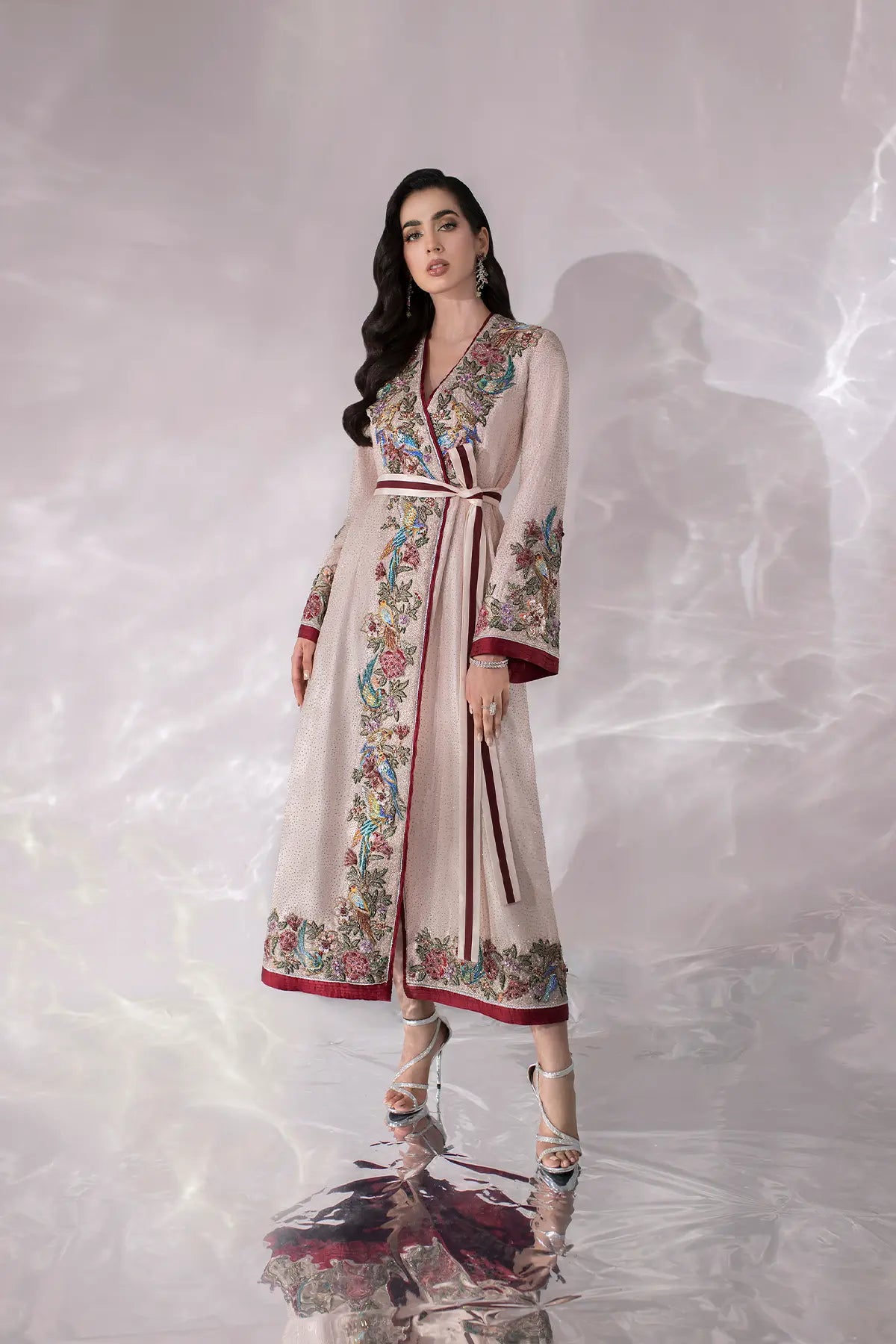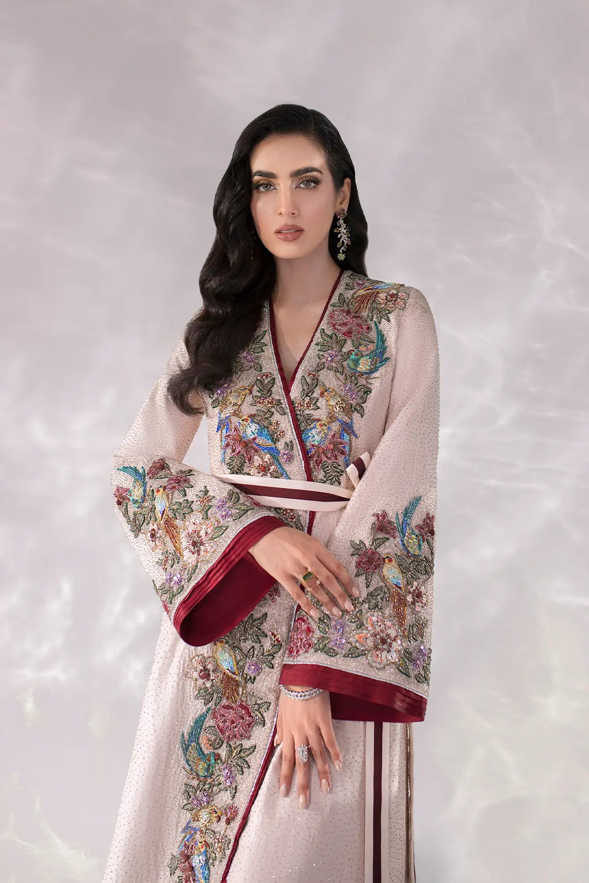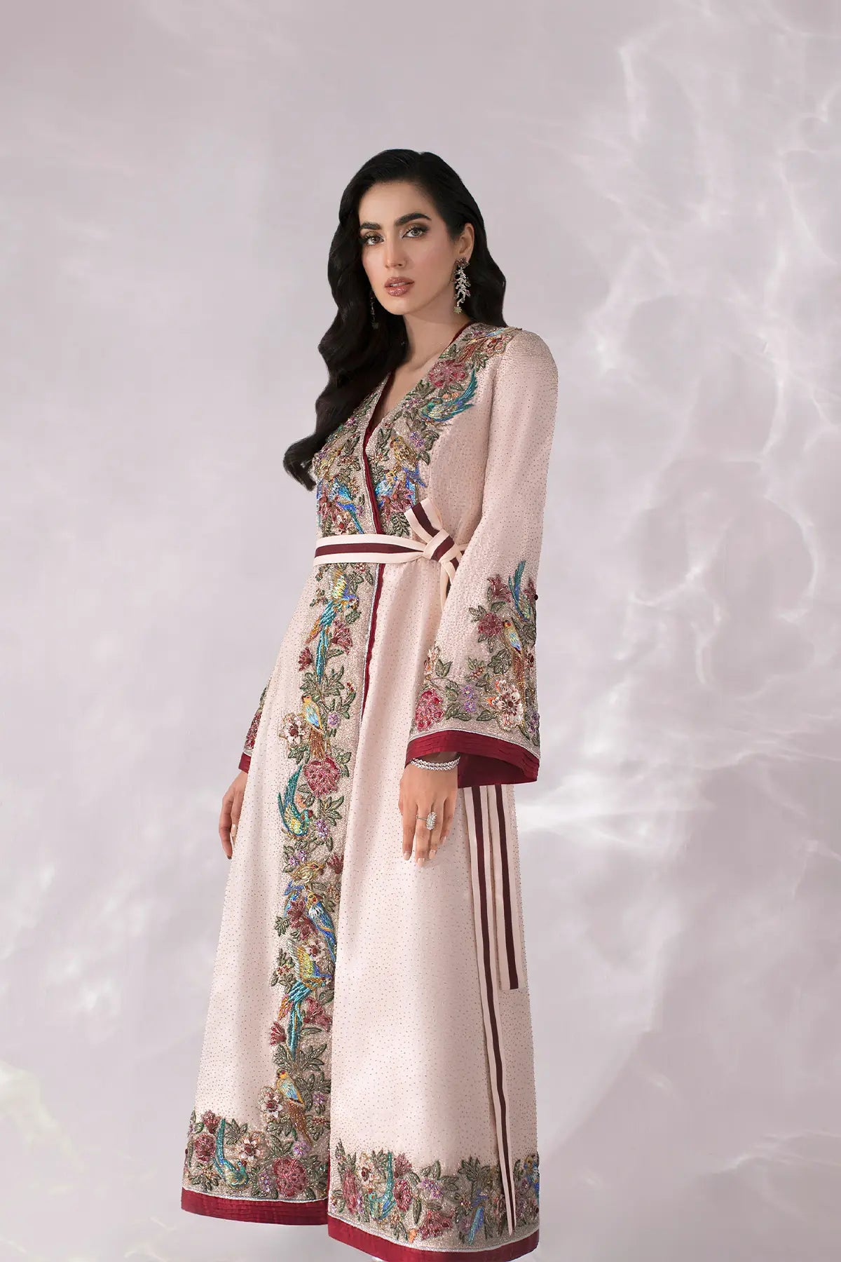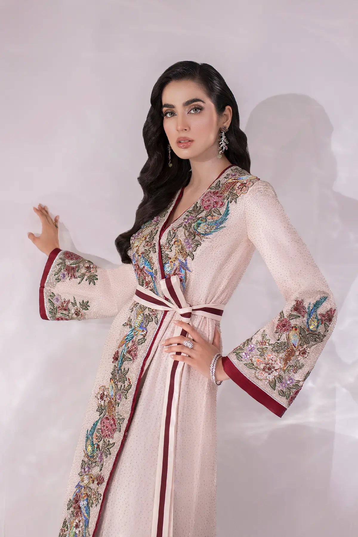 Inspired by the colours of passion, discover an array of exquisitely hand-embellished parrots amidst dreamy flora coursing through on an immaculately tailored jacket. The smallest of sequins and kat-daana in a multitude of colours on pale-blush silk add life to this look. A delicate stardust splash of kat-daana all over the surface of the jacket renders a unique sheen which is complimented with a striped silk belt.