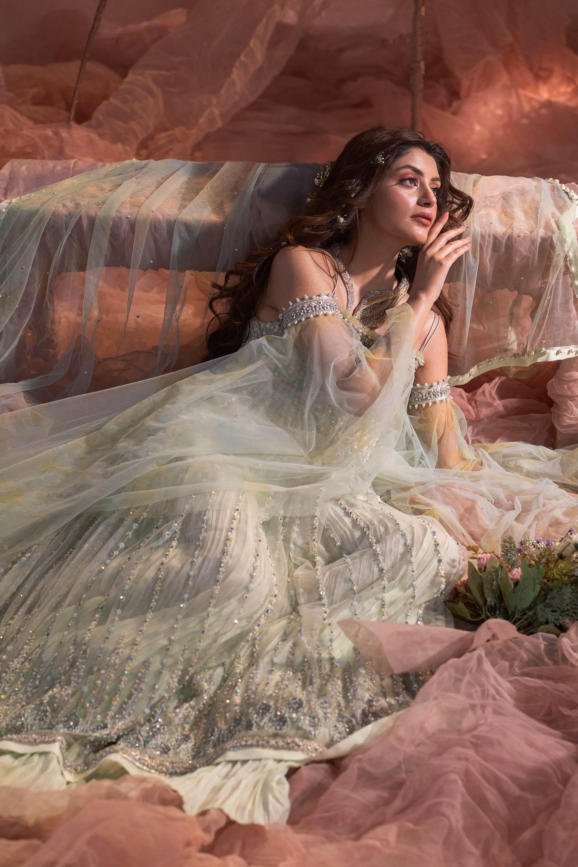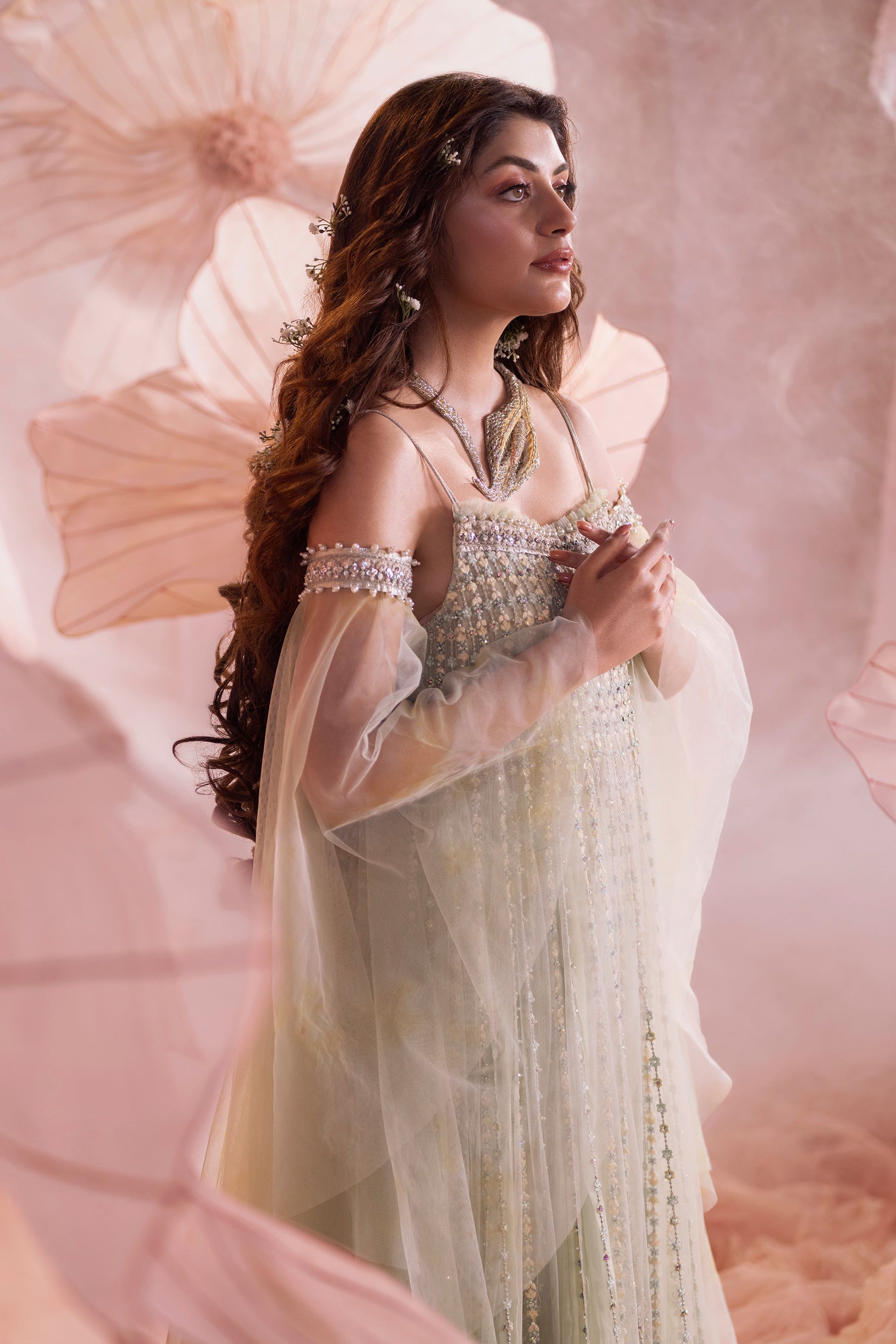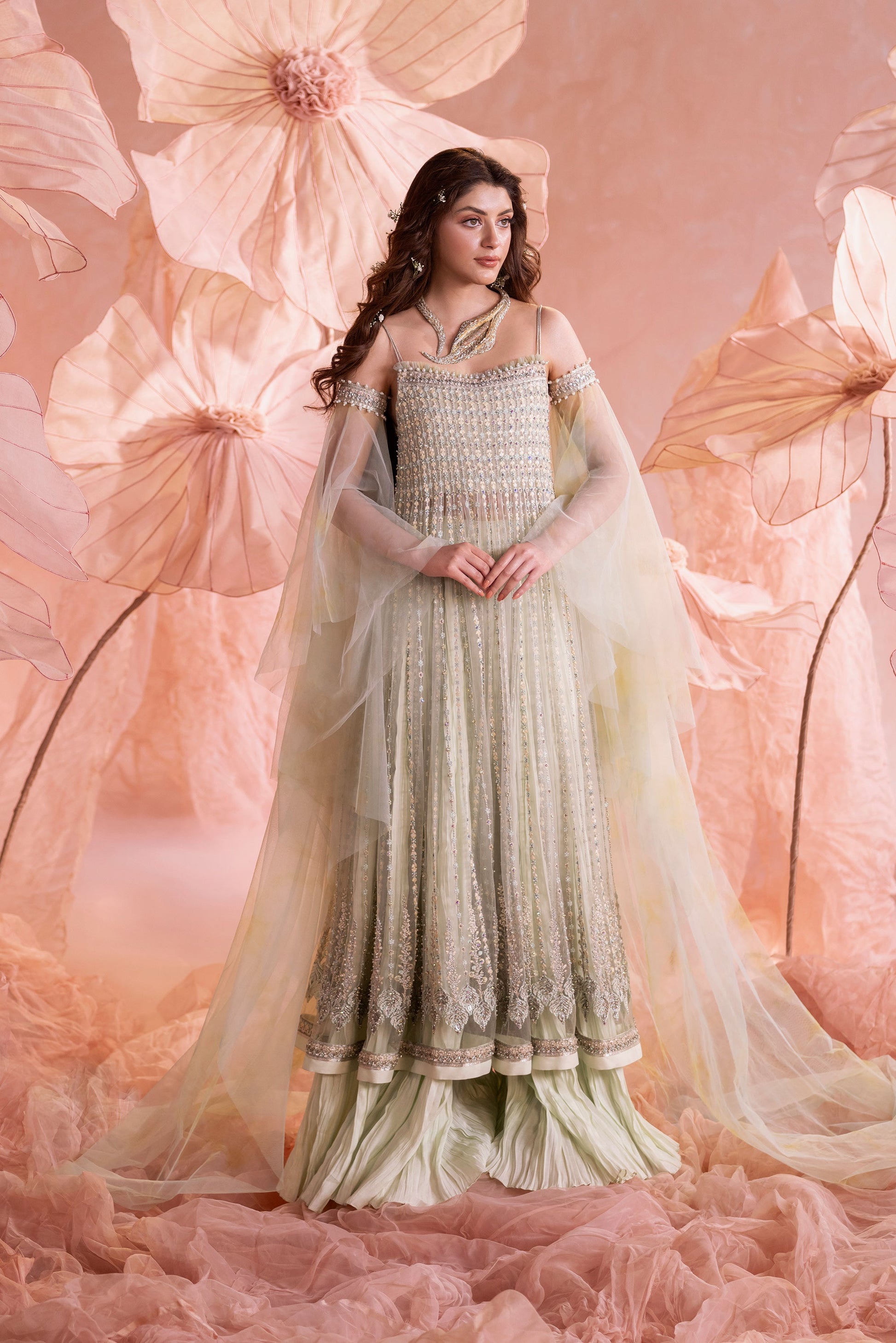An intricately worked pishwas emerges in soft hues of apple green, as a whisper of nature’s serenity. Thread work in shades of pale yellows and greens on net, a canvas for delicate flowers made in sequins, pearls and crystals. Complemented by a hand-pleated silk sharara, this ensemble tells a tale of subtle elegance. The finishing touch, a soft tie and dye net dupatta is gracefully finished with dazzling pearls. A dreamy option of styling with cascading bazu-band adds to the magic of this look.