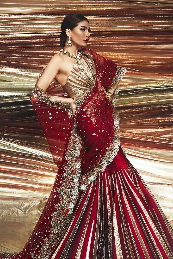 Opulent streams of gold course through her crimson silhouette. This is where modernity and tradition walk as one. A contemporary hand-embellished saari and mermaid skirt with jewelled tones of emeralds and rubies come together with an artisanal hand-stitched couture blouse inspired by an oyster and its pearl.