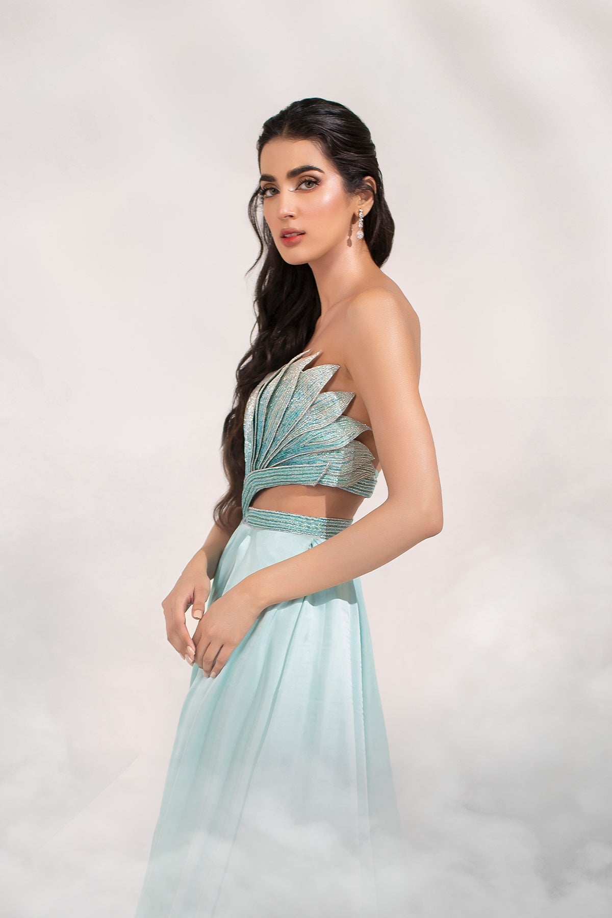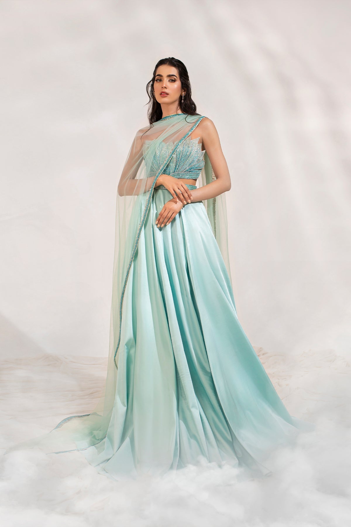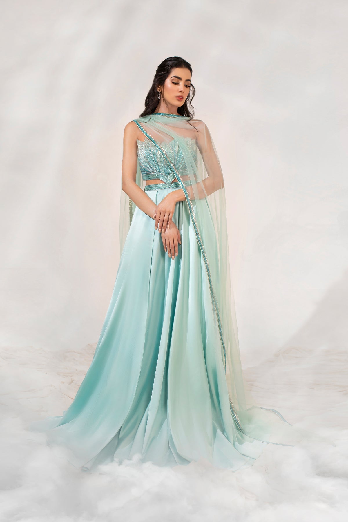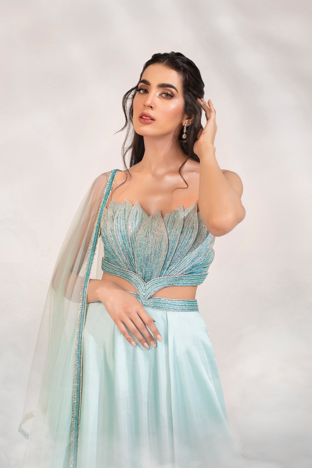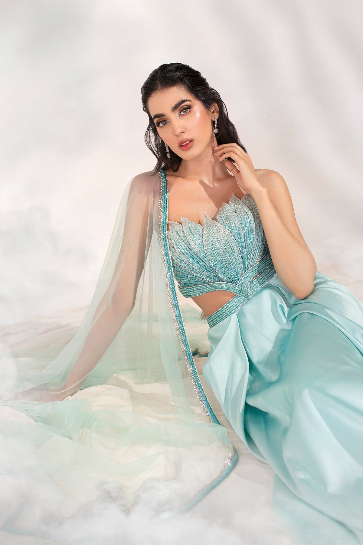 Presenting an artistic vision of a blooming lotus, delicately handcrafted with ombre glass cut beads. Each petal is separately embroidered and hand basted with drapes of aqua dyed silk. Coupled with an intricately embellished dupatta, every element comes together creating a magical and timeless design.