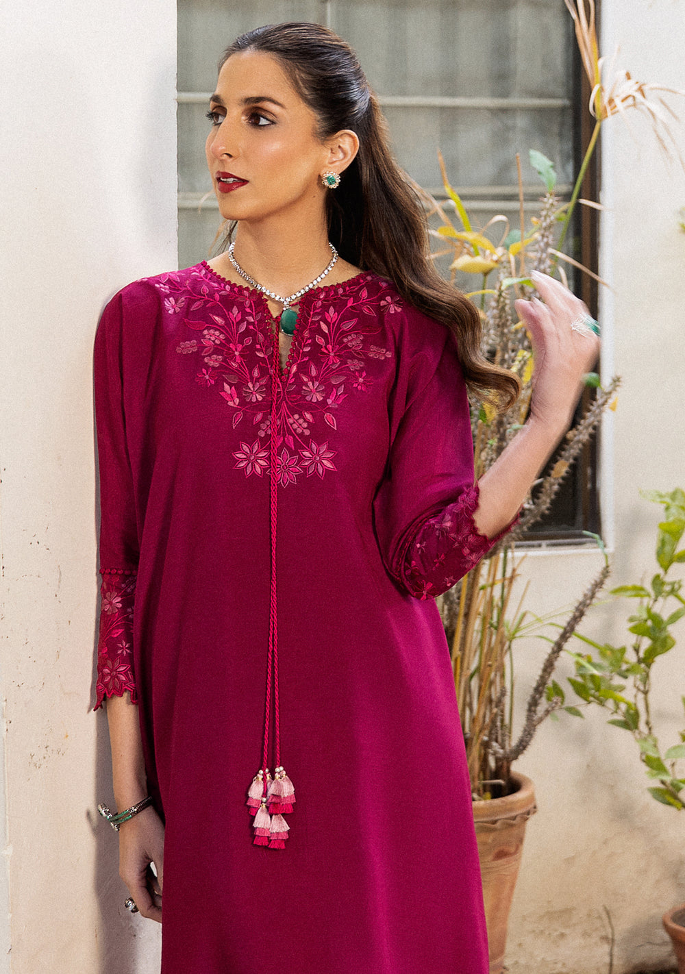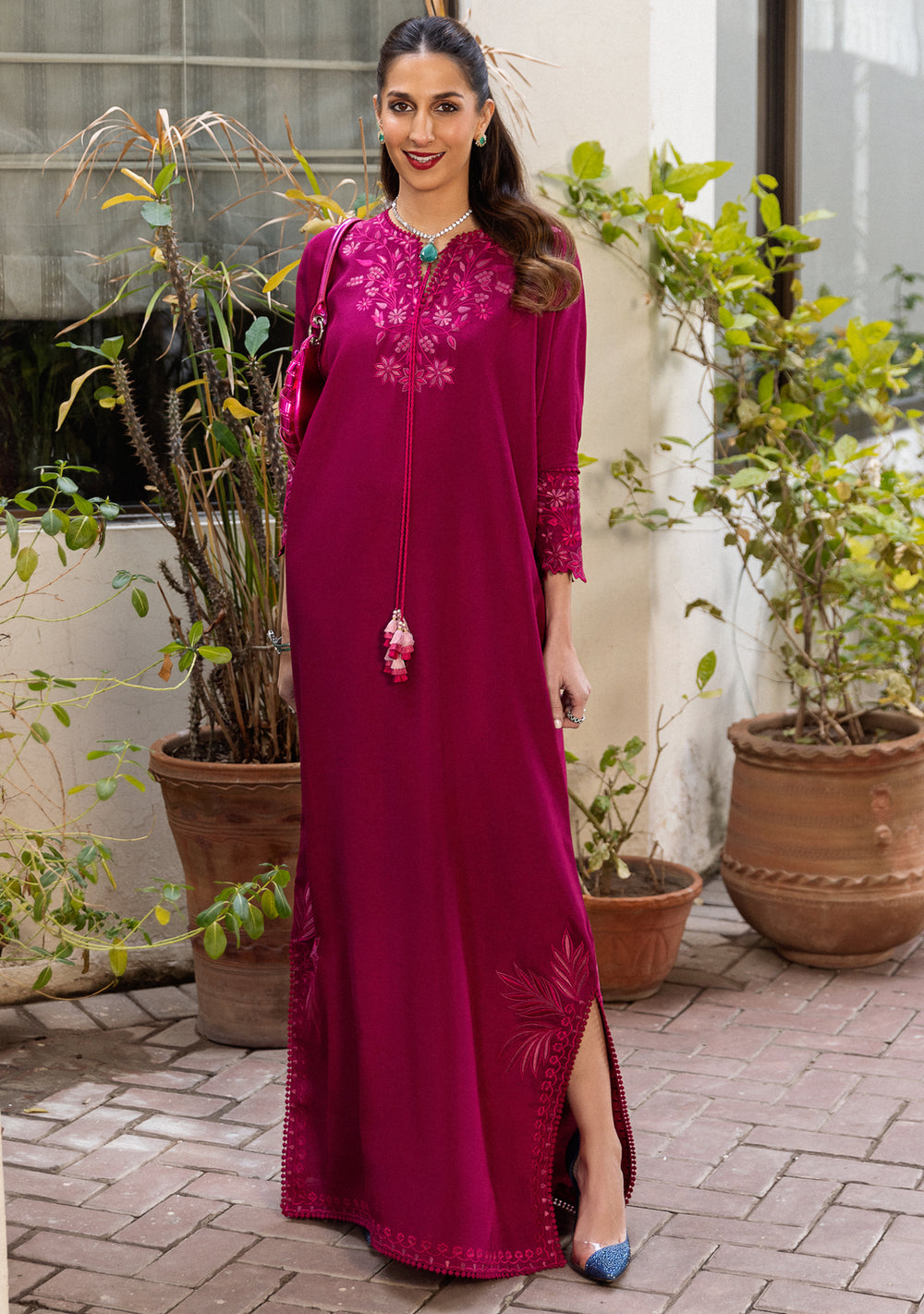 Elaheh, the magenta column-cut kaftan comes with intricate embroideries throughout its edges. The kaftan has batwing sleeves and a contrasting tassel on the neck.