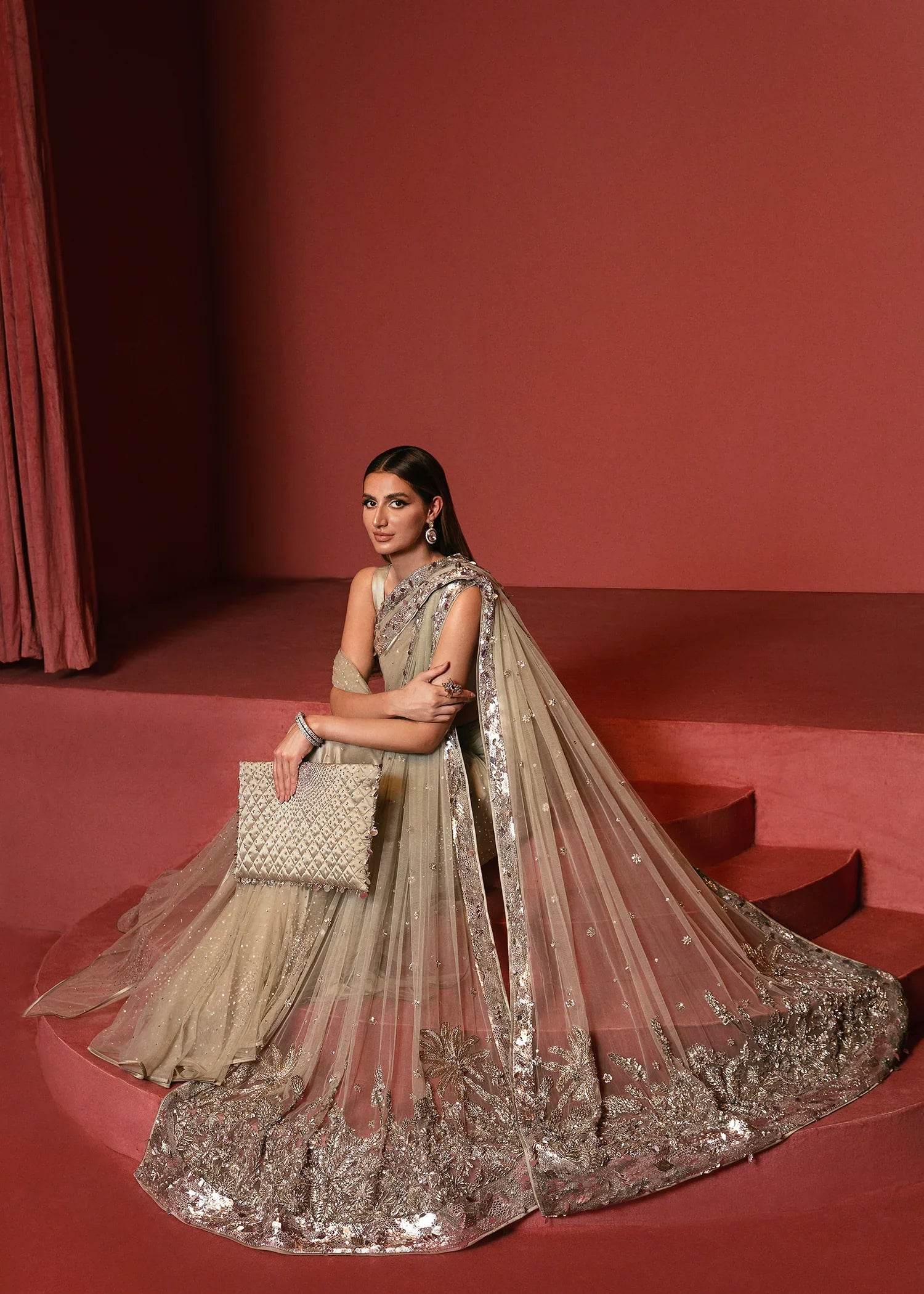A Pistachio net saree with beautifully spreaded chatta of sequins. It comes with a plain pistachio satin blouse. It has a separate net dupatta that has a heavily embellished pallu along with a shiny sequin border as edging stretched on all four sides of the dupatta.