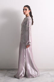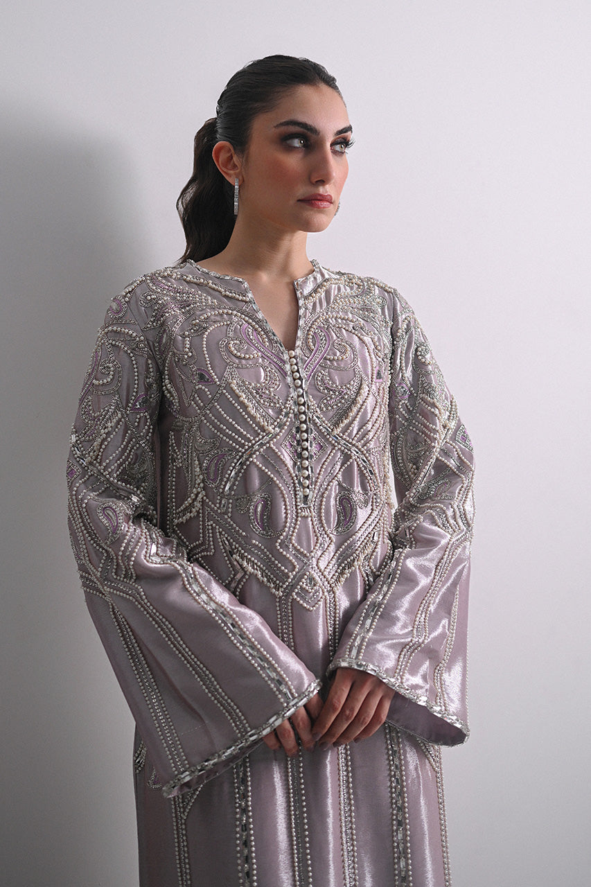 An effortless luminous kaftan, cut from lilac tissue, magnifies the mystical allure of the architectural contours. The use of bespoke pearlescent geometric embroidery radiates a transformative energy through meticulous tailoring and opulent details with hints of resham.