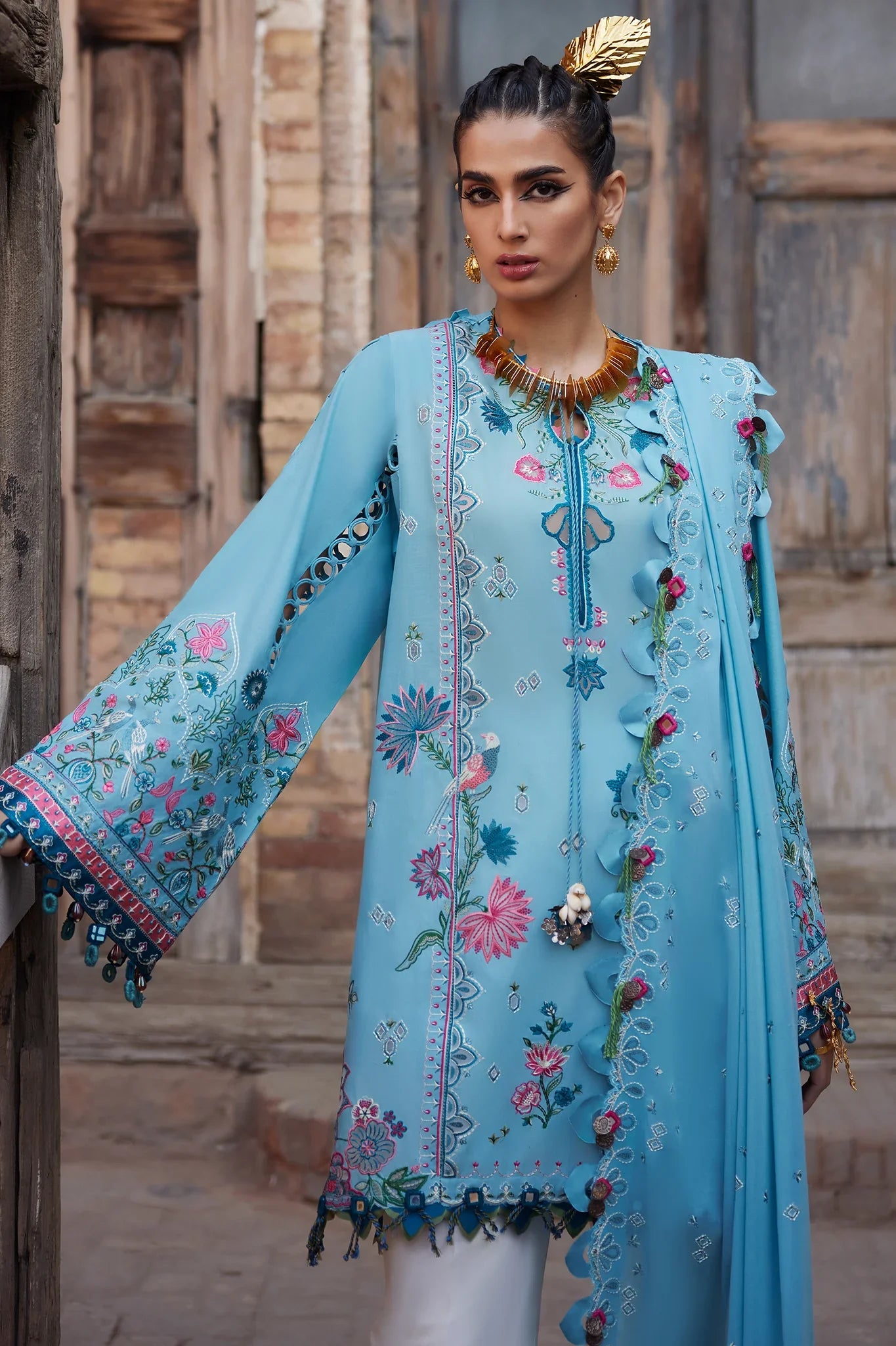 A beautifully embroidered neckline adds a touch of refined charm, while the ensemble’s ethereal voile dupatta—framed with heavenly embroidered borders and soft scalloped edges—cascades like a whisper, capturing the essence of breezy elegance.
