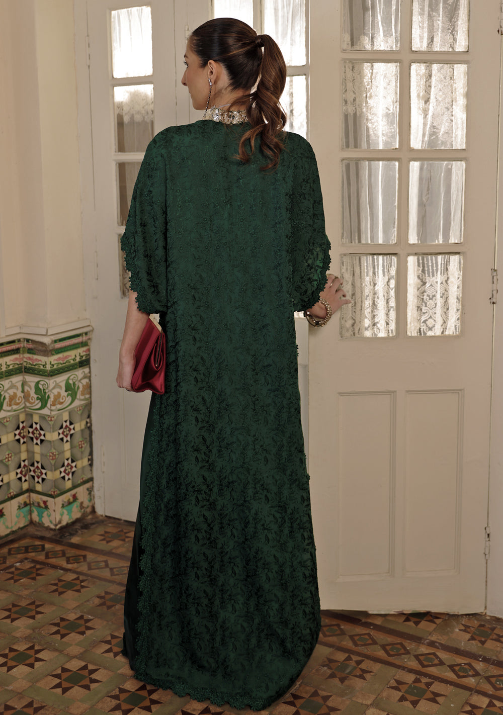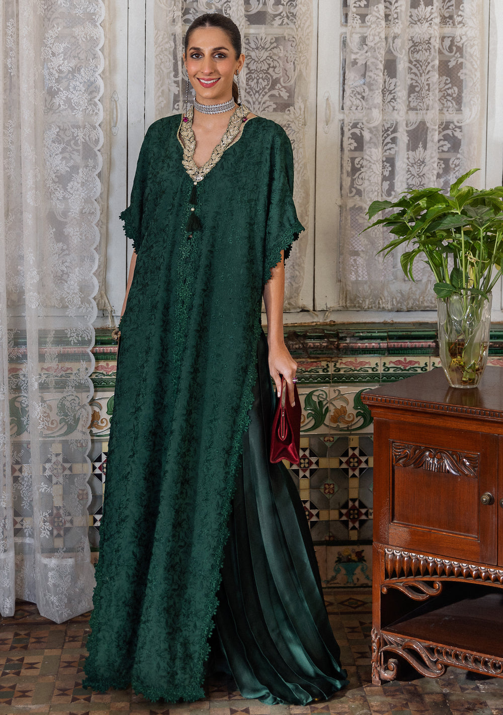 Malisa, the deep emerald kaftan-cut shirt comes fully embroidered on viscose silk with scalloped edgings. It comes with a hand-embellished wave neckline and is paired with coordinating satin silk pleated pants.