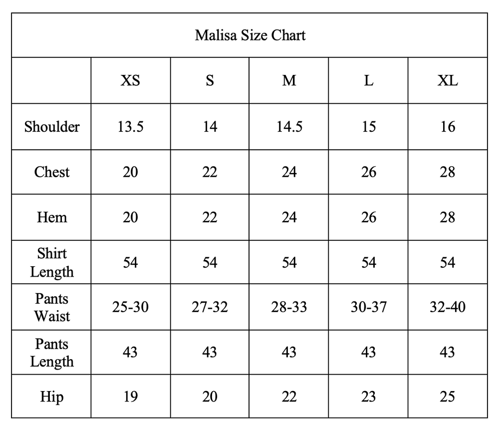 The size chart is the last image on this page and shows the one sided measurement in inches, of the stitched outfit.