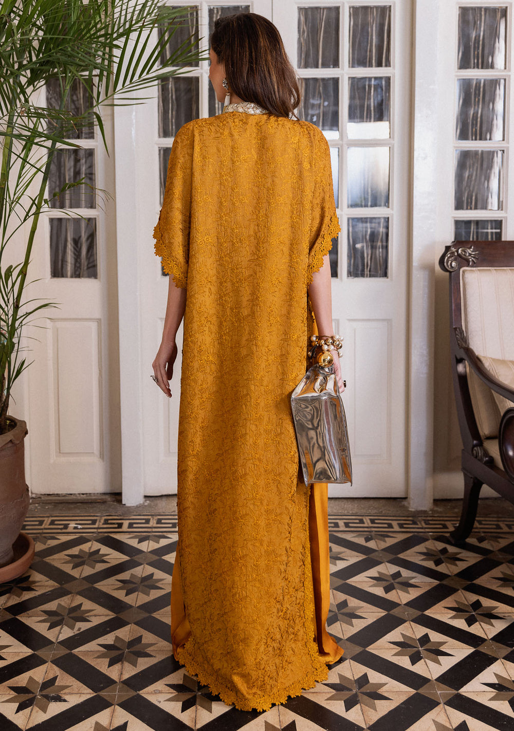 Malisa, the ochre kaftan-cut shirt comes fully embroidered on viscose silk with scalloped edgings. It comes with a hand-embellished wave neckline and is paired with coordinating satin silk pleated pants.