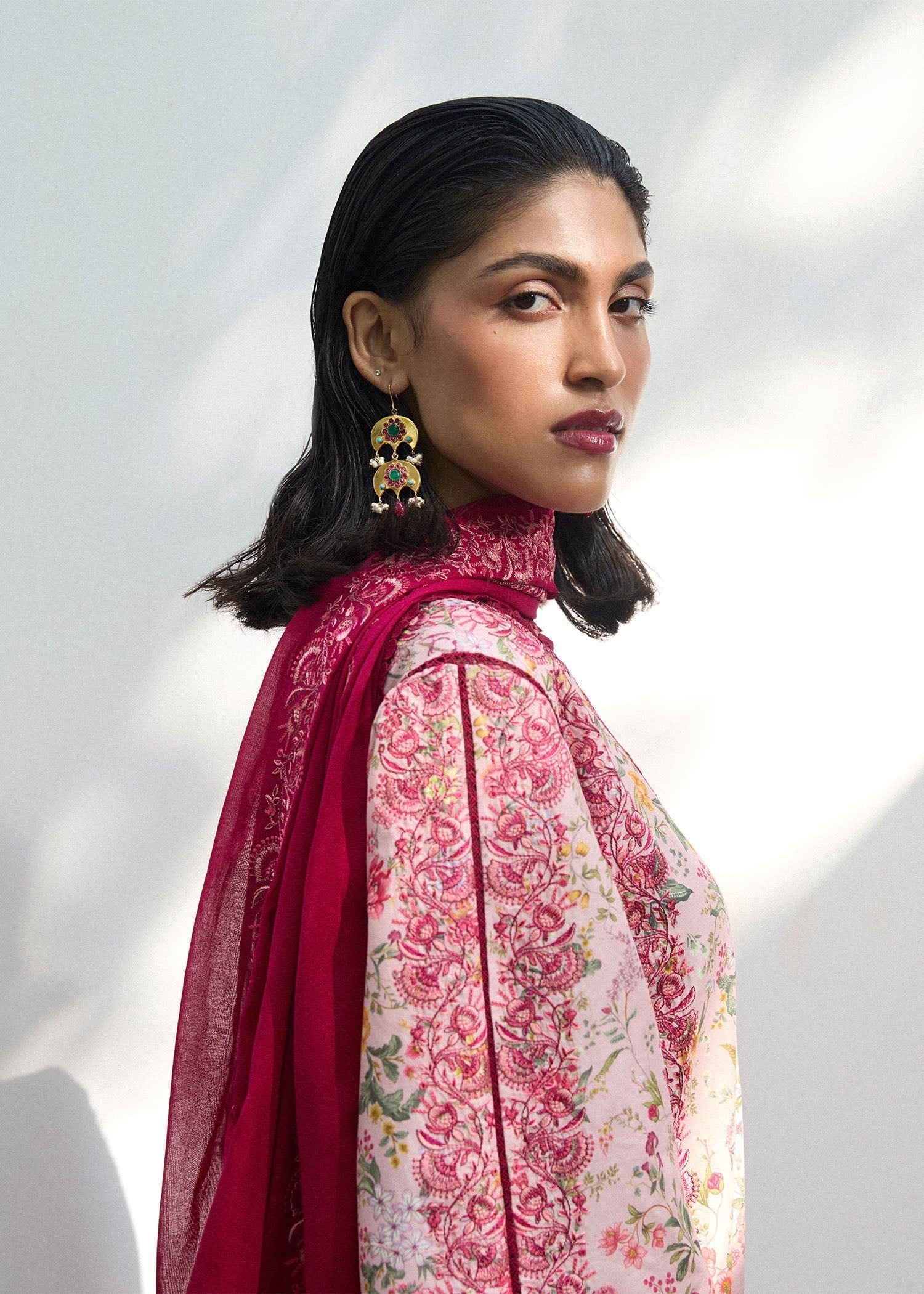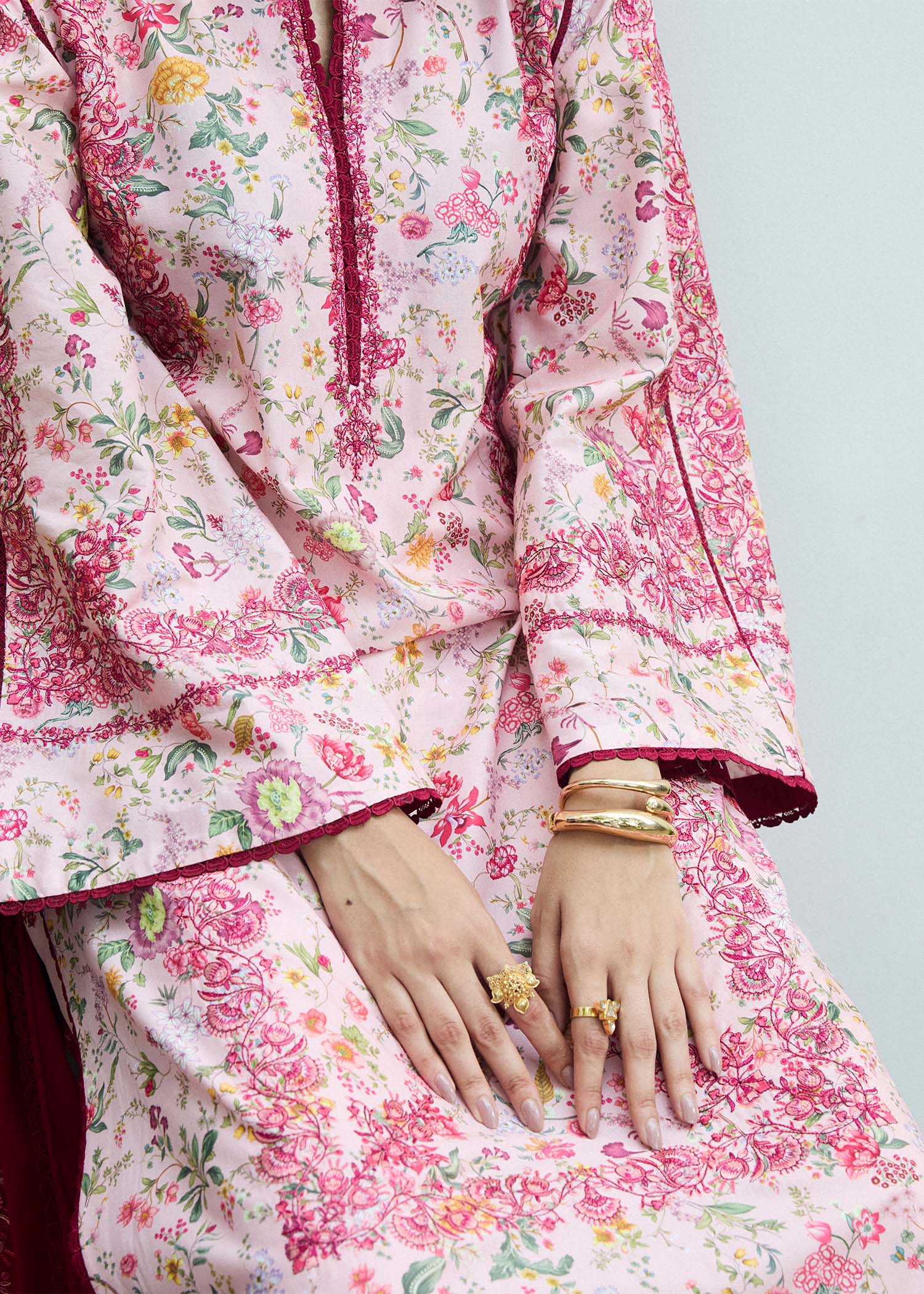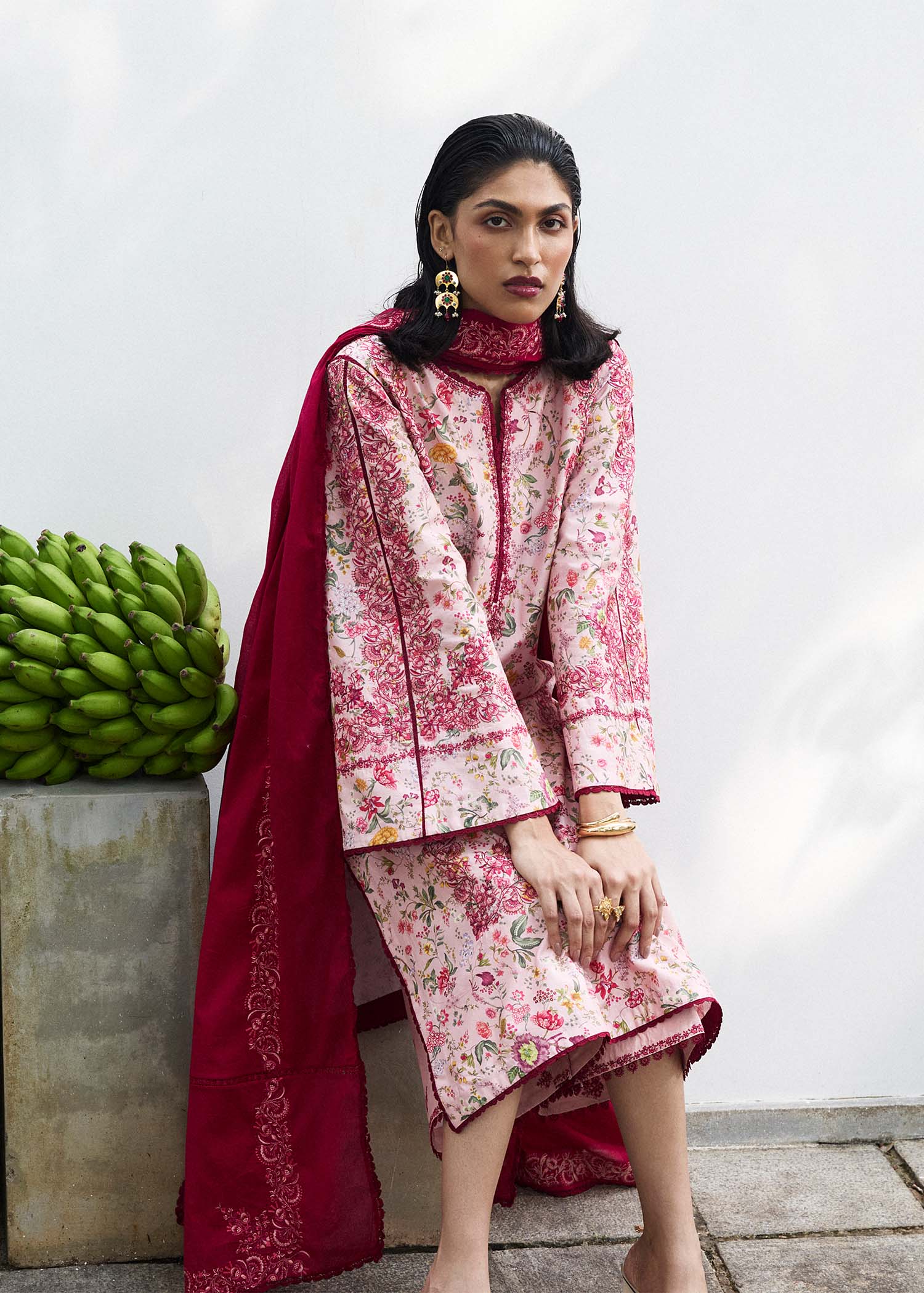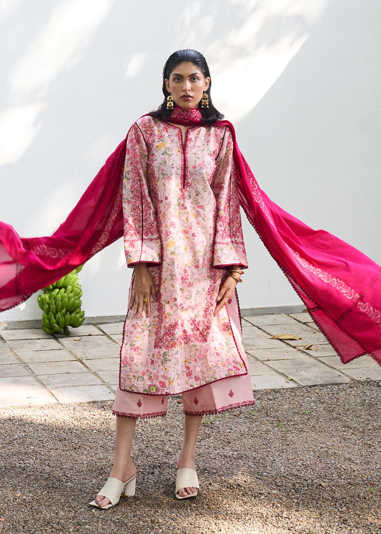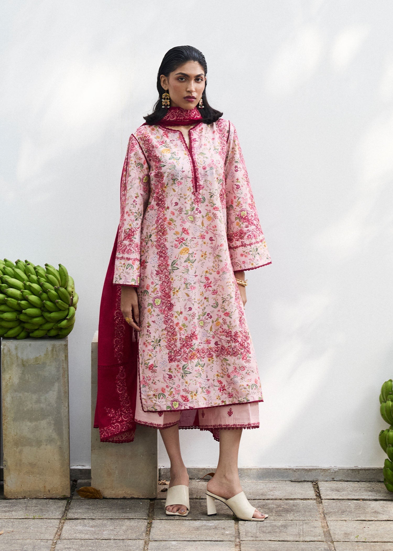 Brighten up your summer wardrobe with this breezy pink printed outfit, adorned with tonal pink embroidery for a soft, elegant touch. It’s paired with an embroidered hot pink lawn dupatta and eye-catching culottes featuring a delicate embroidery spray. Fresh, feminine, and perfect for sunny days.