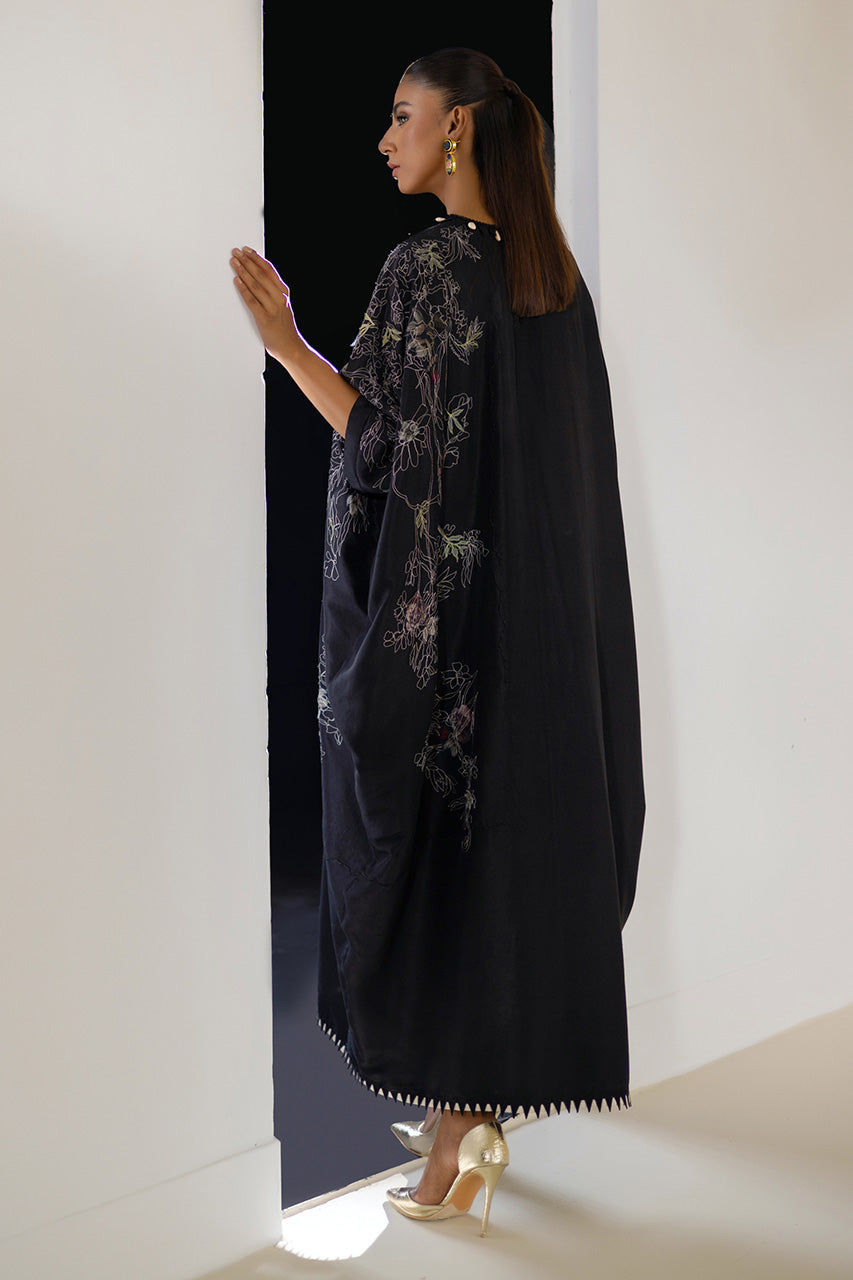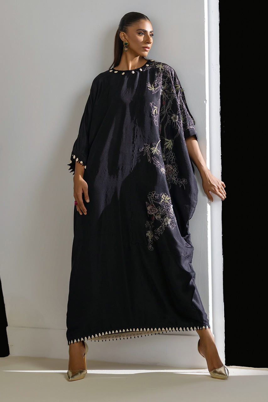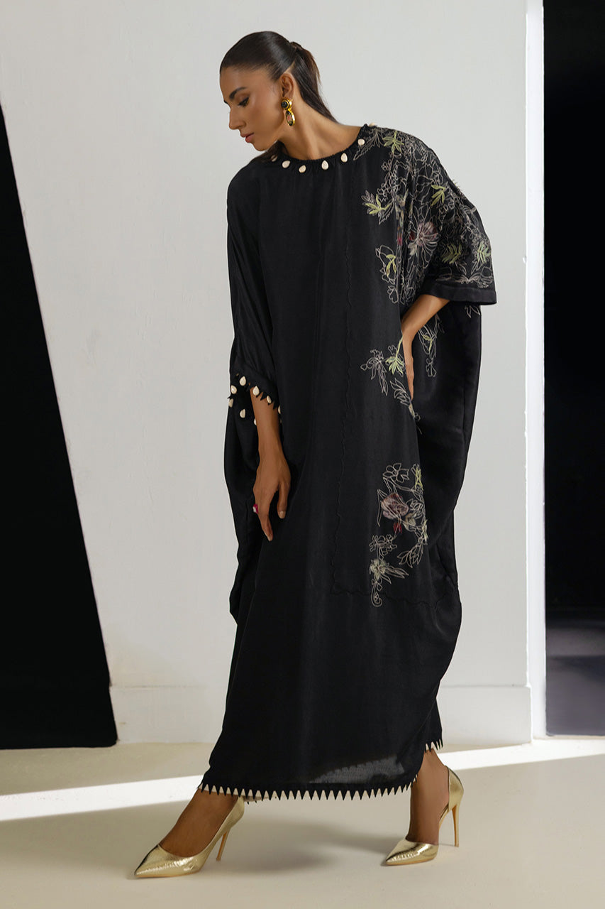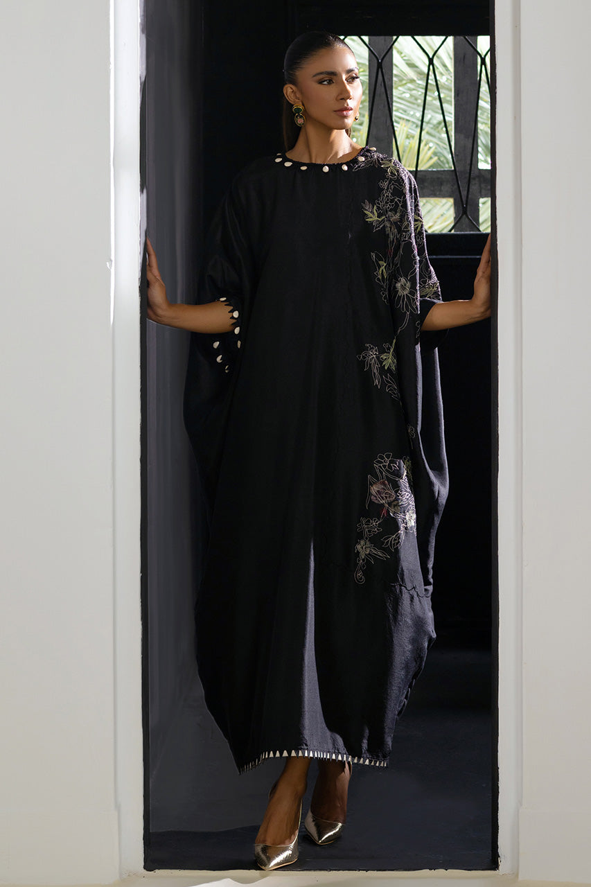 A striking kaftan in pure black raw silk, featuring embroidery and embellished with marble beads and chevron lace, exuding luxury and comfort.