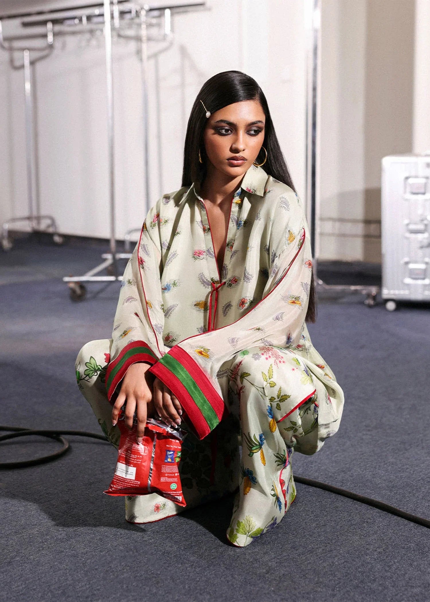 A light pistachio green silk coord set featuring a delicate floral repeat on the shirt, contrasted by a bolder floral print on the flared pants. Designed with green and red satin silk accents along the sleeve hems, neckline, and flared pants’ side seams and hem for a striking finish. A printed collar and red satin tassel detail add dimension and charm — blending softness with vivid color play.