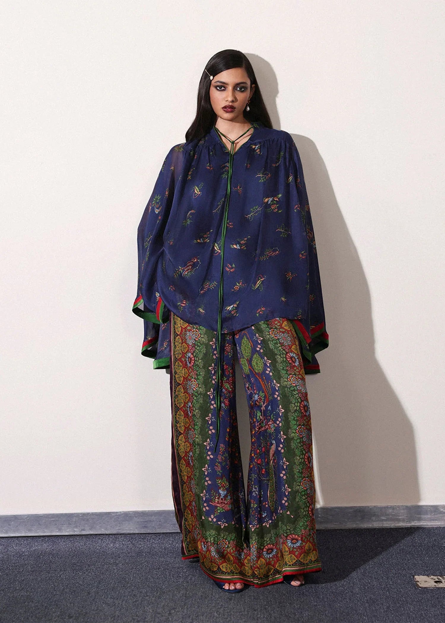 A midnight blue mid-thigh length floral printed silk shirt with red and green satin silk trims on full-circle sleeves and green satin tassel detailing on the neckline. Paired with multicolored floral printed wide-leg pants for a bold, effortless statement.