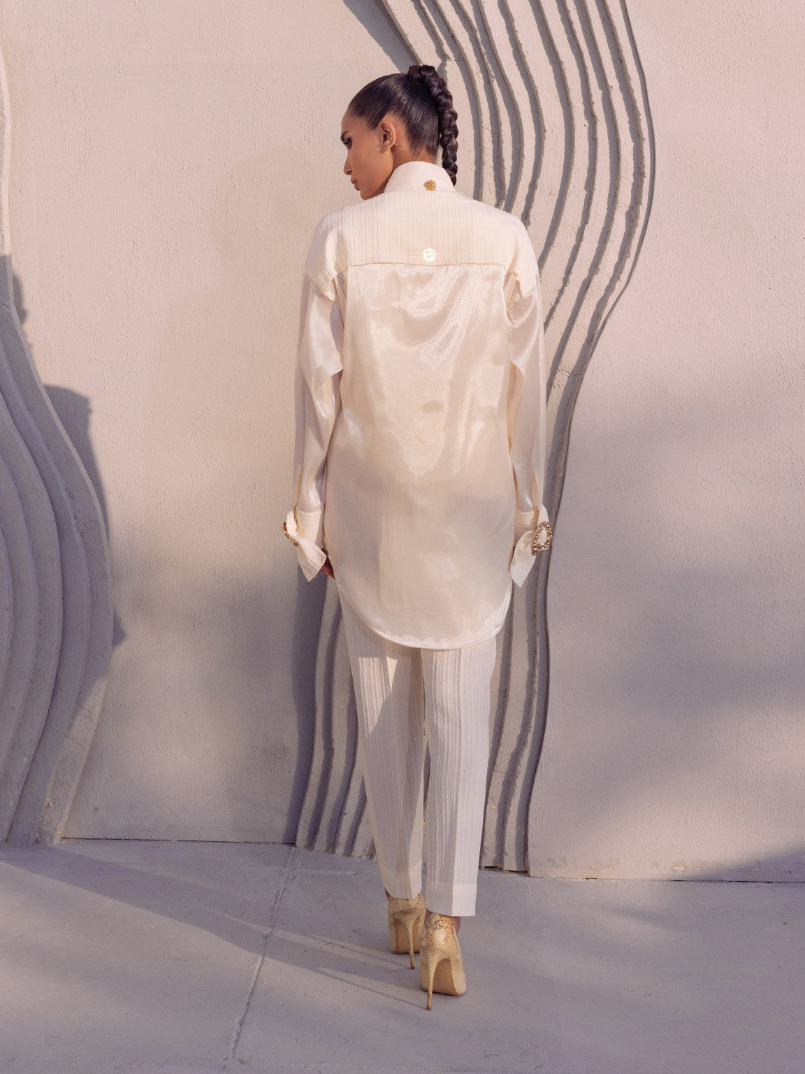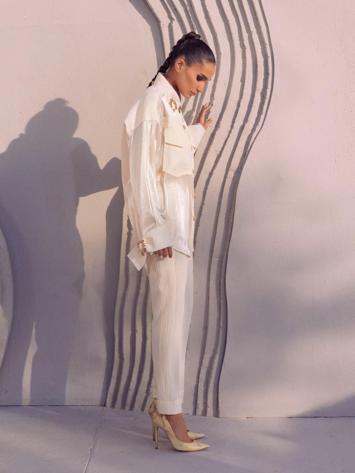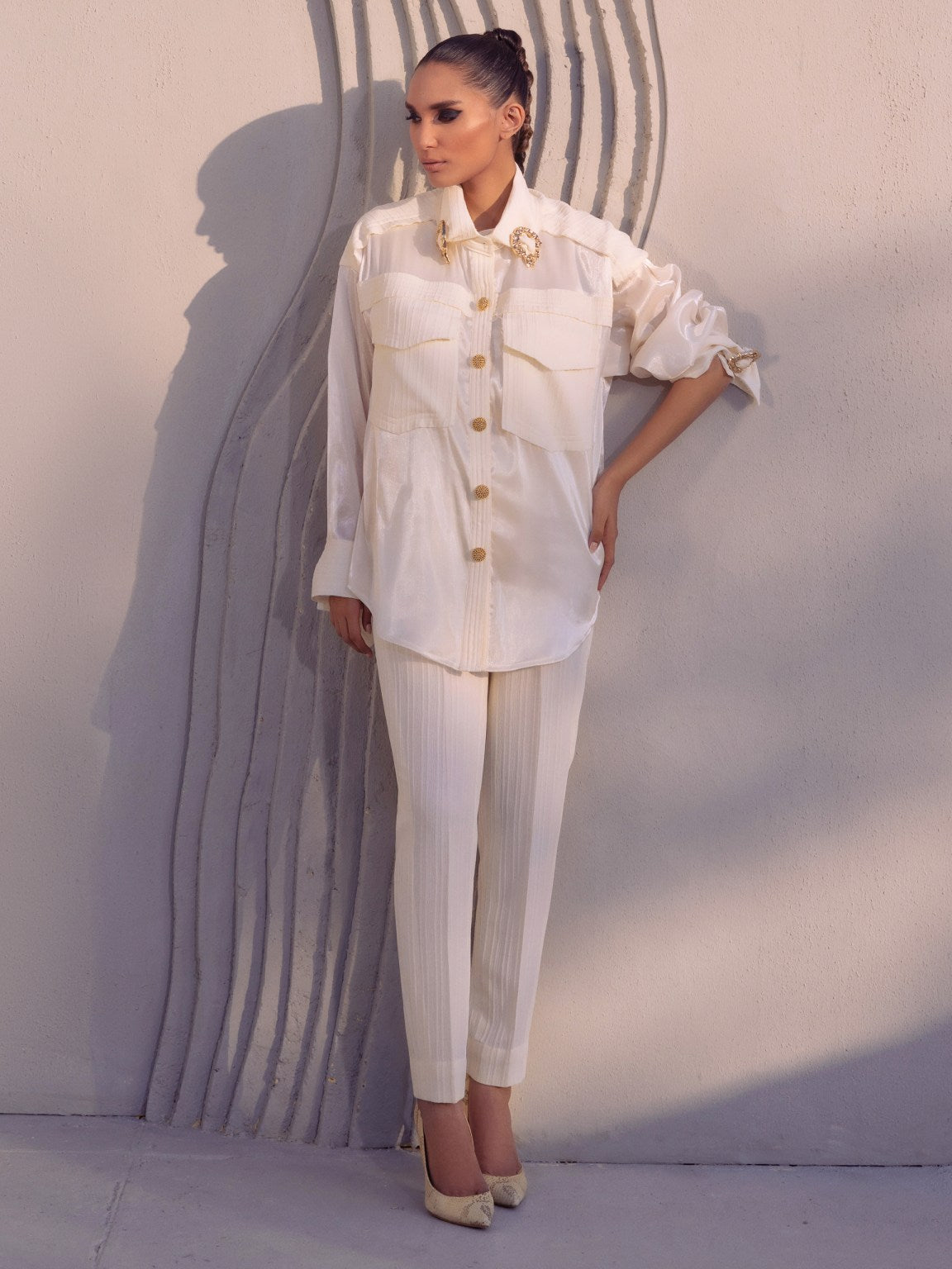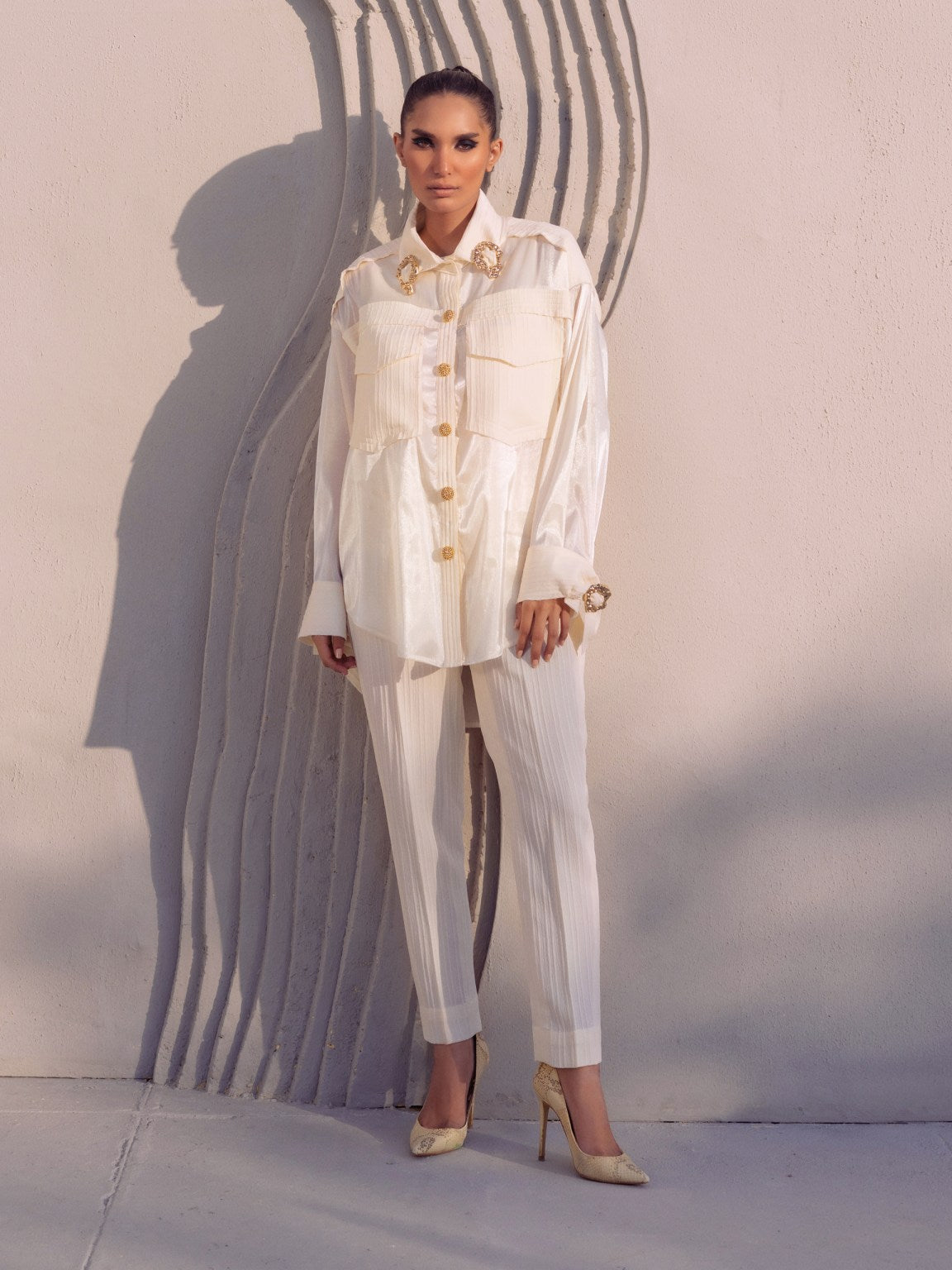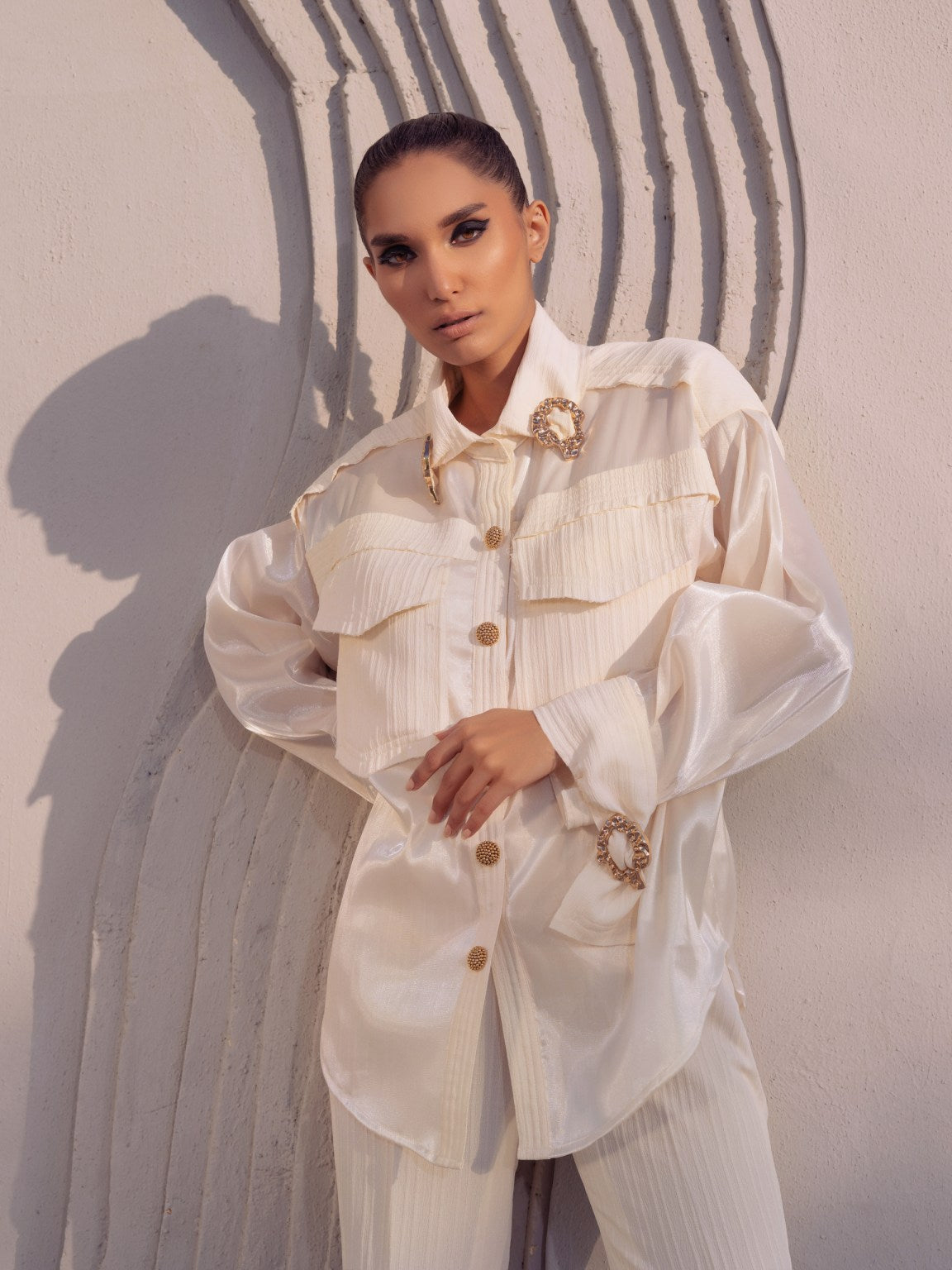 - Oversized ivory shiny top with ivory fabric color pockets and details