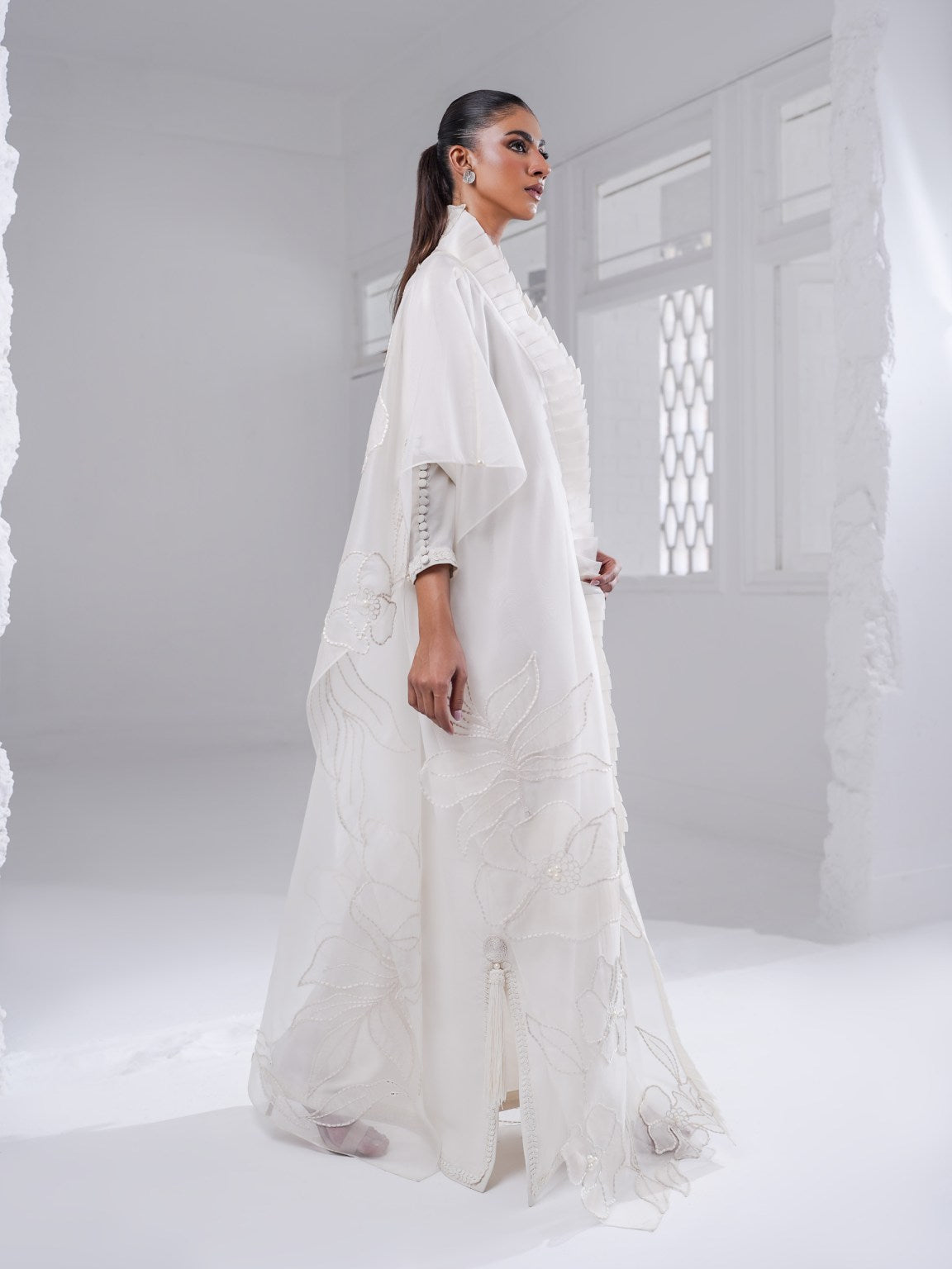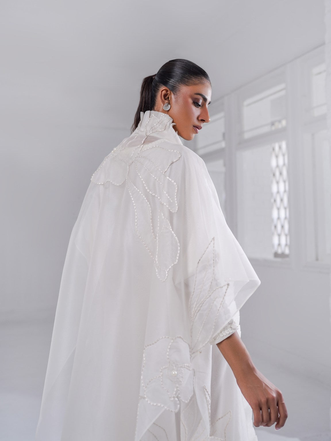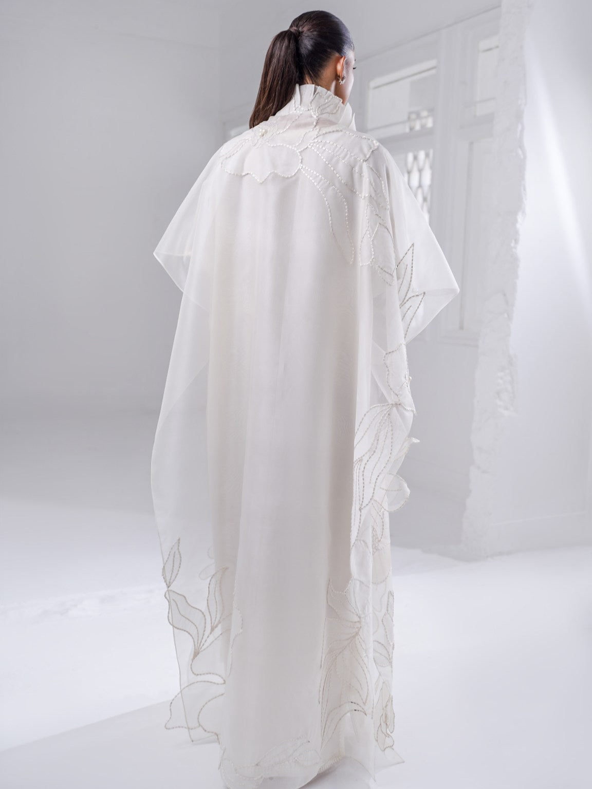 - Cape has elaborate 3d appliqué all over with a pleated neckline and hand-sewn pearls