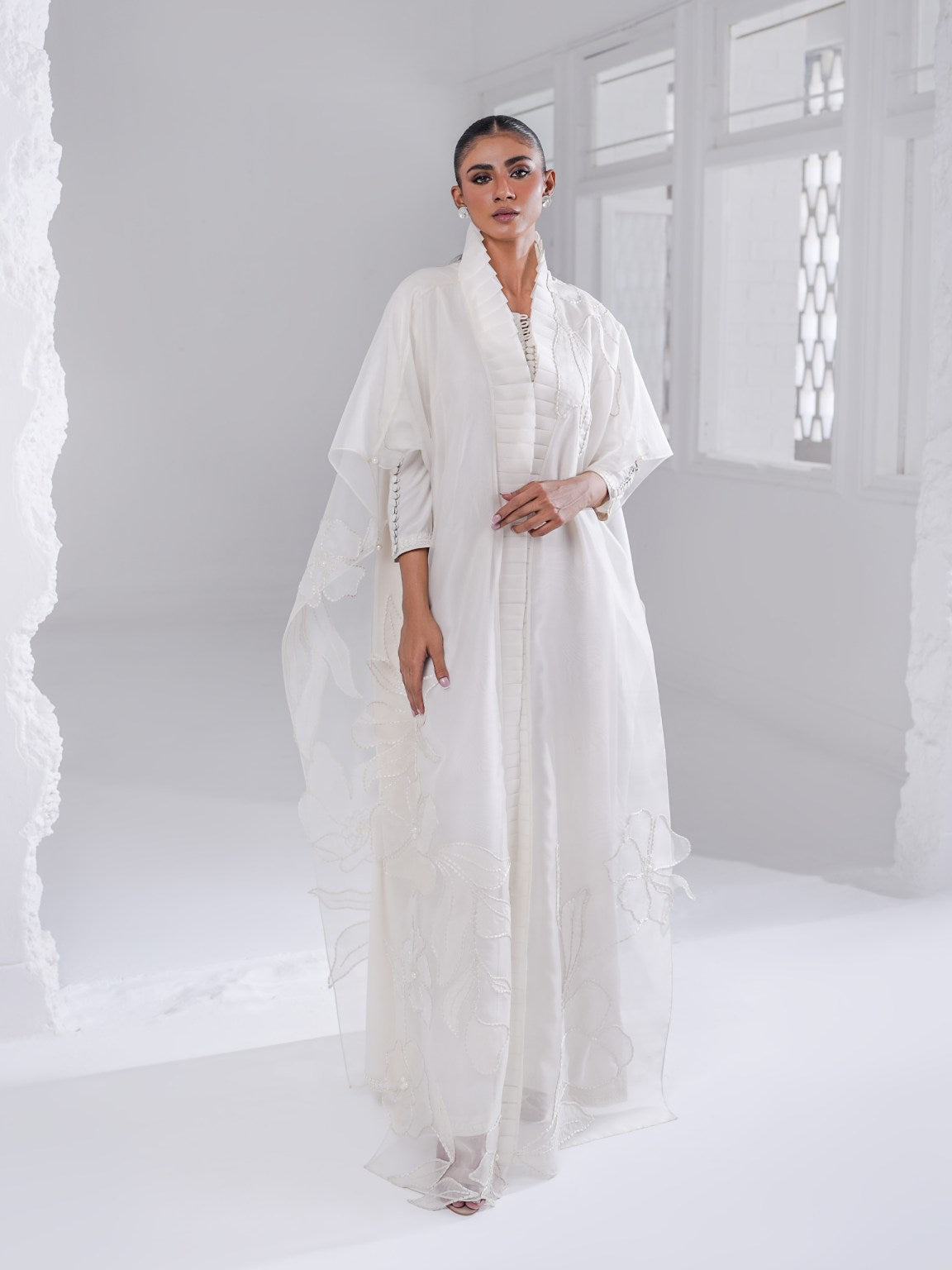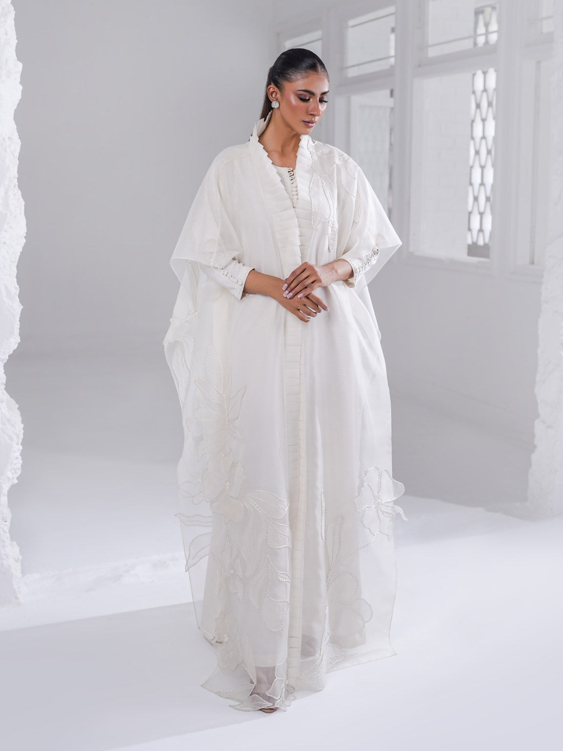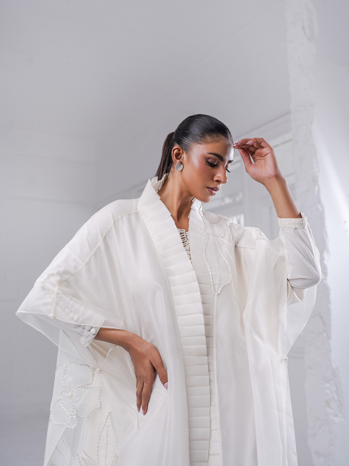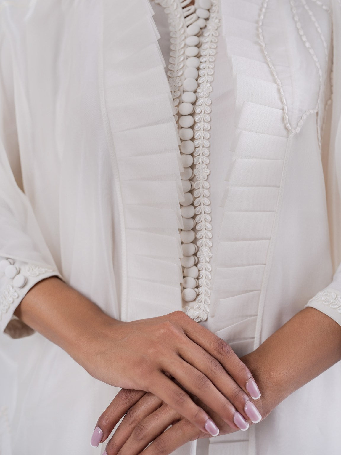 - Ivory inner kaftan finishes with lace, tassels and buttons on sleeves and neckline