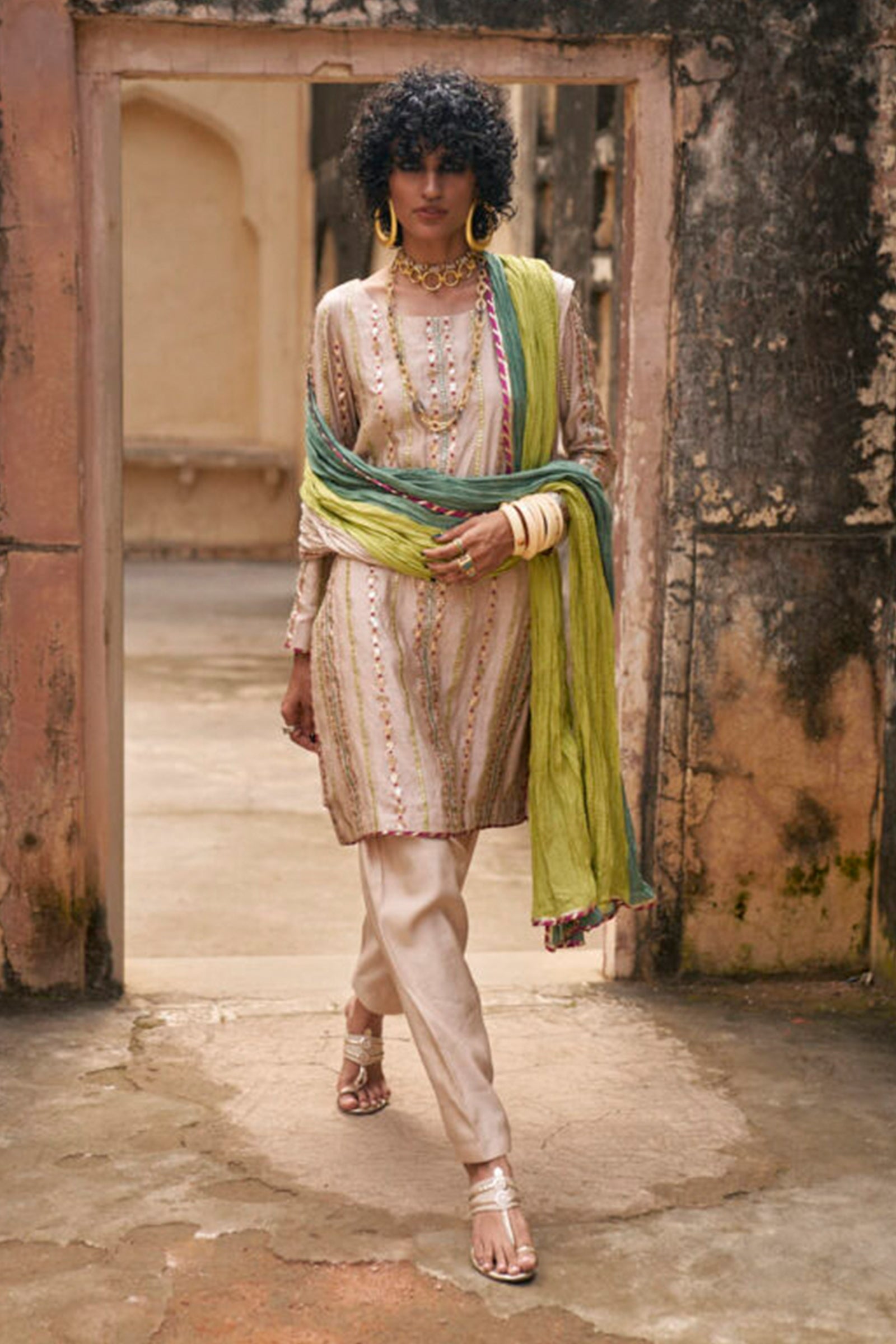 Shirt: Almond pink pure khaddi silk short shirt with vertical lines of gota and colourful thread work