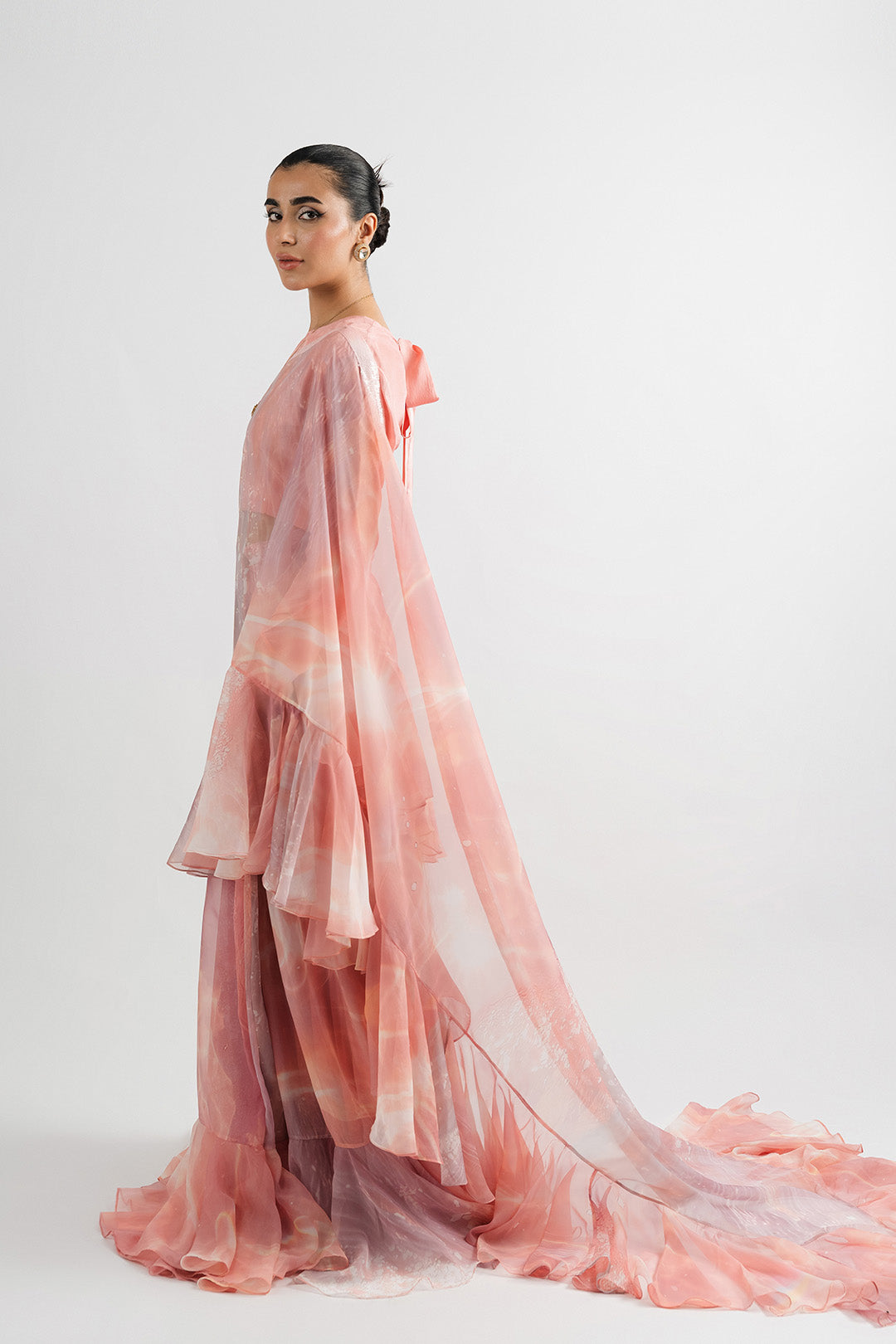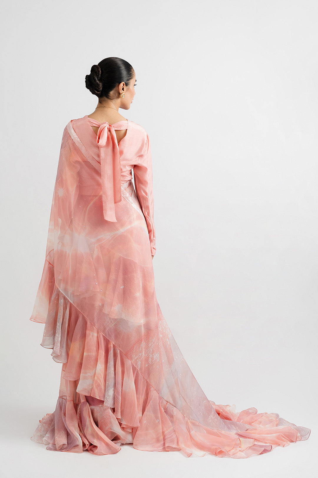 - This pink saree made in soft silk fabric in textured print features fixed pleats on the front, adjustable hook & eye closure on the waist belt, ruffle detail along the border. It comes with a pink viscose petticoat with an elasticated waist belt and flared hem.