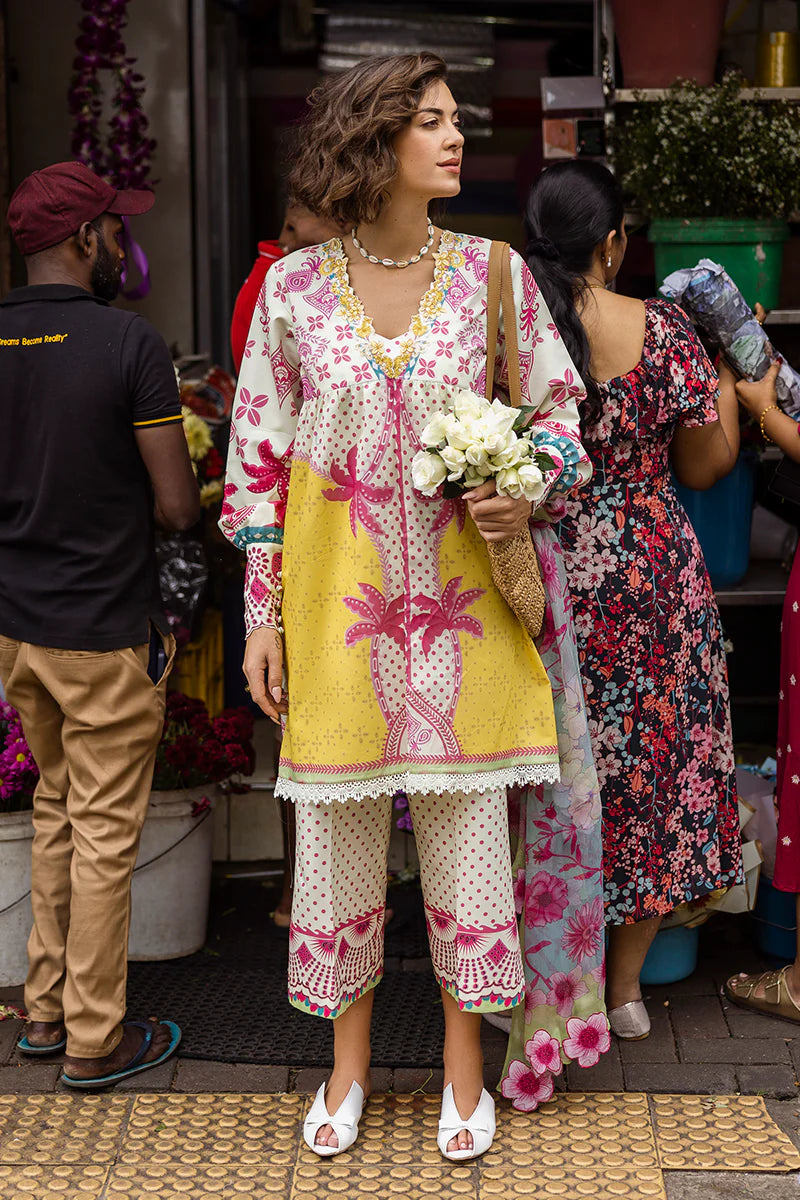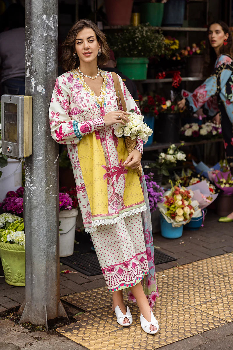 Printed Lawn Front Printed Lawn Back & Sleeves Embroidered Neckline (Organza) Crochet Lace for Daman Silk Buttons for Finishing