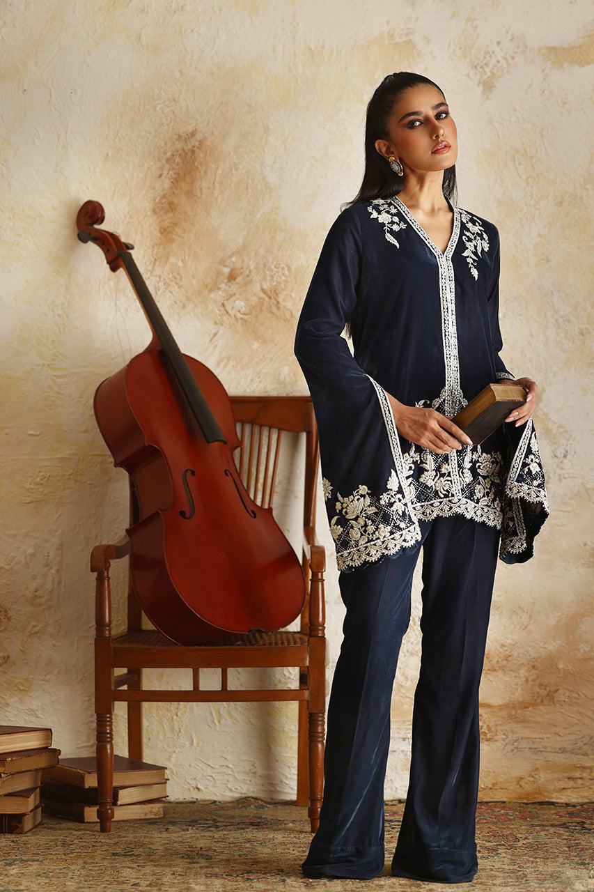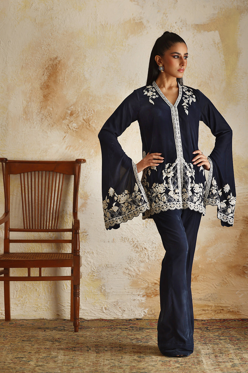 Exuding a sense of sophistication that transcends trends, the zardoze and resham meticulously embroidered daaman and dramatic bell sleeves take centre stage in this blue hued jacket cut from velvet. The rich texture and opulent appearance of velvet is amplified with kaamdaani alongside handwork. Paired with a matching velvet boot cut pant for an effortlessly festive feel.