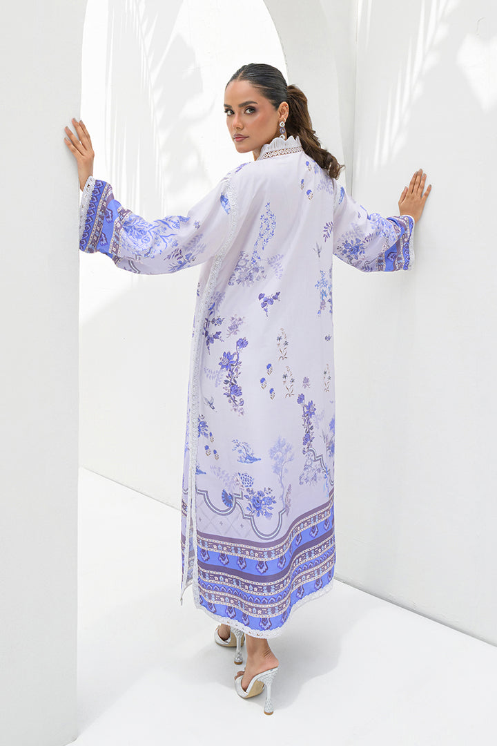 A pale blue/lilac khadi silk kurta is rendered with a nature inspired print. Featuring a pleated neckline and dotted with handworked 3D butterflies, this relaxed fit kurta is modern feminity redefined and a look that is unforgettable to behold!