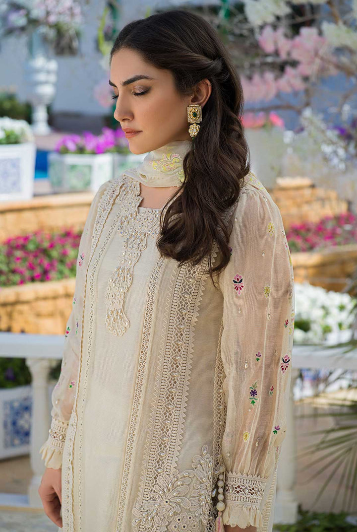 Detailed floral embroidery on an ivory silk karandi canvas in addition to lace separator and pearl sprinkle. Pair it with our signature N|F block printed & embroidered dupatta for that supremely elegant look.