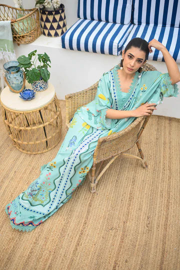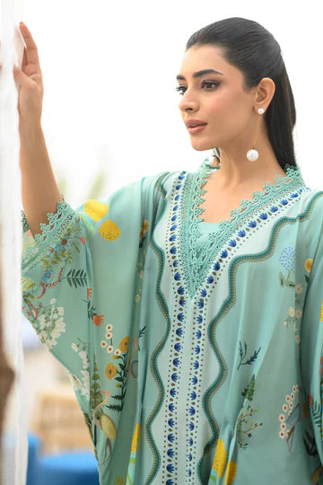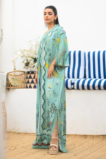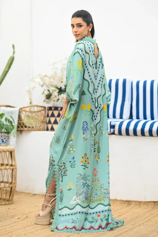 Turqoise Dance epitomises uninhibited luxury and effortless charm. A multi colour floral print, intricately composed on a turqoise base, amplifies the relaxed fit pure crepe kaftan.