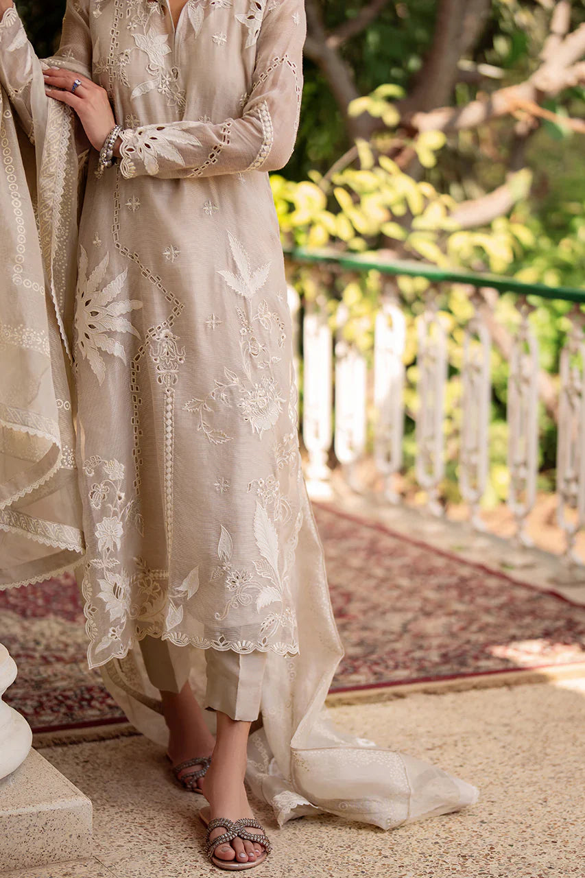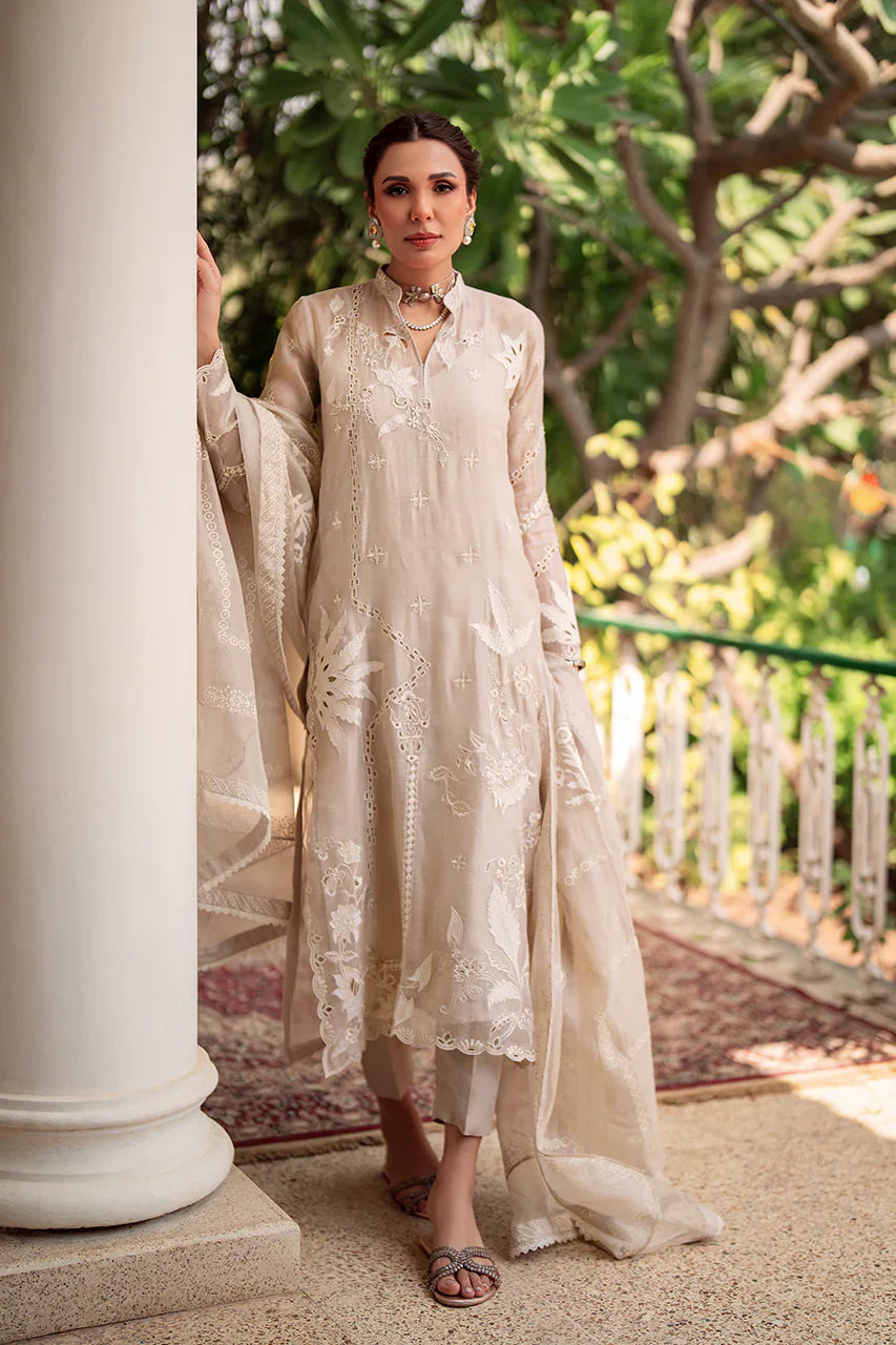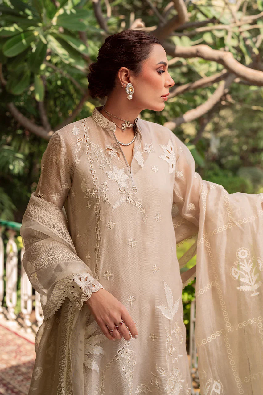 A muted beige silk karandi shirt, 'Amika' is embellished with delicate tonal embroidery, cutwork, and applique accents. It is paired with a statement block printed dupatta and matching pants to complete the timeless look.