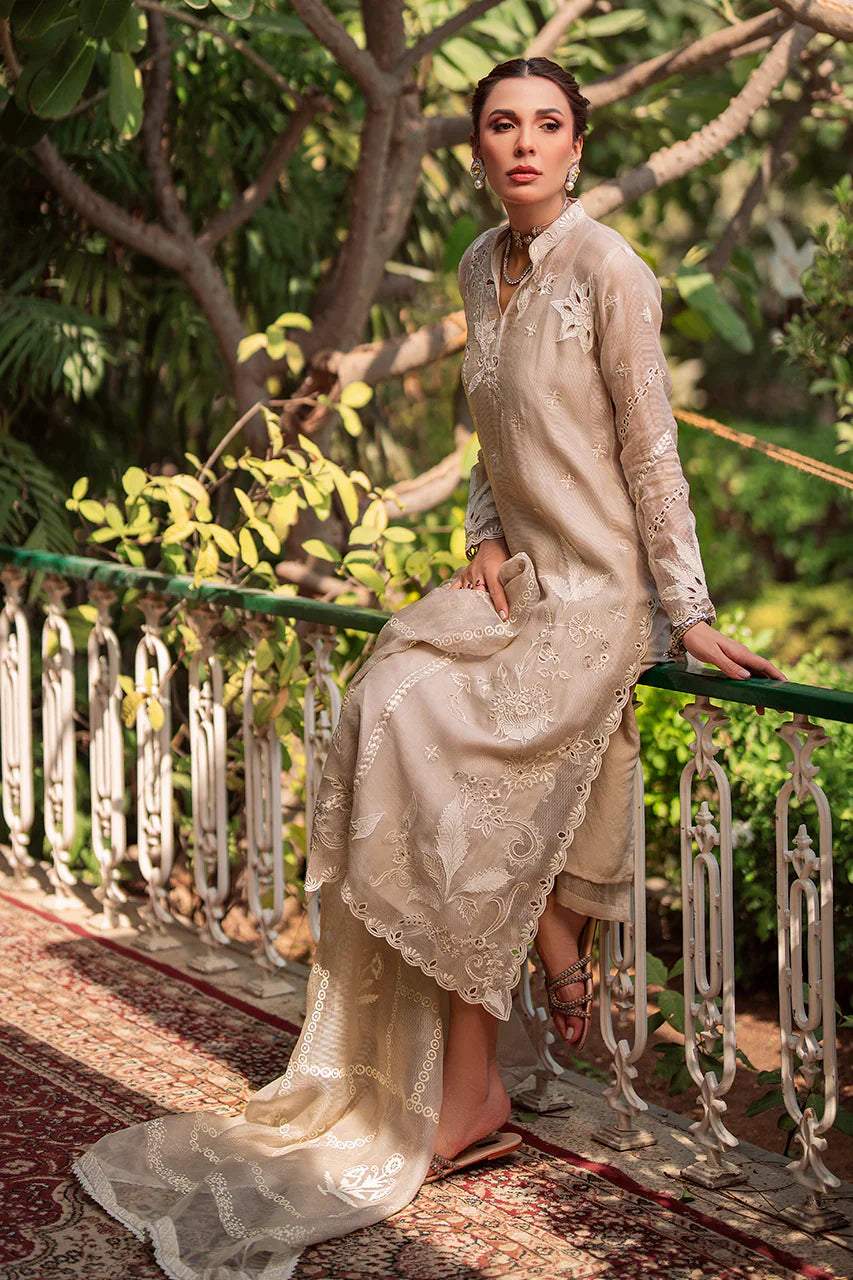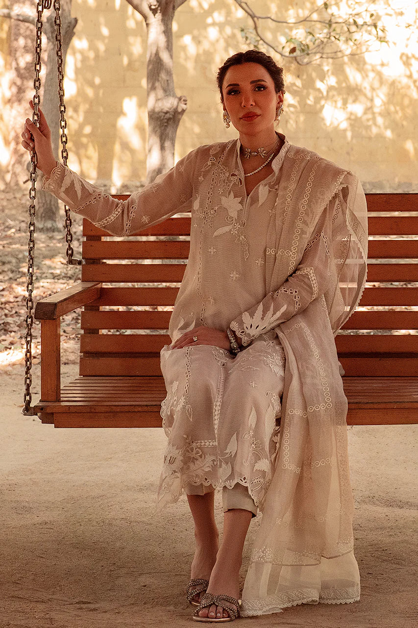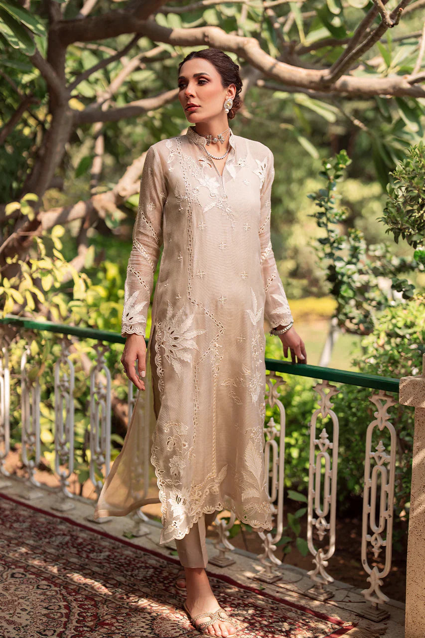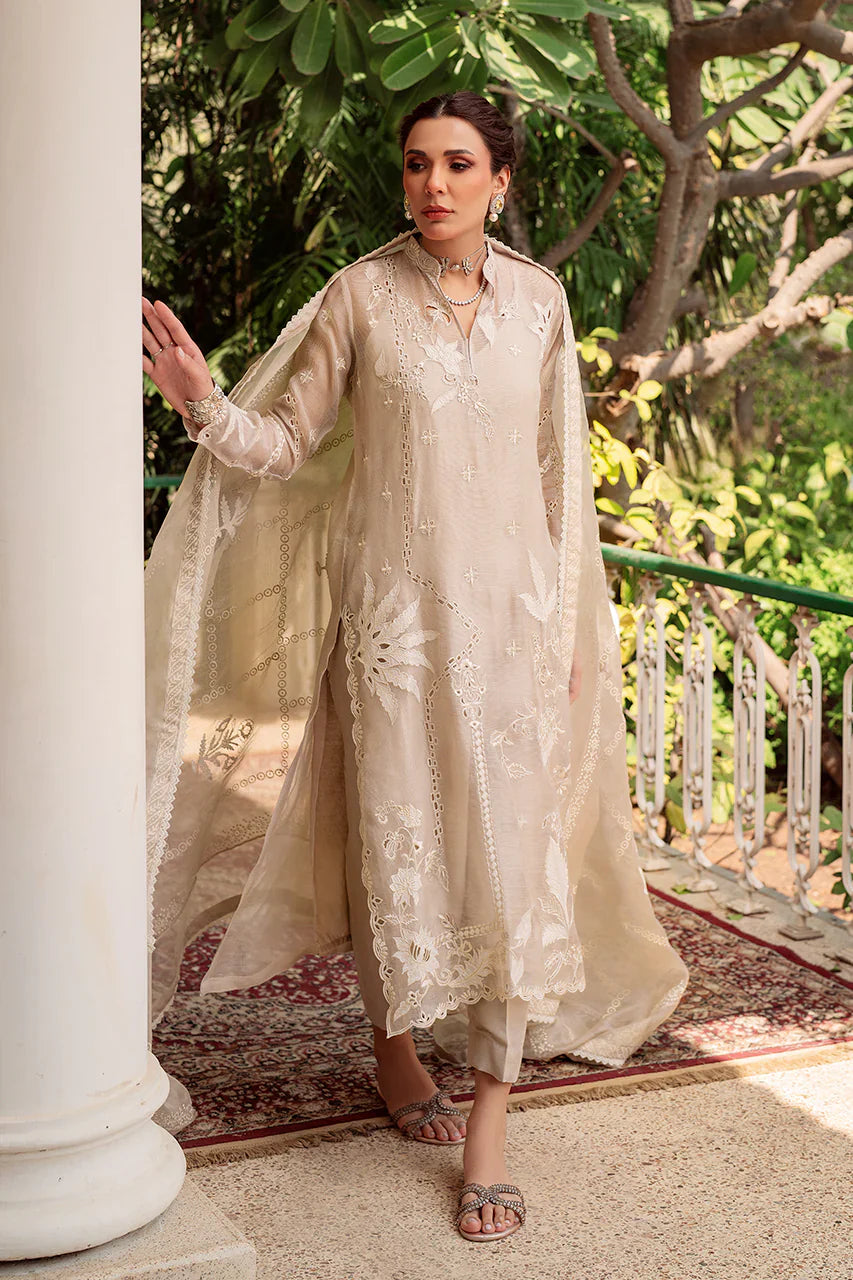 A muted beige silk karandi shirt, 'Amika' is embellished with delicate tonal embroidery, cutwork, and applique accents. It is paired with a statement block printed dupatta and matching pants to complete the timeless look.