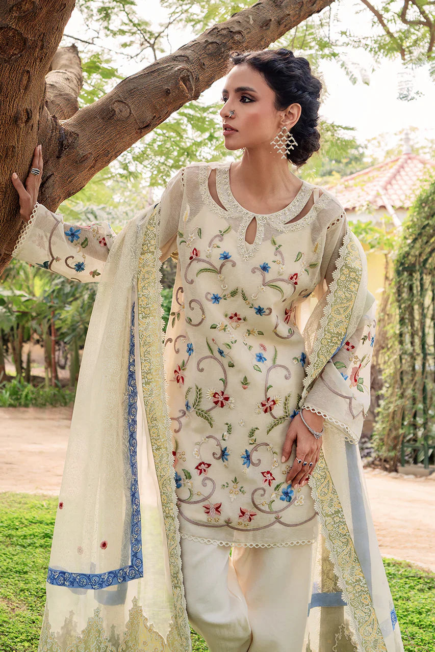 A muted beige silk karandi shirt, 'Amika' is embellished with delicate tonal embroidery, cutwork, and applique accents. It is paired with a statement block printed dupatta and matching pants to complete the timeless look.