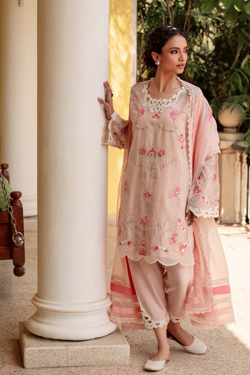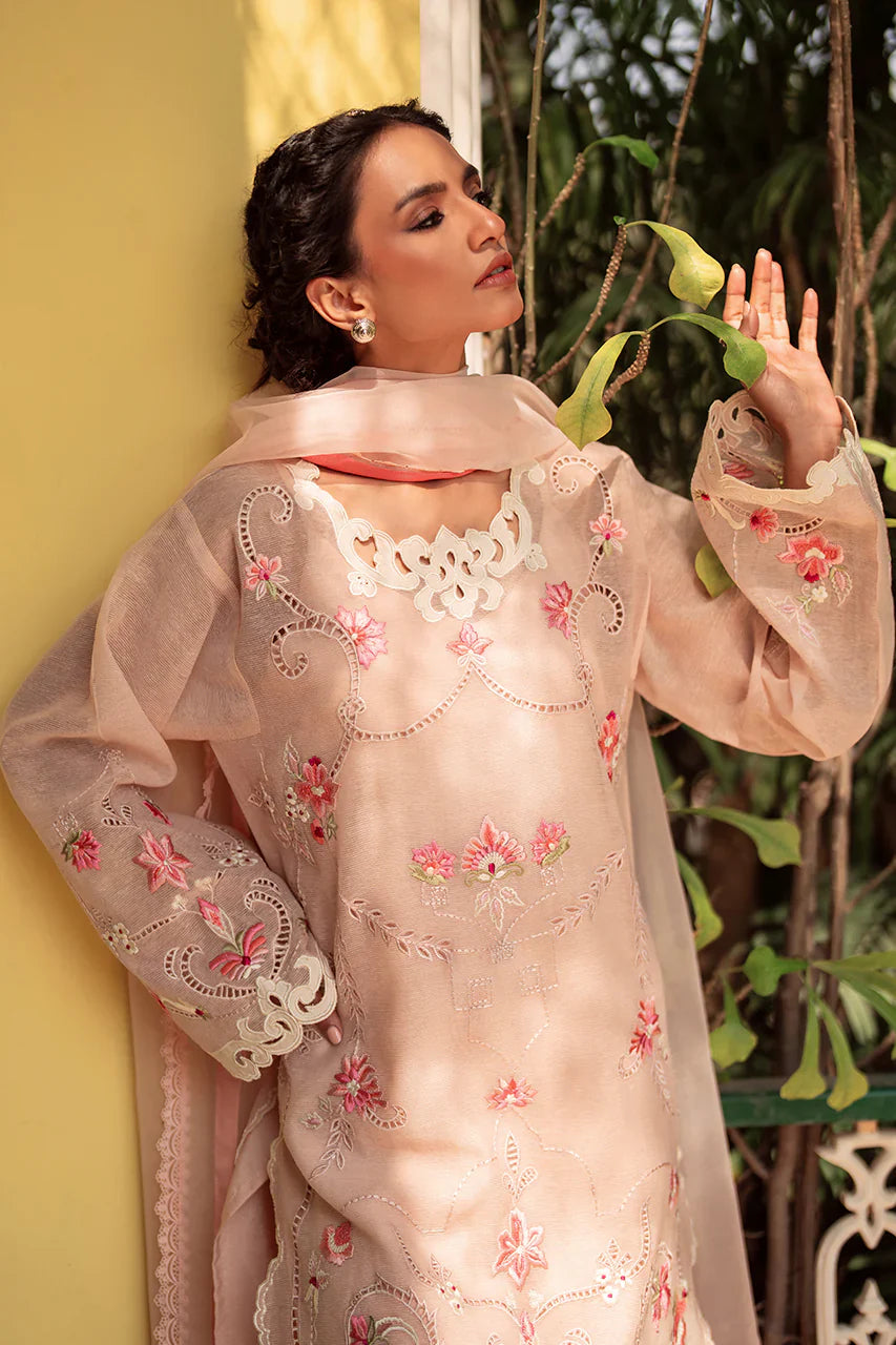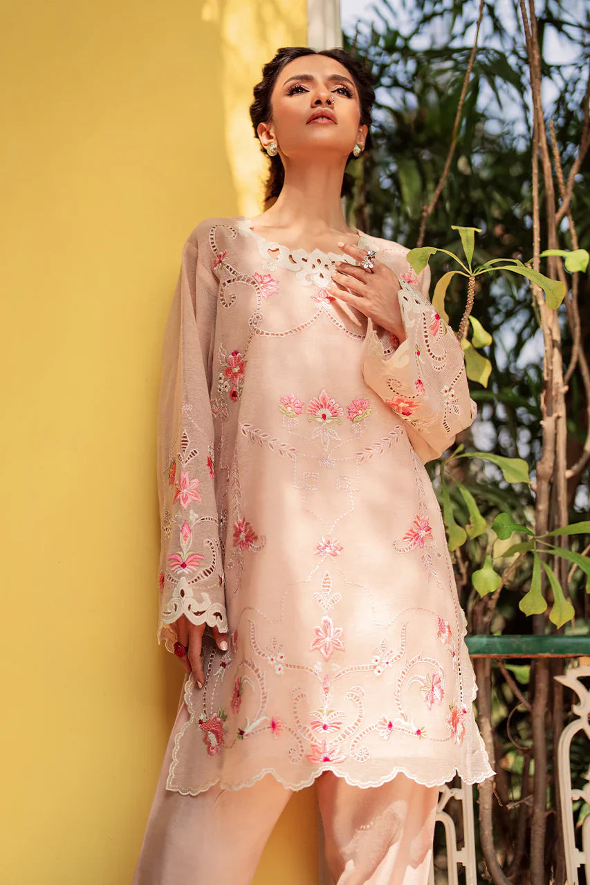 Classic & elegant, 'Fanoos' is a sight for sore eyes. The short shirt is artfully embroiderd with pastel florals and intricate cutork. The defining neckline in applique completes the look. Pair it with a colour block organza dupatta, for a head turning look this season.