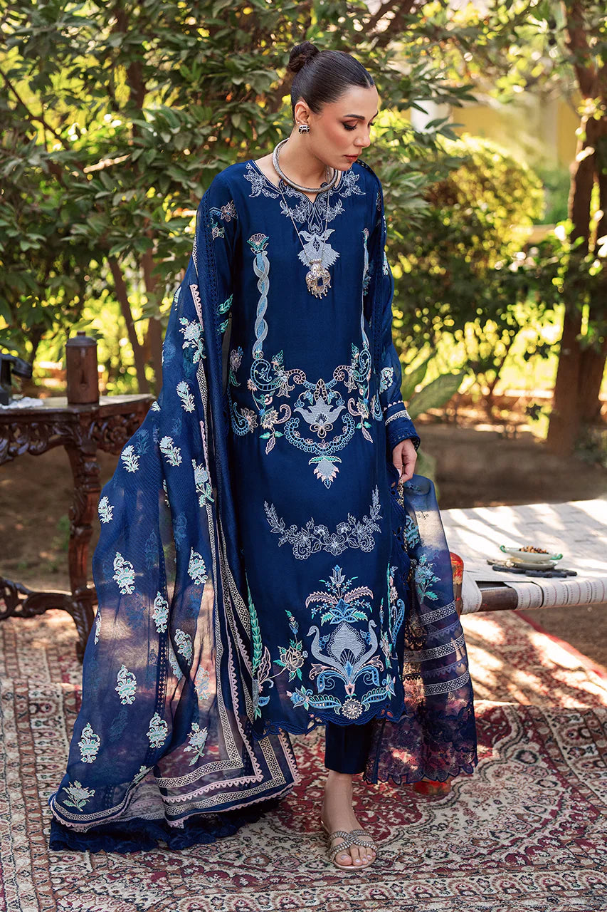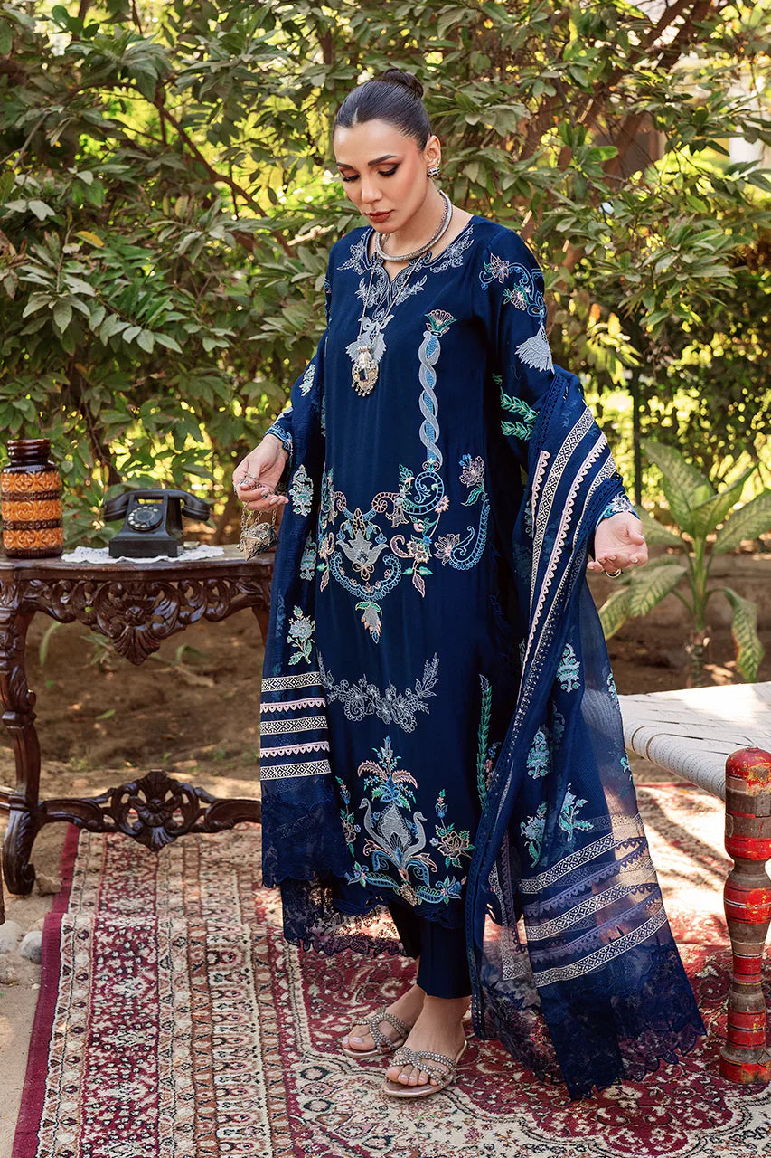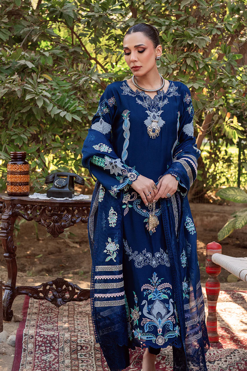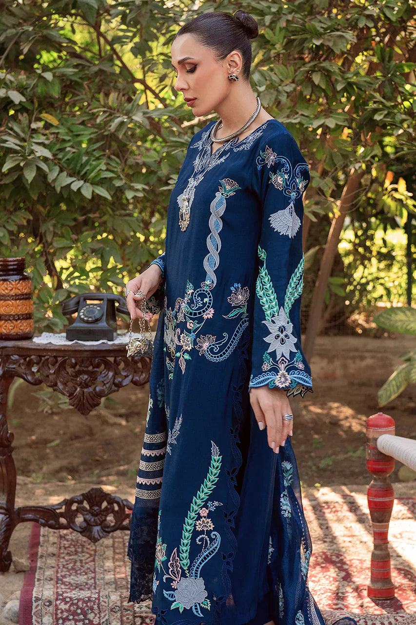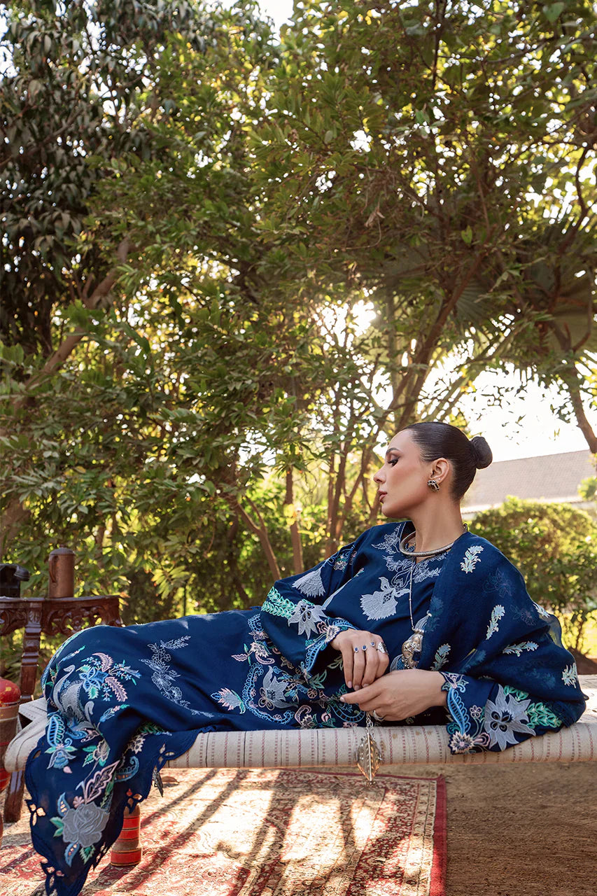 Pernia' exudes effortless luxury, with its cascading block printed dupatta and and a sweeping khaadi silk shirt. This navy blue canvas is exquisitely embroidered with intricate applique, resham & cutwork. Pair it with a matching pant for a classy look.