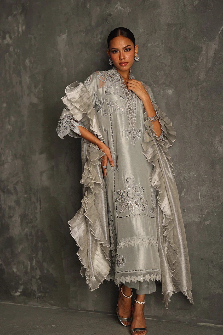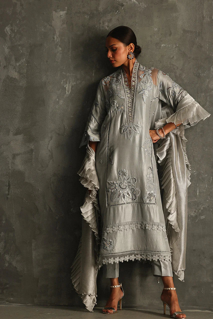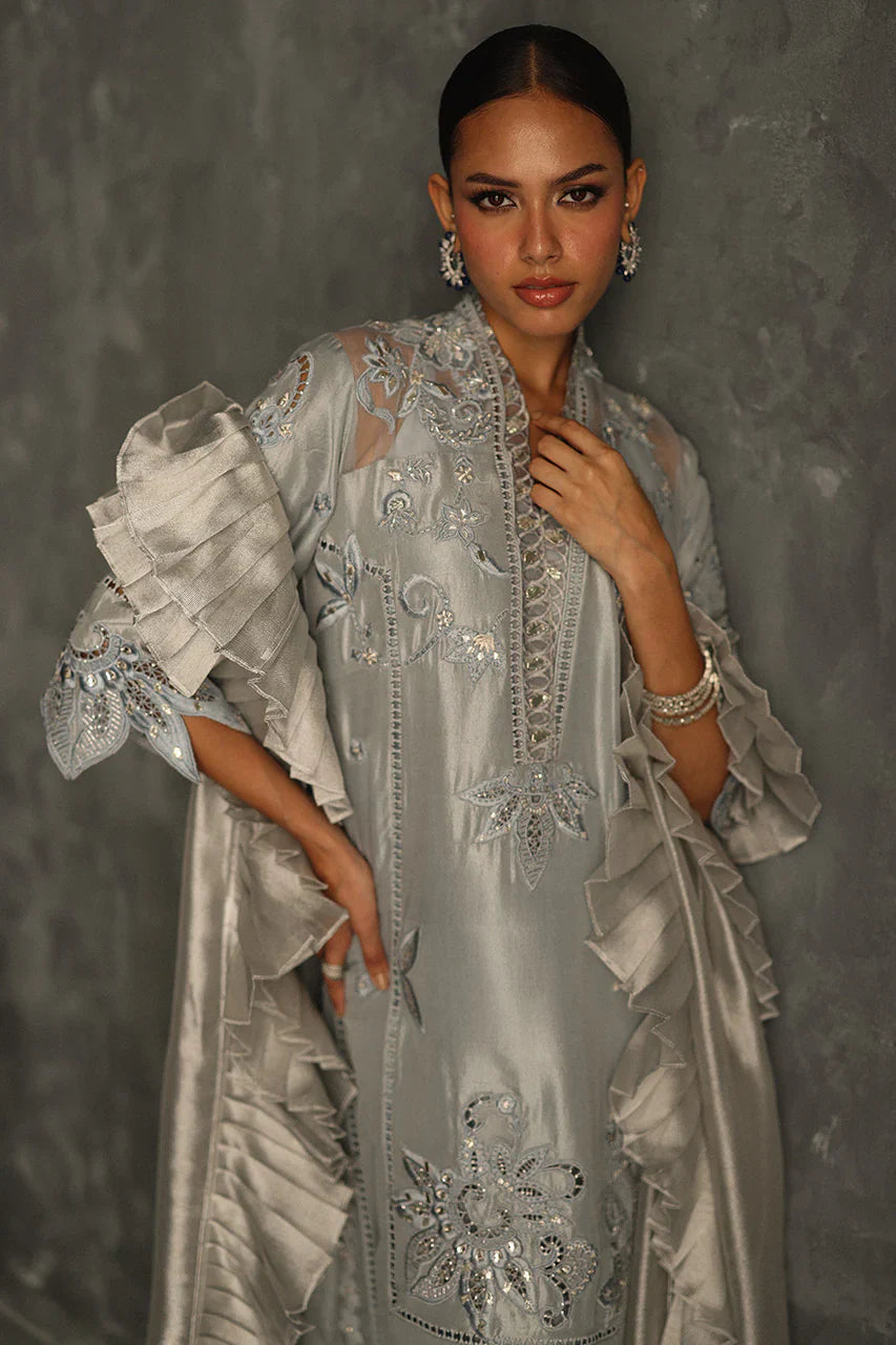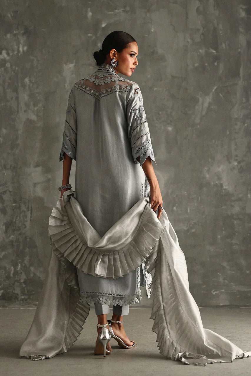 This is 'eclat' - an outfit that defines grace and opulence all at once! There is a quiet harmony in balance , a beautiful symphony at play in this stunning A-line canvas. The intricate amalgamation of embroidered blooms, cutwork, zardozi & gotta speaks of immaculate craftsmanship that sparkles thru on this gray shirt. Add royalty to this artistry with a well-defined lace encrusted neckline dotted with kamdaani! A subtle contrasting meysuri dupatta with pleat details adds a modern touch to this showstopping outfit!