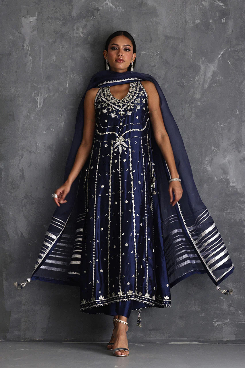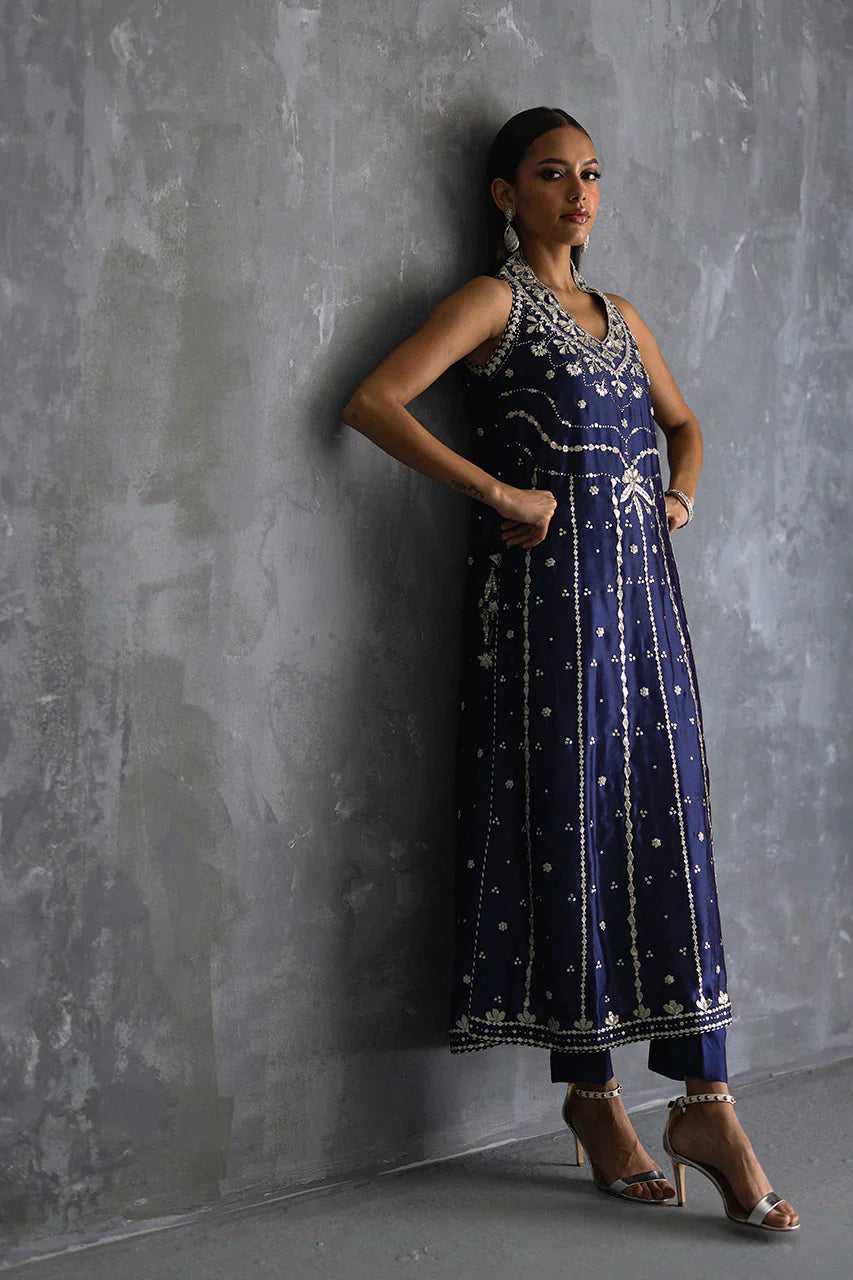 In the finest electric blue silk, this long A-line shirt cascades in liquid pleats! The neckline is strewn with kamdaani trellises and gotta work which is amplified with gotta lines along the shirt front. 3D tassels accent the slide slits, catching the light with every step. A statement back, illuminated with zardoze brings a touch of quiet opulence! A gotta encrusted organza dupatta completes the look!