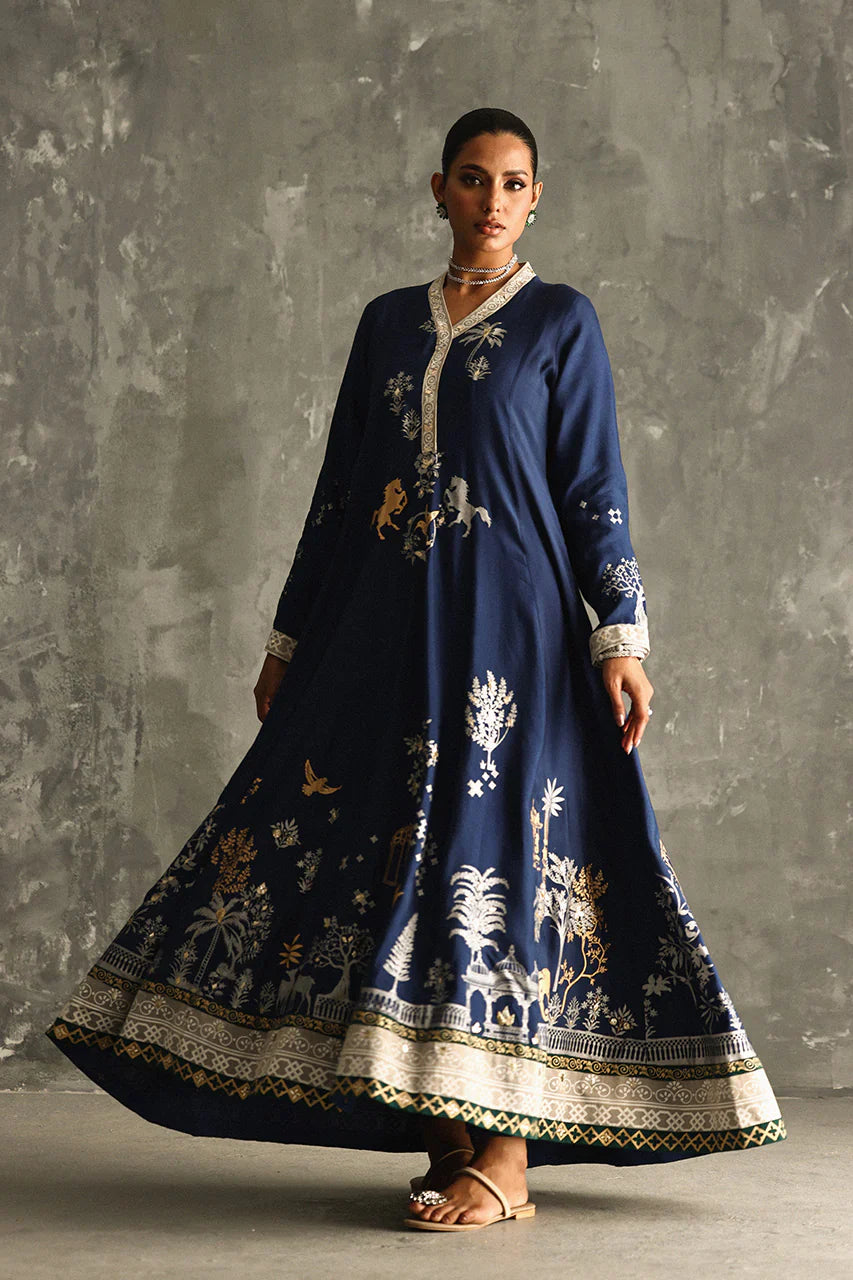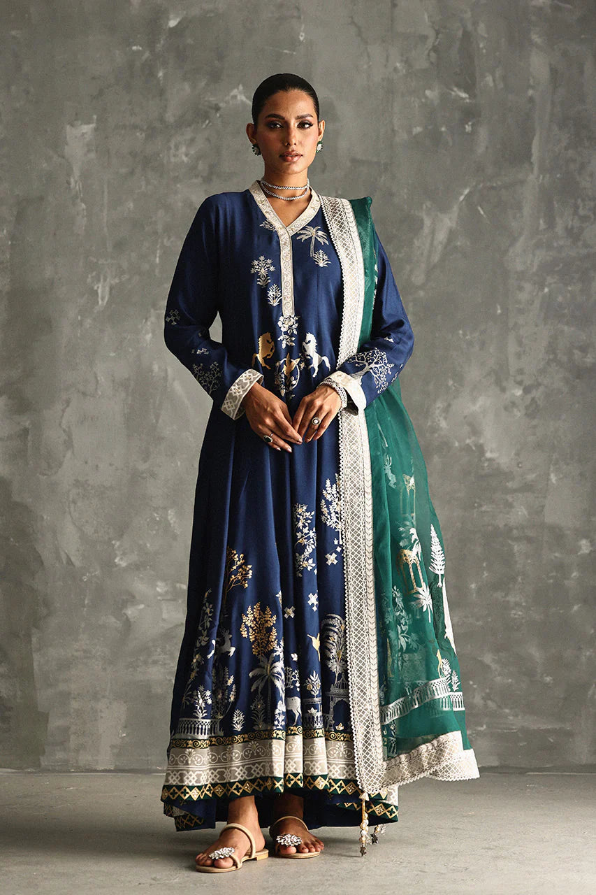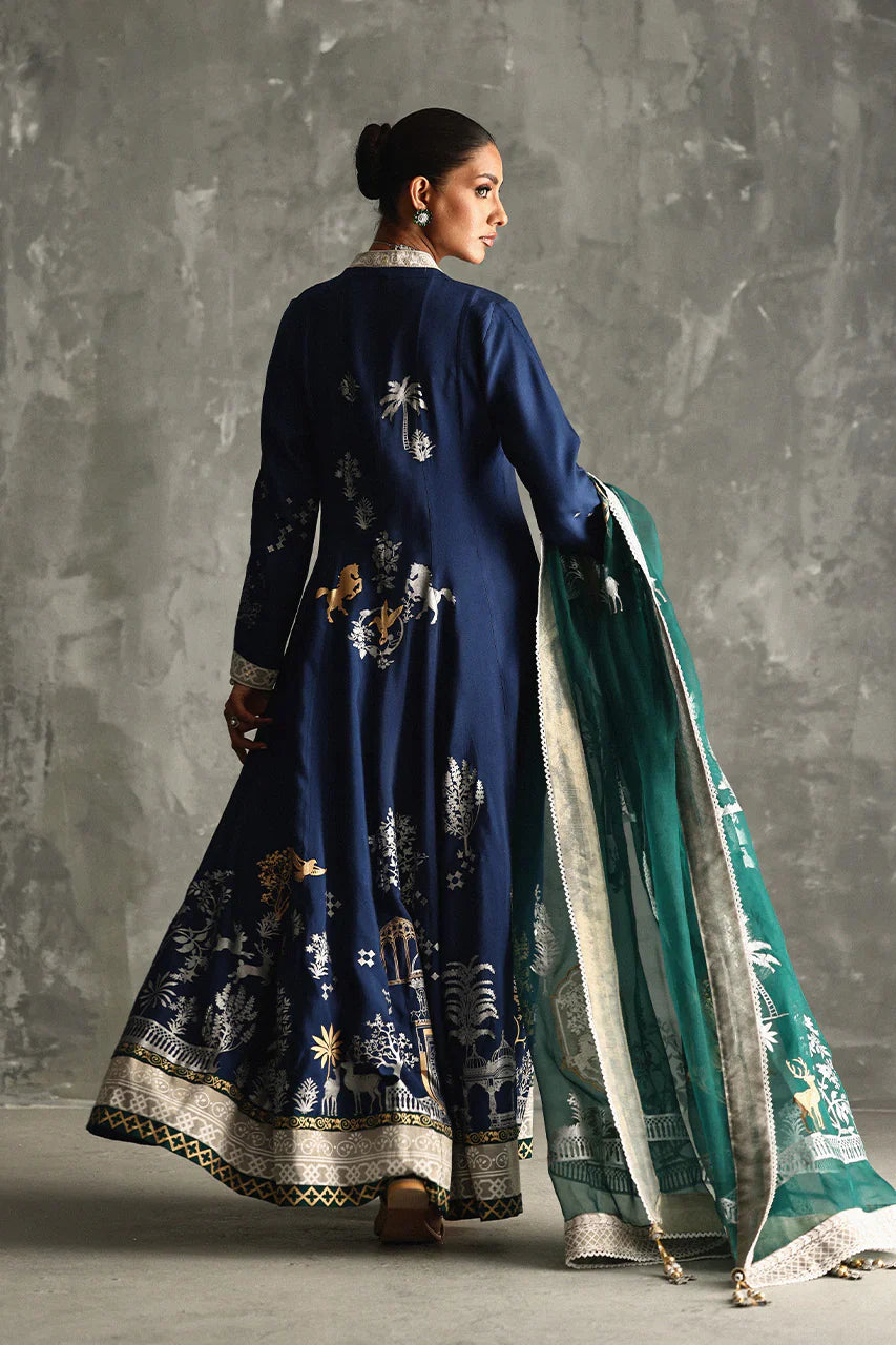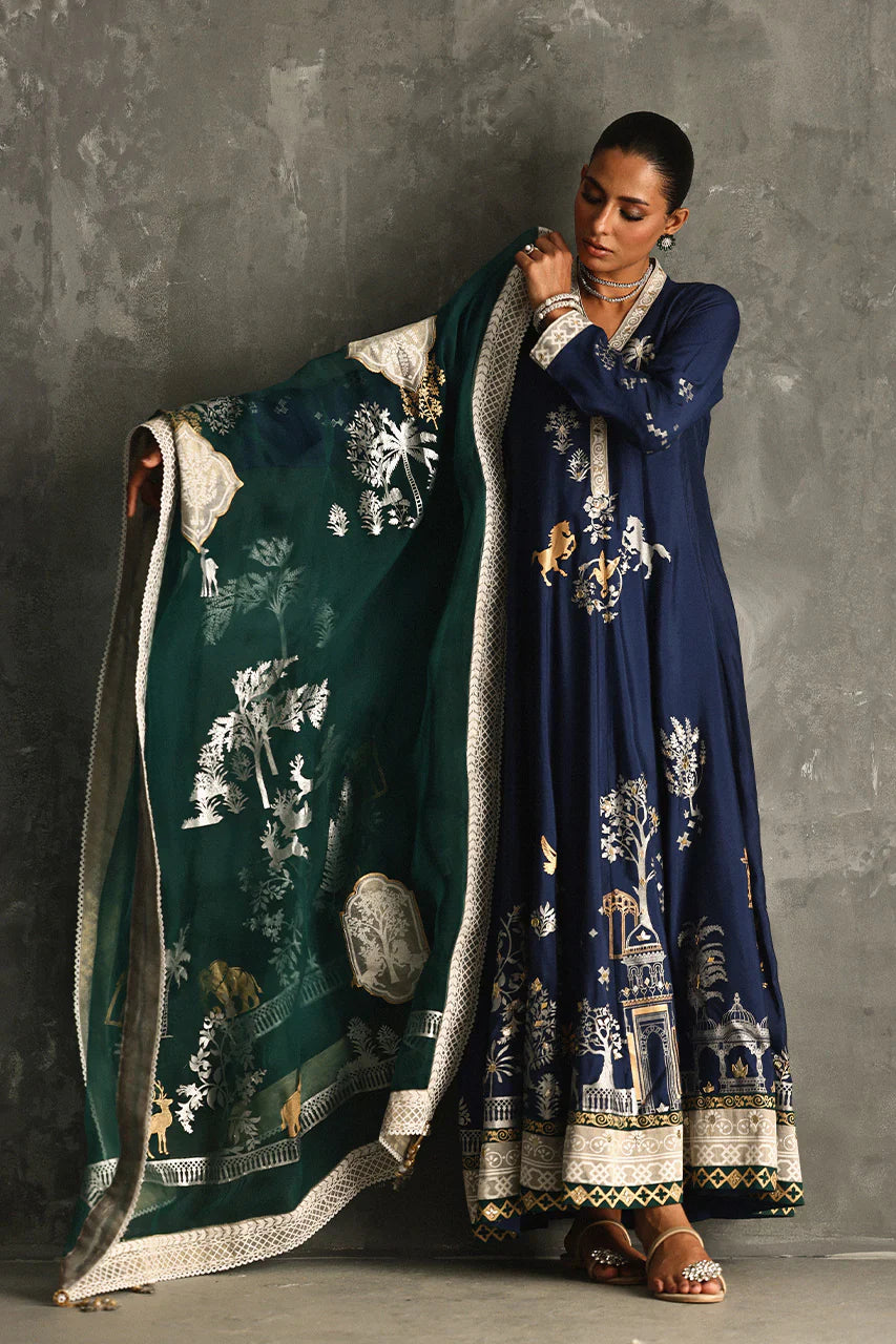 Experience the enchanting beauty of 'Sila' - a meticulously crafted kalidaar exuding elegance with its captivating navy khaadi silk canvas. The distinctive screen print is inspired by mughal architecture and is complimented by contrasting borders on the daaman. Gotta sprinkle along the ghair and a contrasting patchwork screen print dupatta make the outfit a festive favourite!