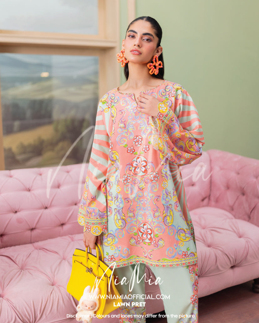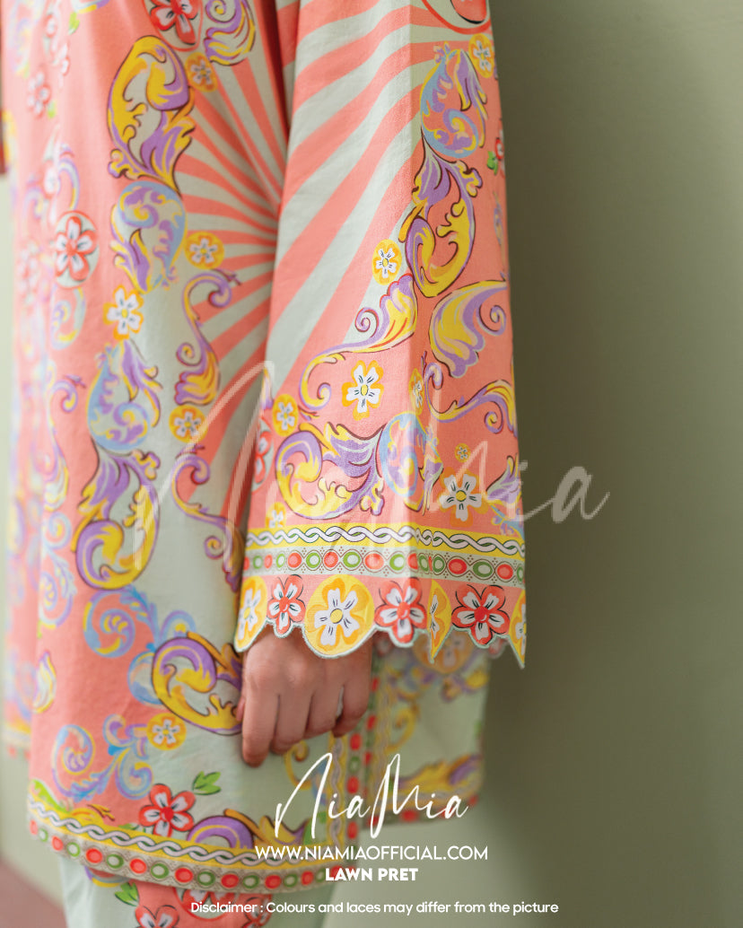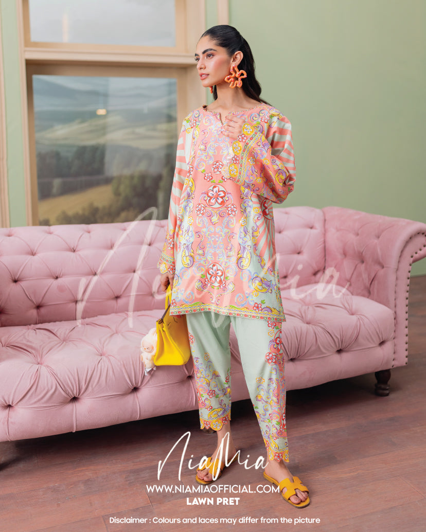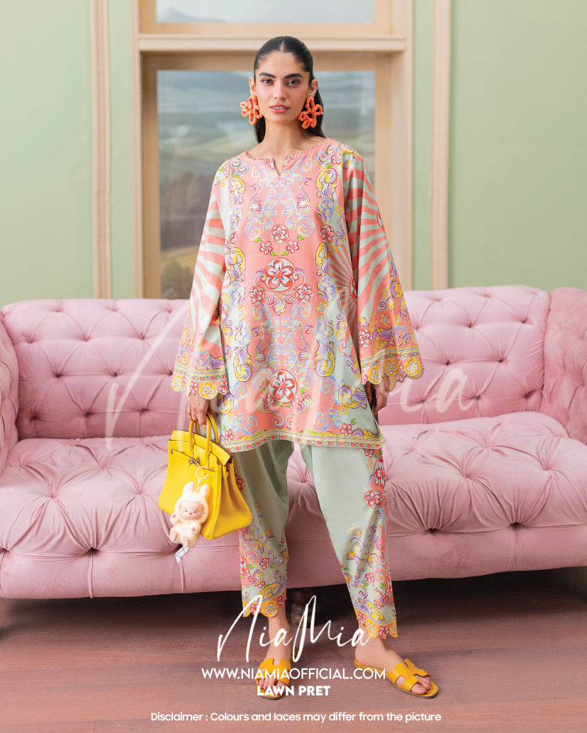 A two-piece printed set on a fresh mint green base, brought to life with coral, lilac, and yellow floral motifs. The neckline is finished with delicate knot detailing, while scalloped cutwork adorns the sleeves for a light, summery finish. Paired with a matching printed shalwar for an airy yet refined look.