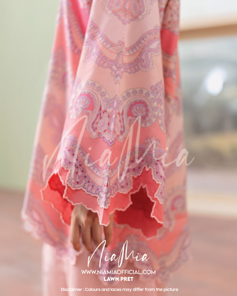 A two-piece printed set in soft shades of pink with delicate tonal motifs. The collared neckline adds a tailored touch, while cutwork embroidery details the sleeves and shirt hem. Paired with a flowing farshi shalwar for an elegant yet relaxed summer look.