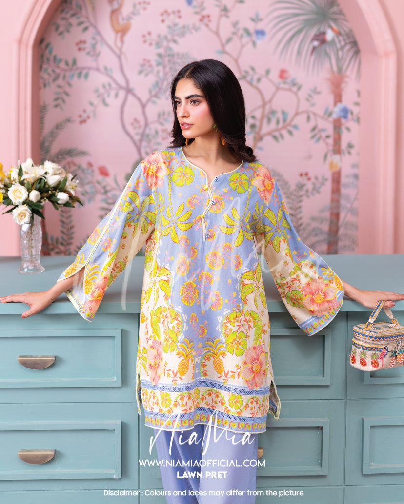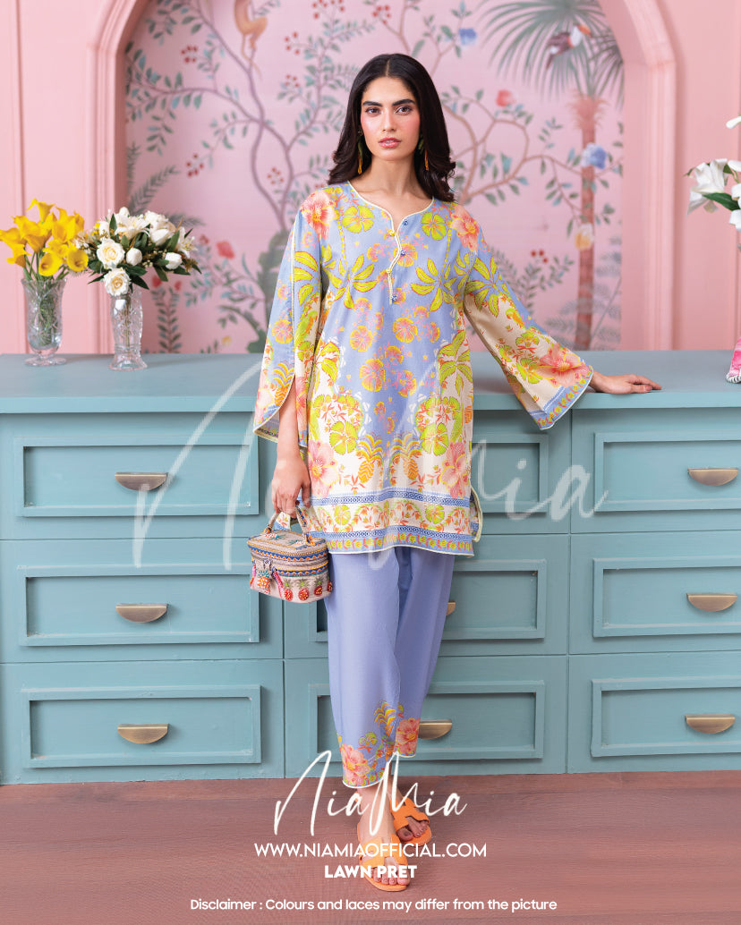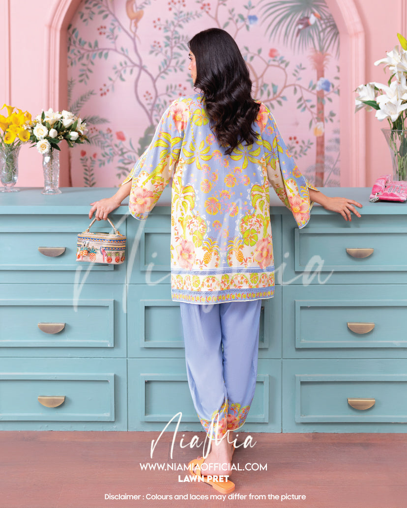 A two-piece printed set in soft periwinkle, accented with shades of green and coral. The wavy neckline is finished with dainty buttons for a touch of charm, while straight sleeves keep the look clean and polished. Paired with a printed shalwar for understated everyday elegance.