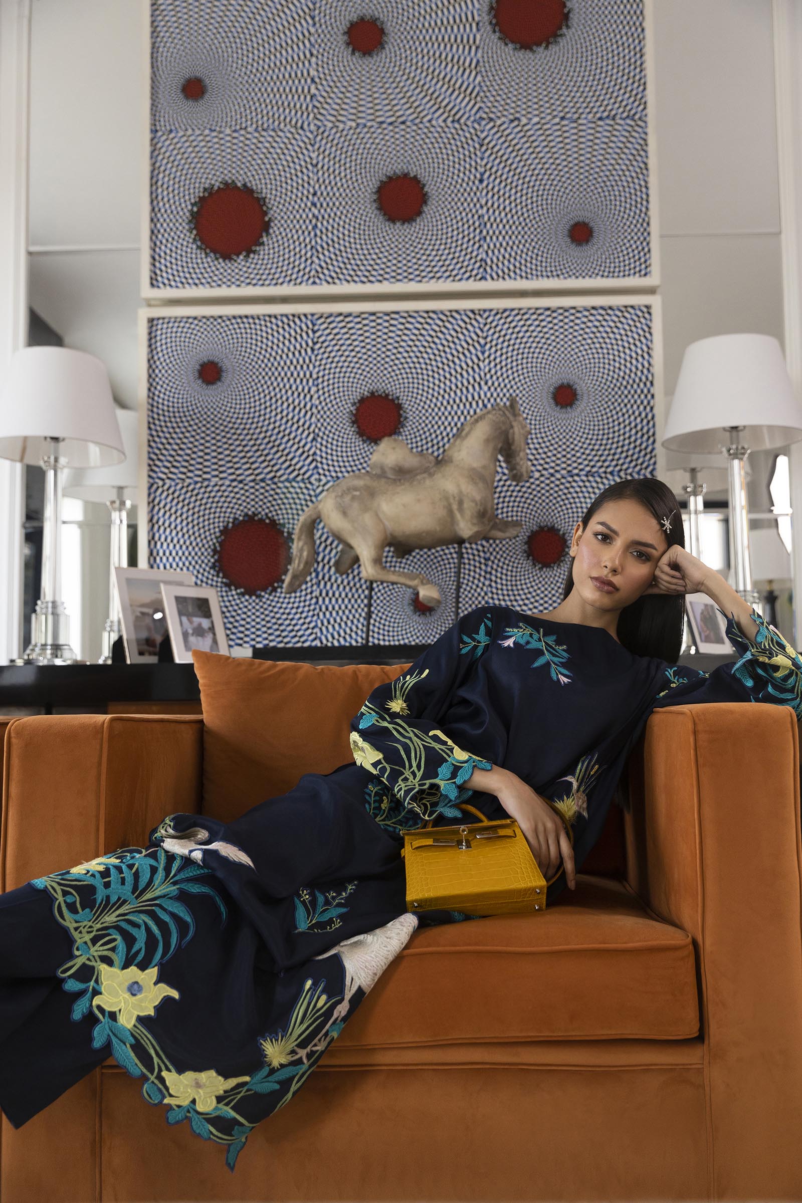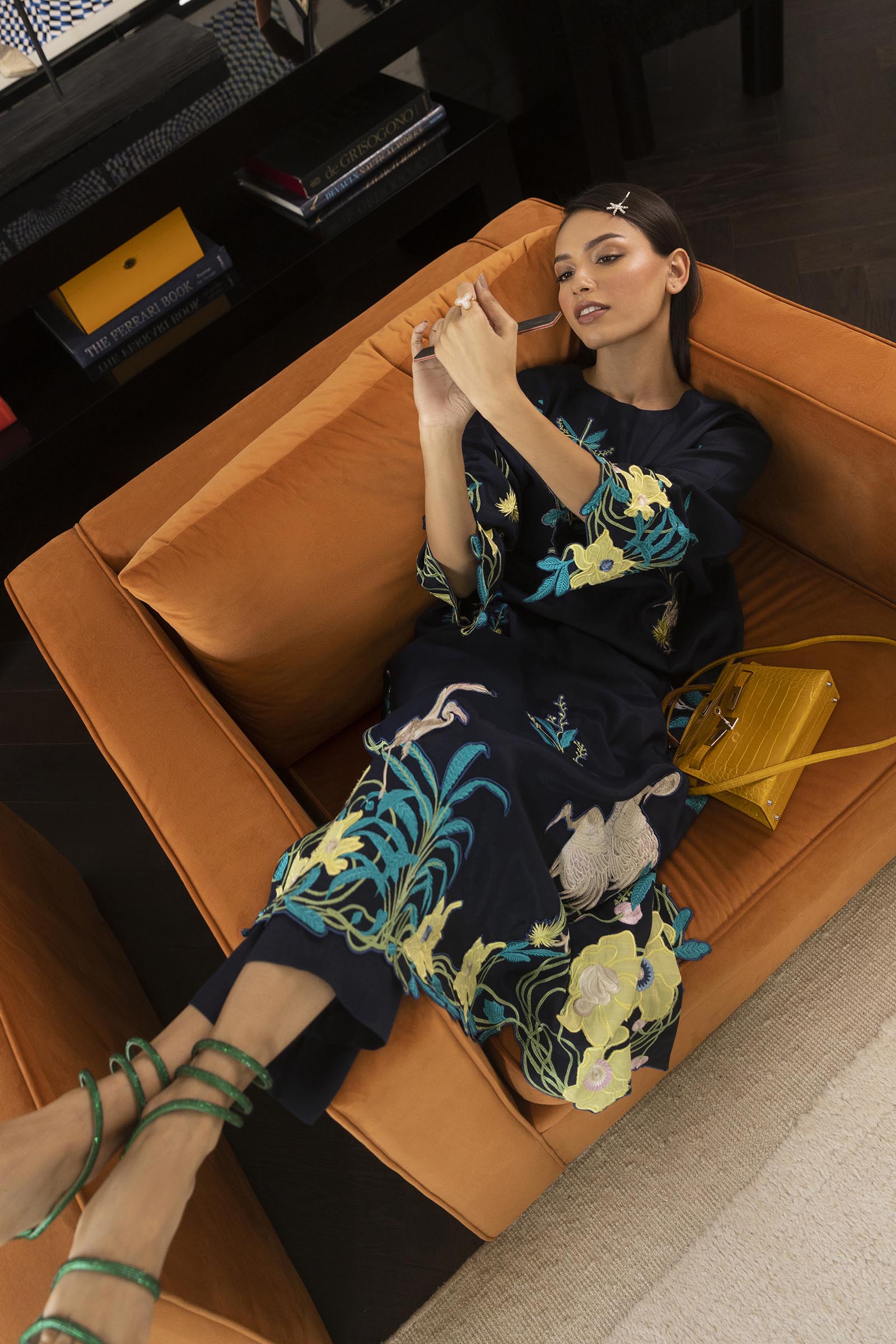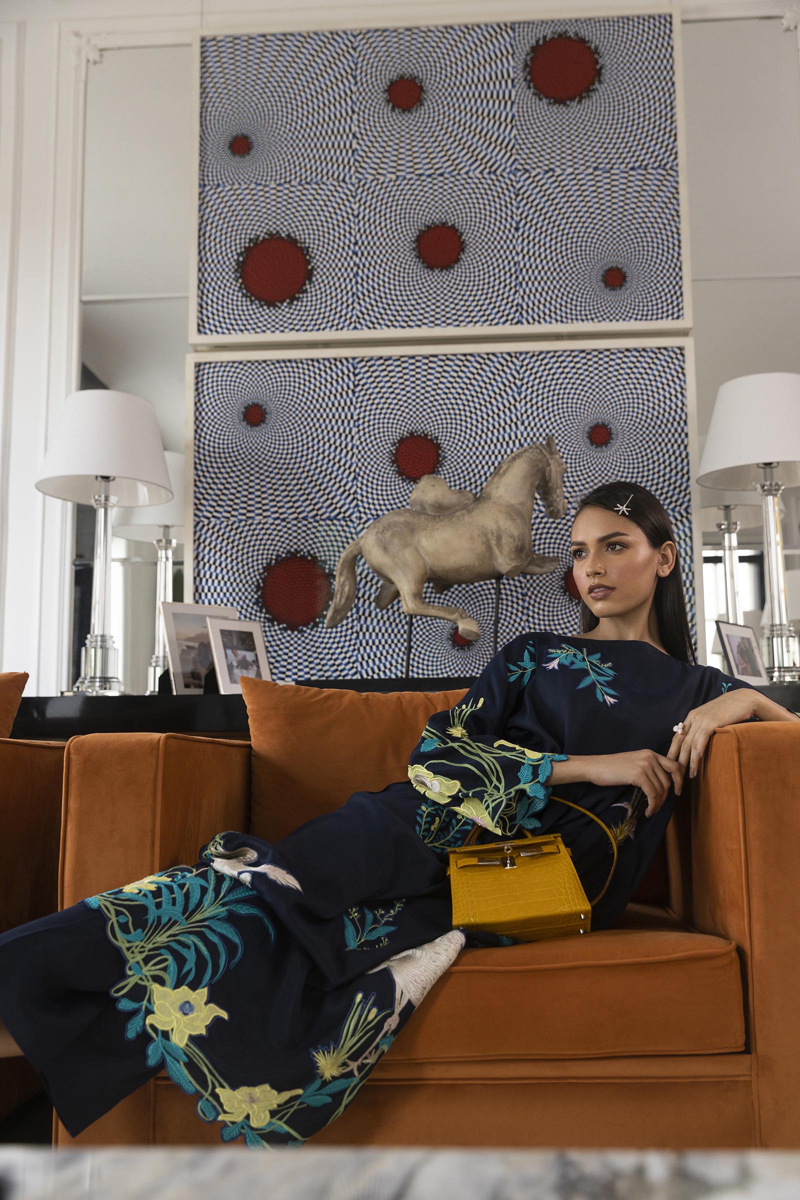 Description: A navy blue raw silk look with timeless structure — effortlessly refined with modern charm.