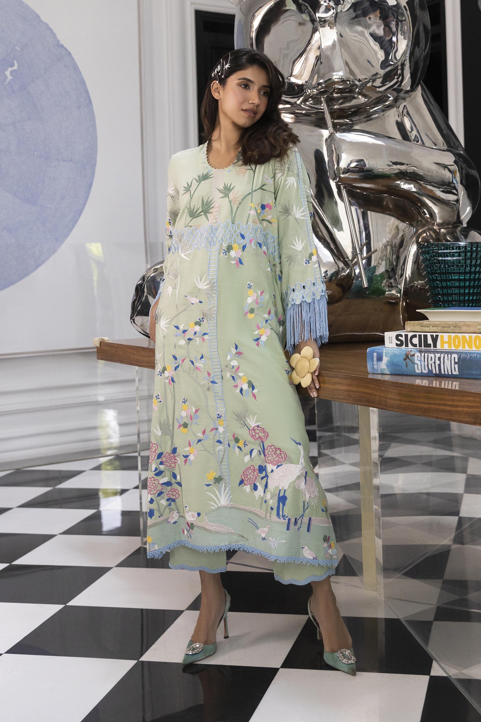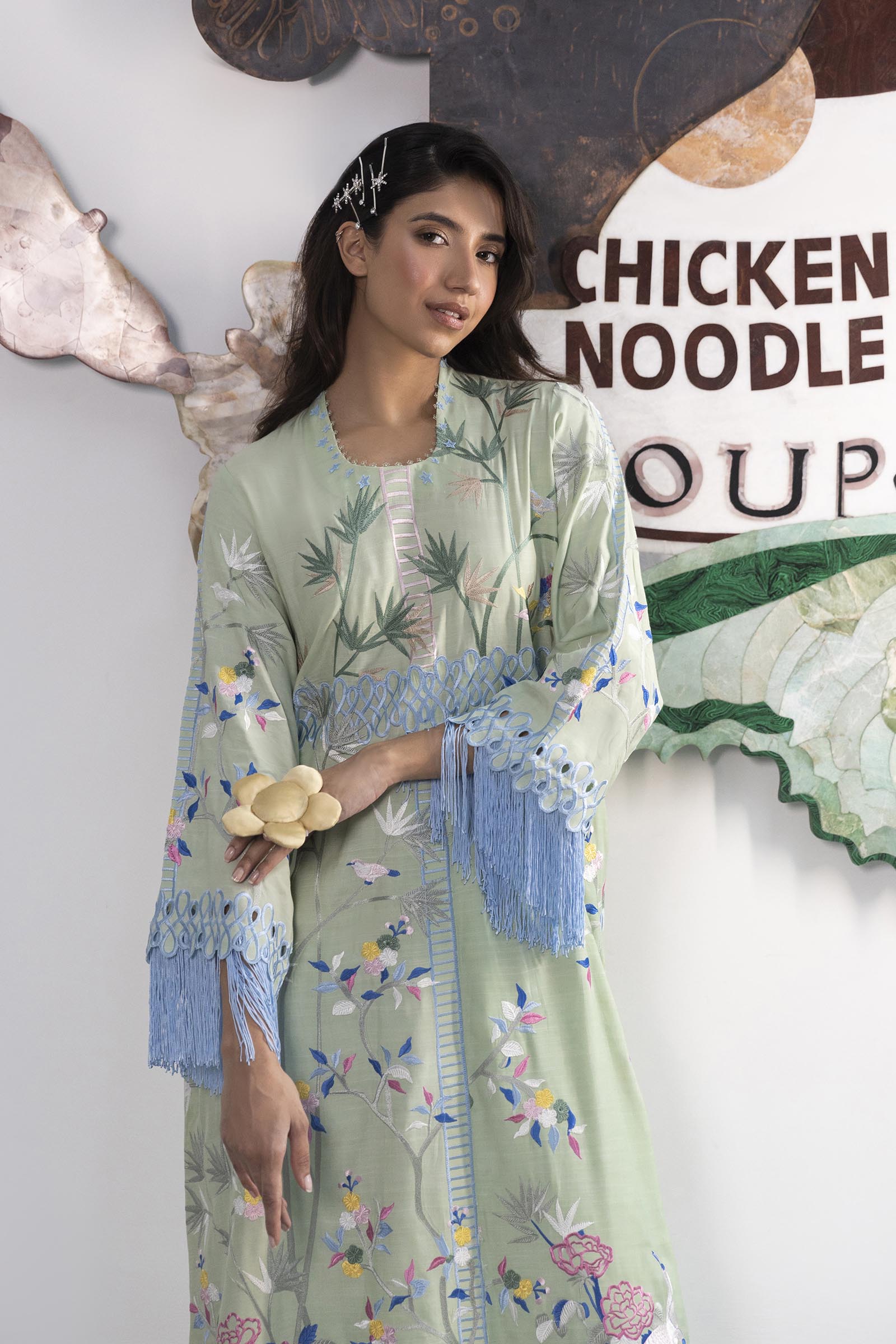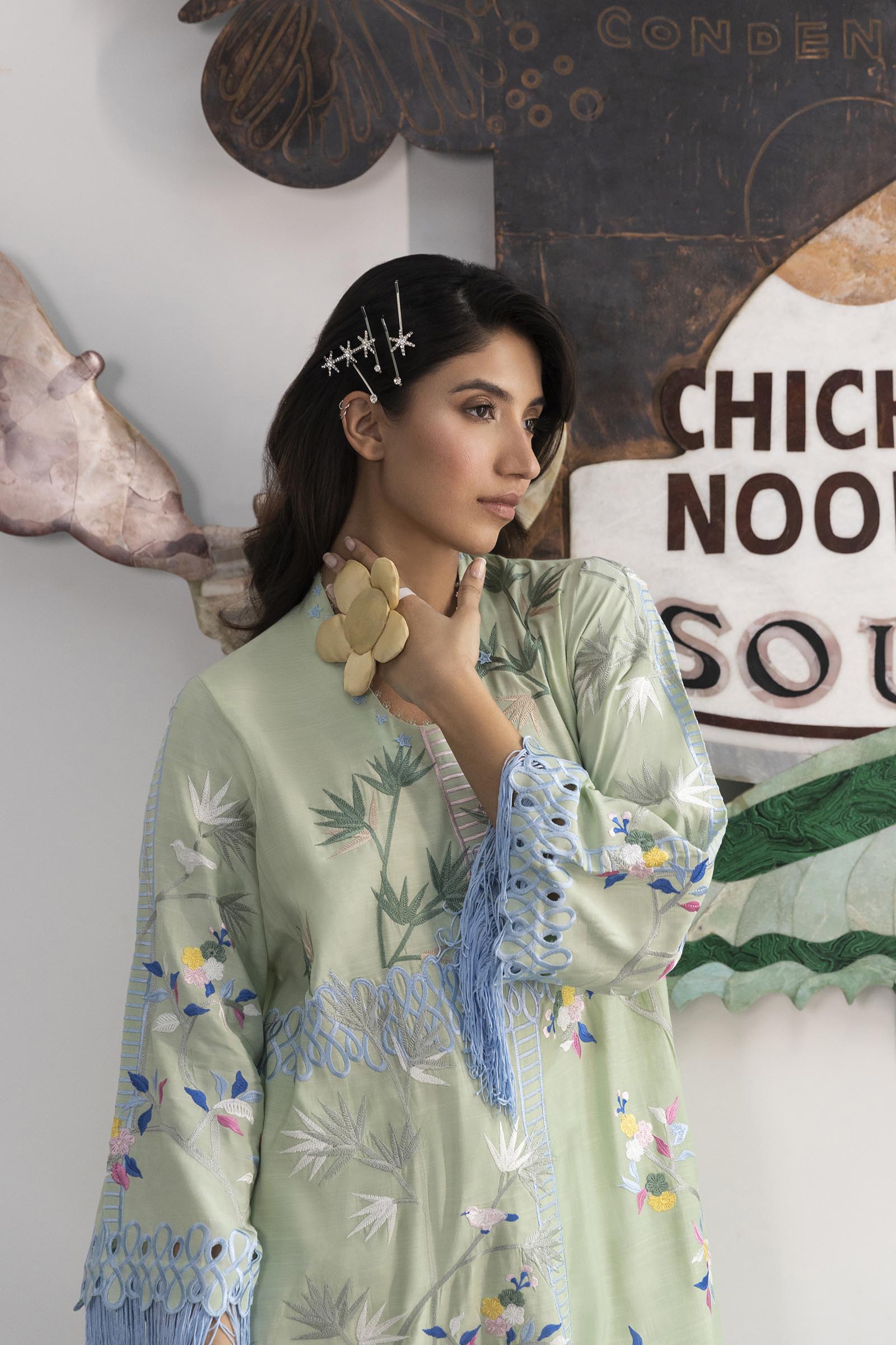 Description: Pista green raw silk outfit with fluid movement — fresh, graceful, and quietly striking.