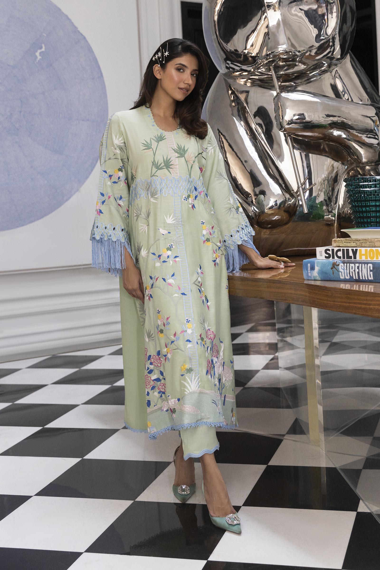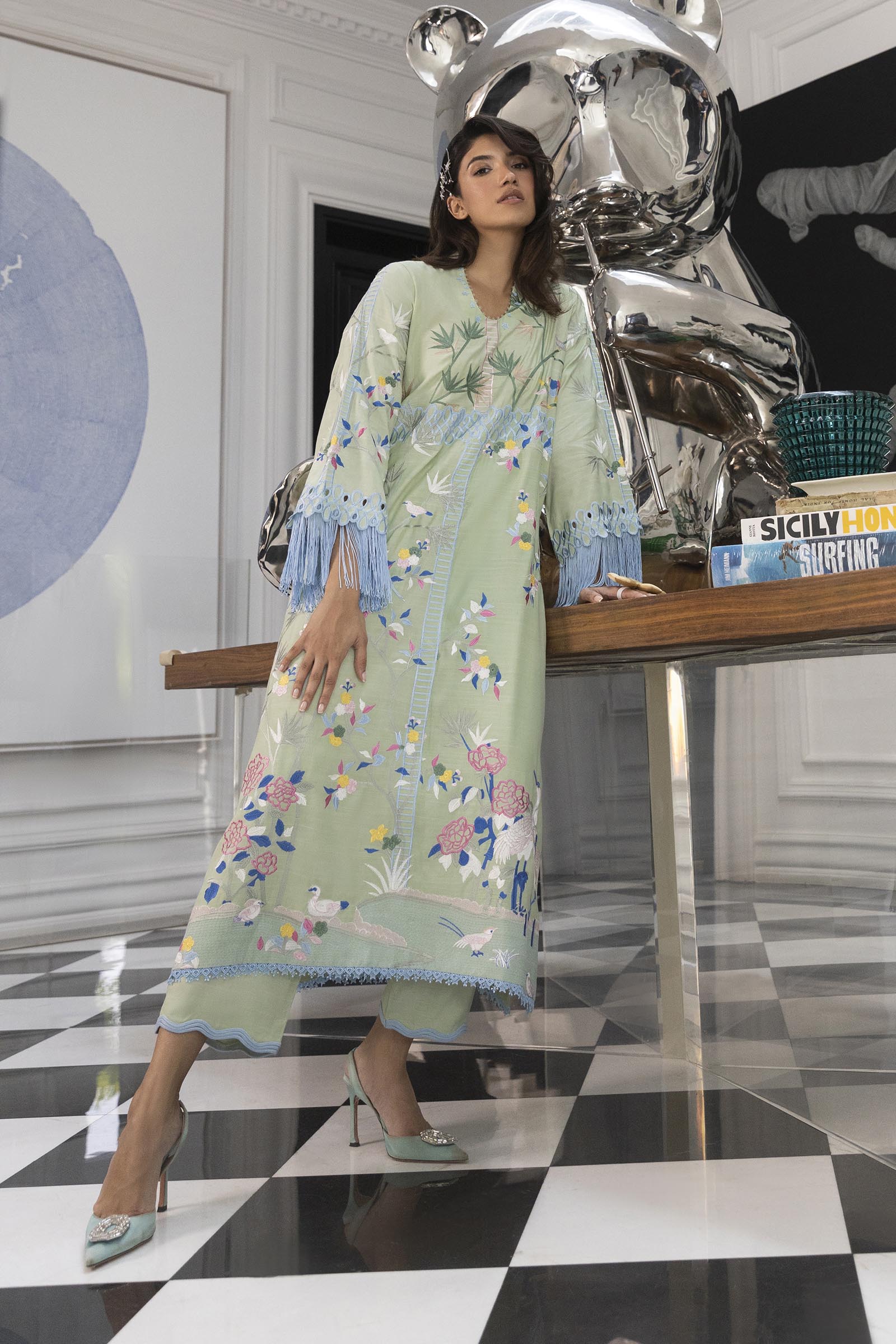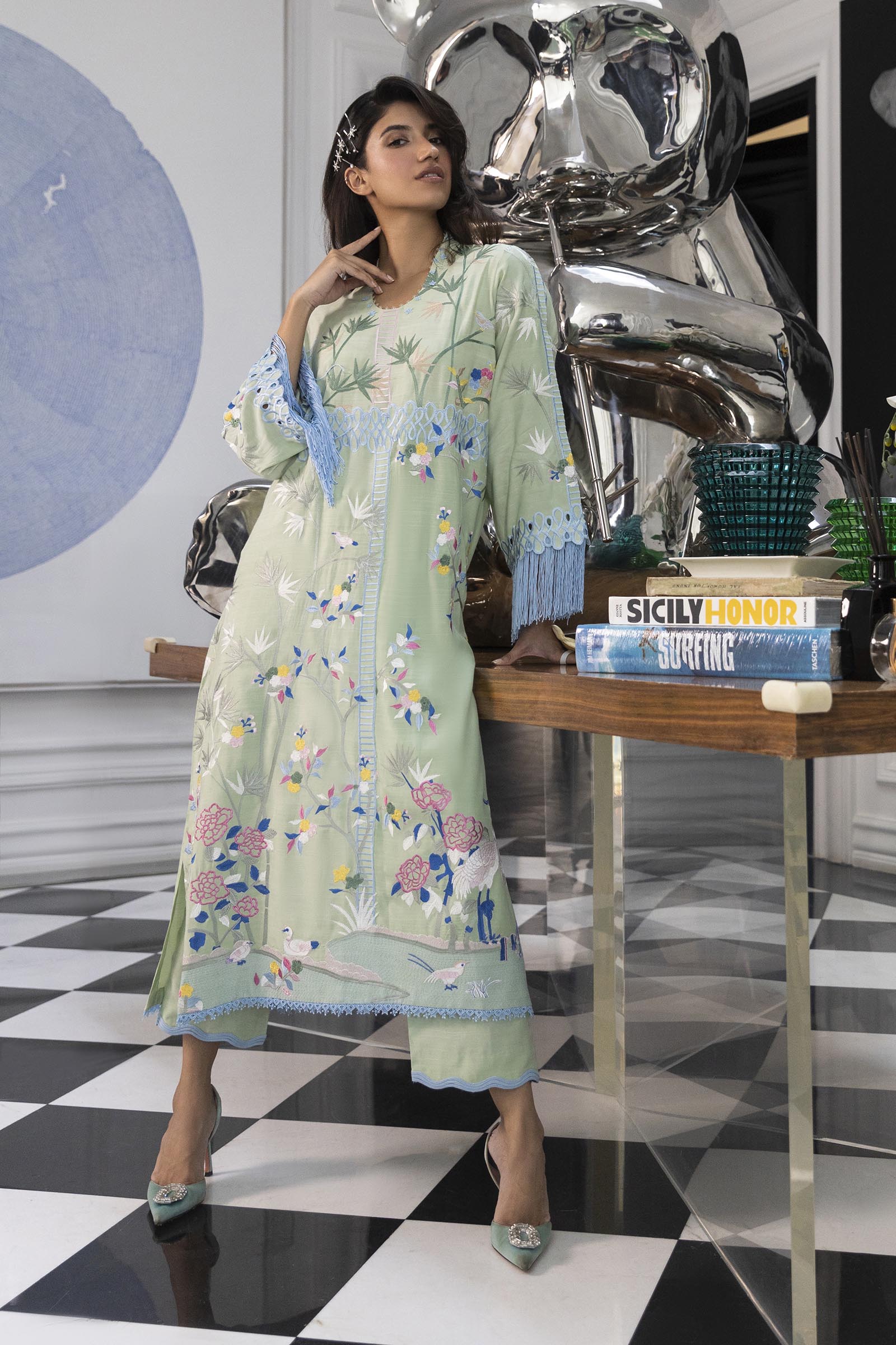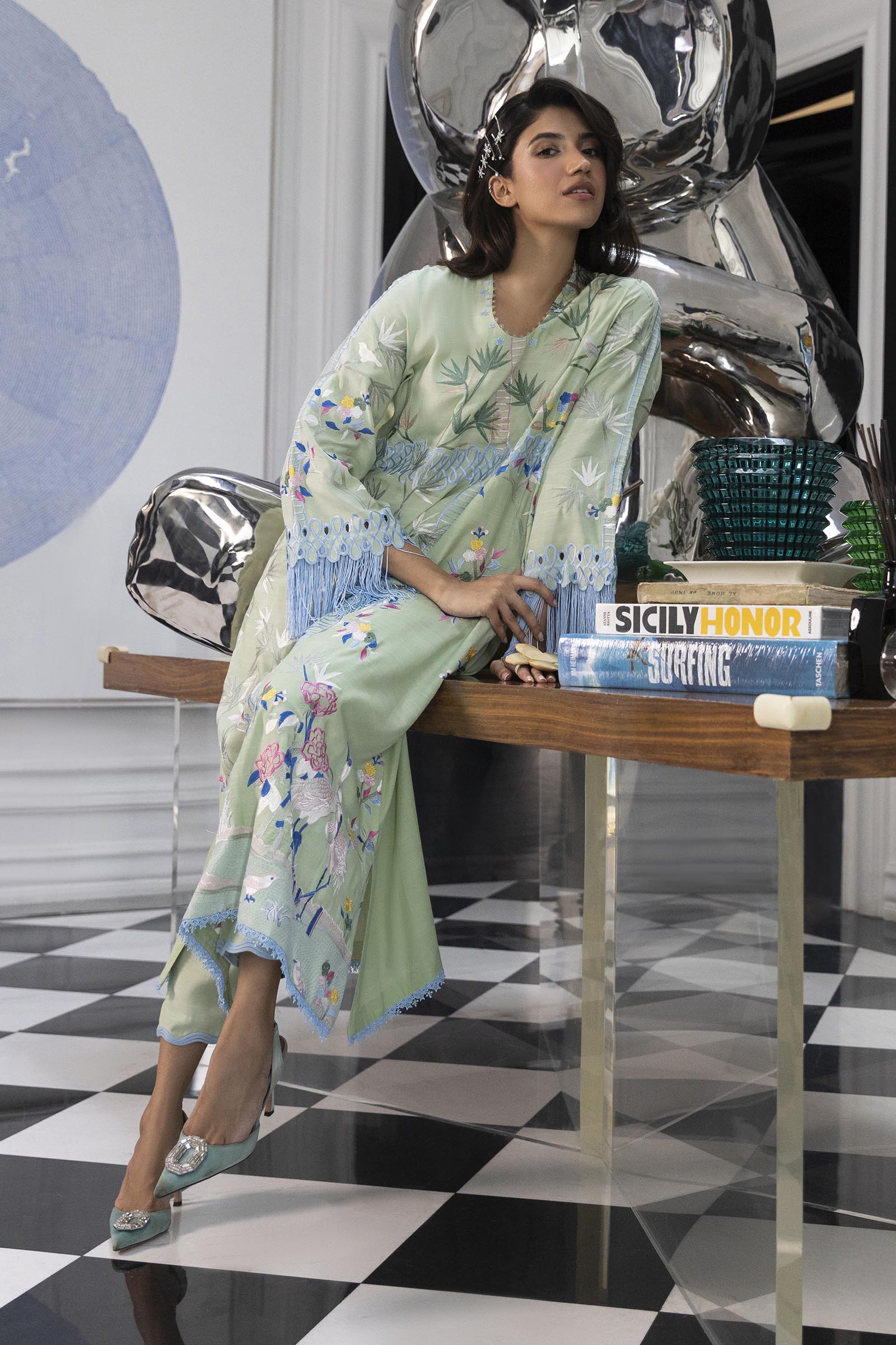 Description: Pista green raw silk outfit with fluid movement — fresh, graceful, and quietly striking.