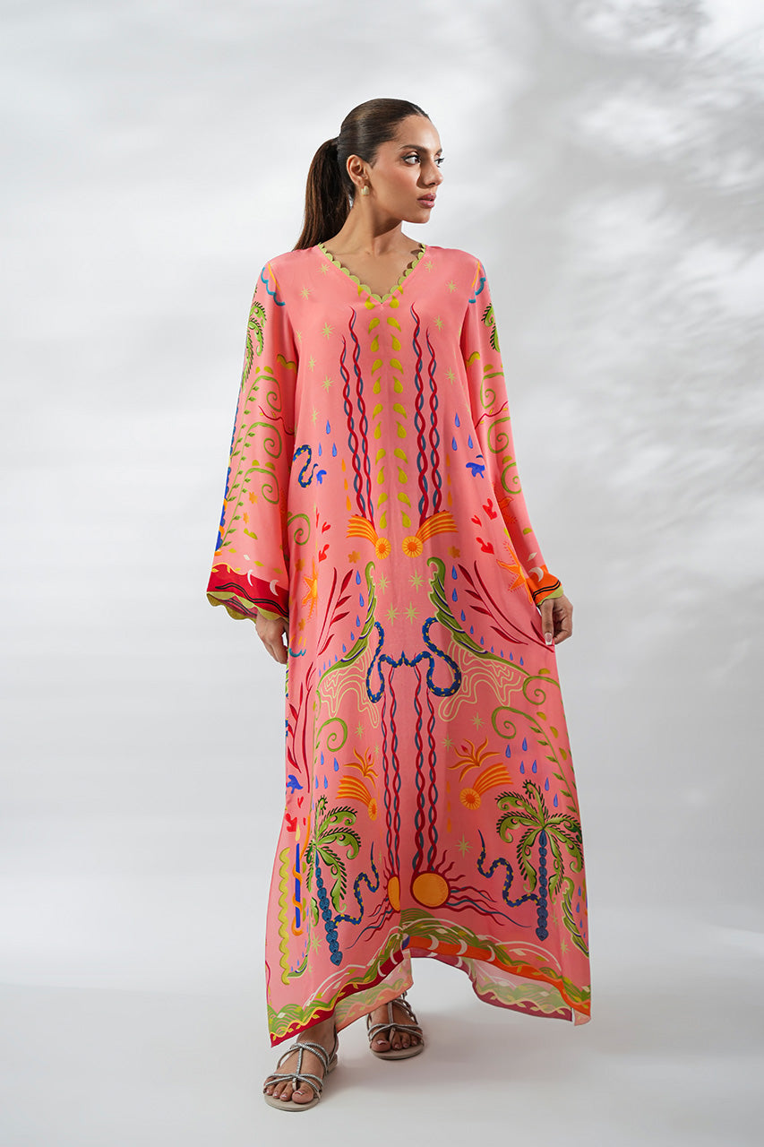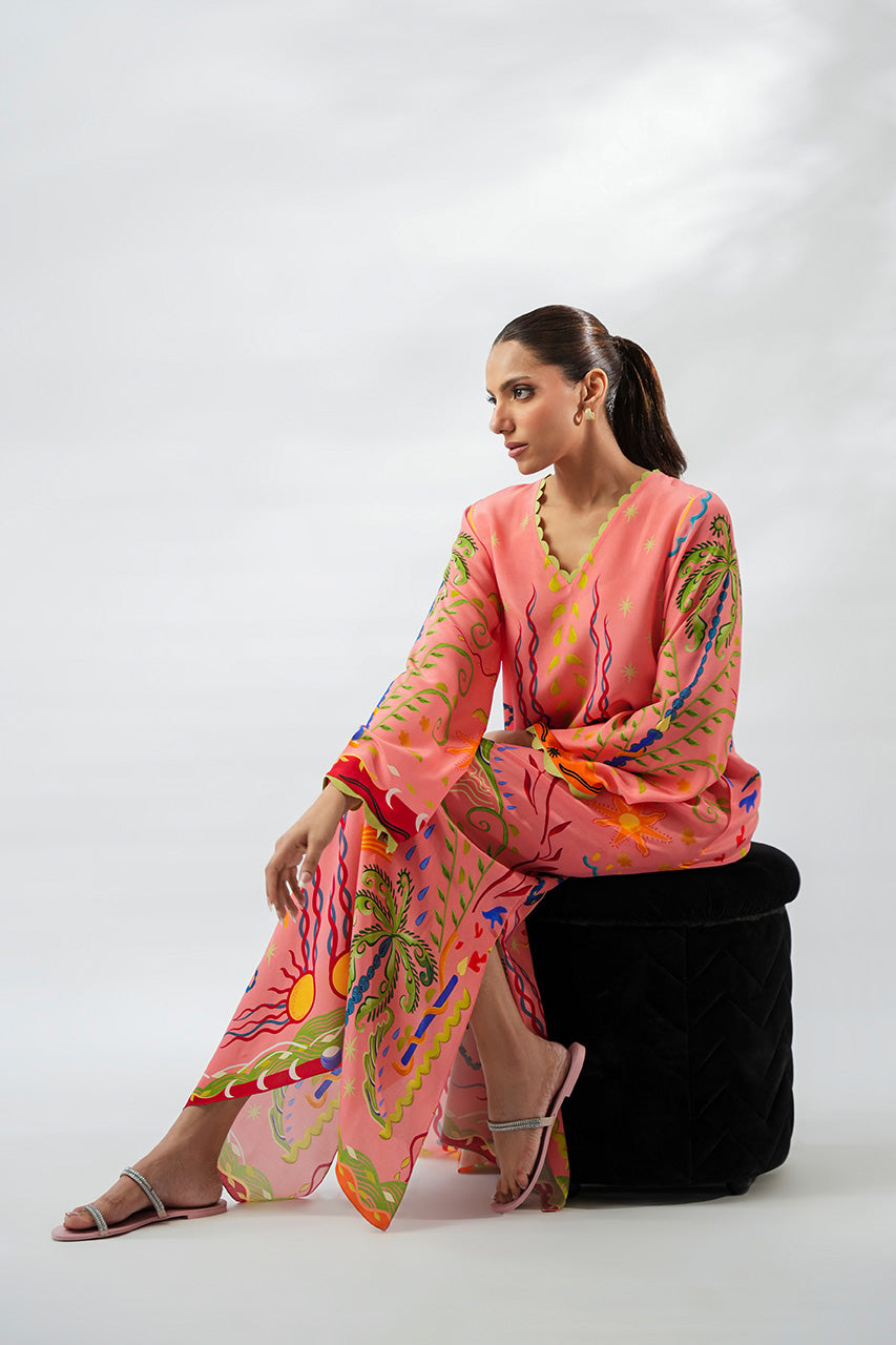 A flowing crepe kaftan in lively coral, adorned with a statement print that fuses tropical motifs and abstract geometry. Palm trees, suns, and organic forms unfold in vivid tones of cobalt, chartreuse, and tangerine. The look is finished with a delicately scalloped neckline and billowing sleeves for an effortless, artful finish.