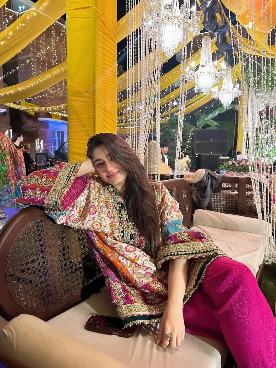 This vibrant A-line short shirt in a multicolored block print is a celebration of artisanal elegance. The velvet neckline brings a touch of luxury, beautifully adorned with resham work and hand embellishments of gold dabka, nakshi, pearls, and colored sequins. Exaggerated sleeves feature hand block-printed borders enriched with gota, finished with velvet trim and delicate gota detailing. Paired with a hot pink silk shalwar complete with gota finishes, this ensemble effortlessly blends traditional artistry with a bold, contemporary flare.