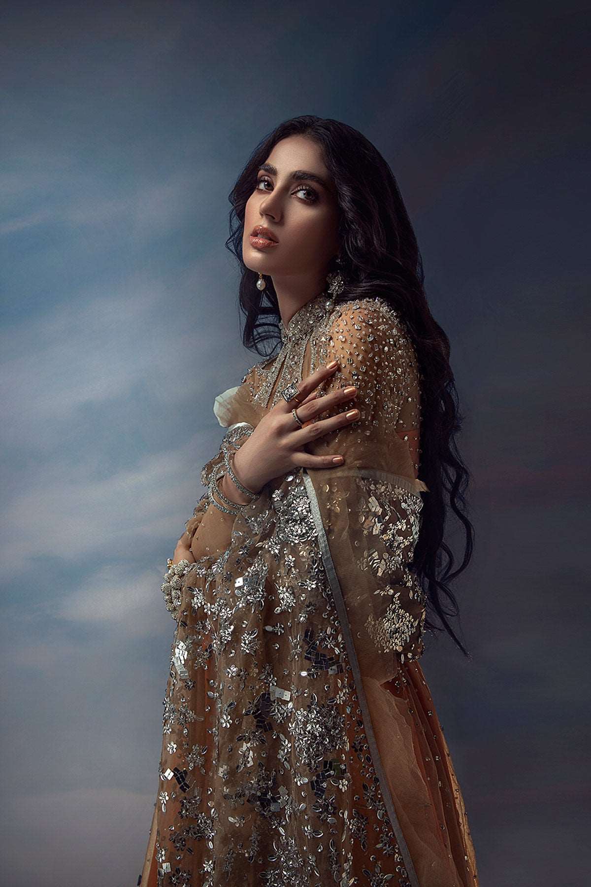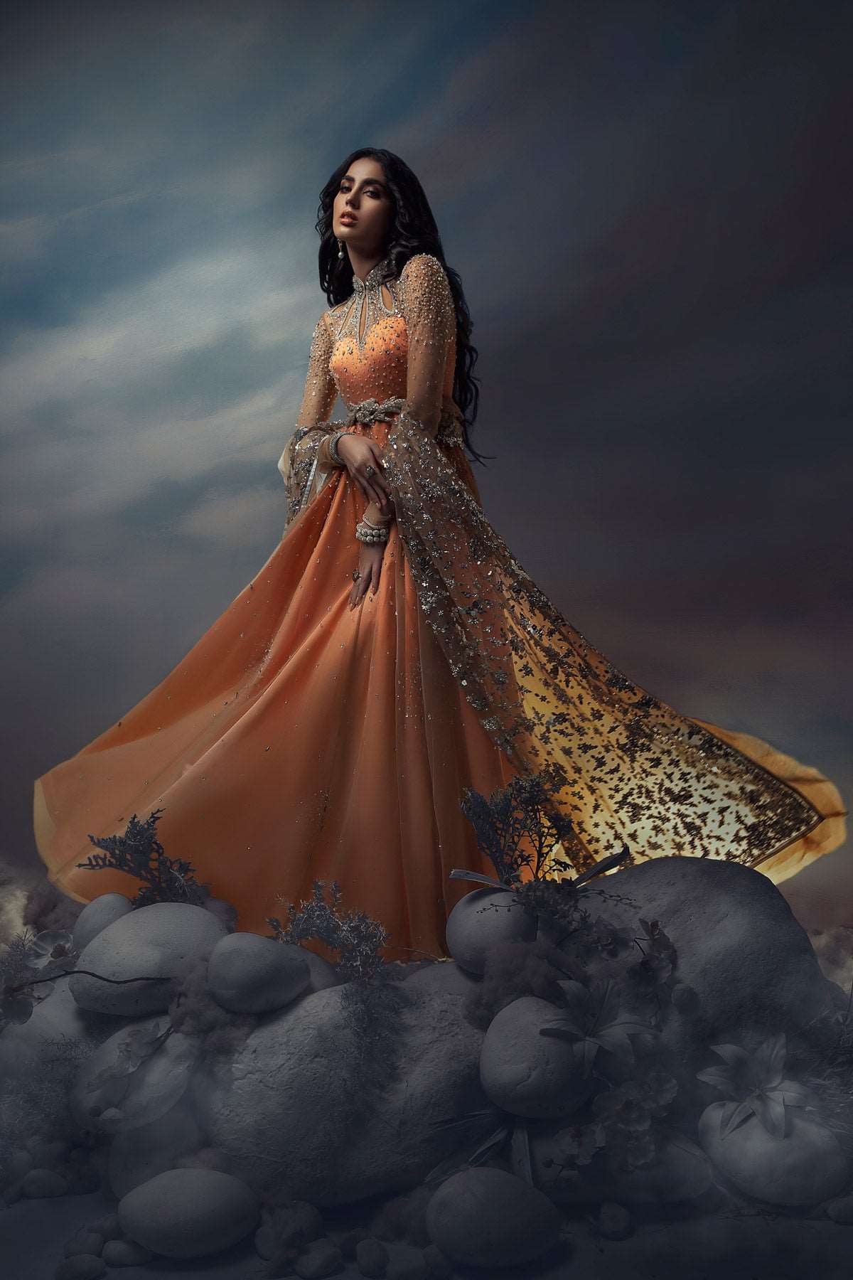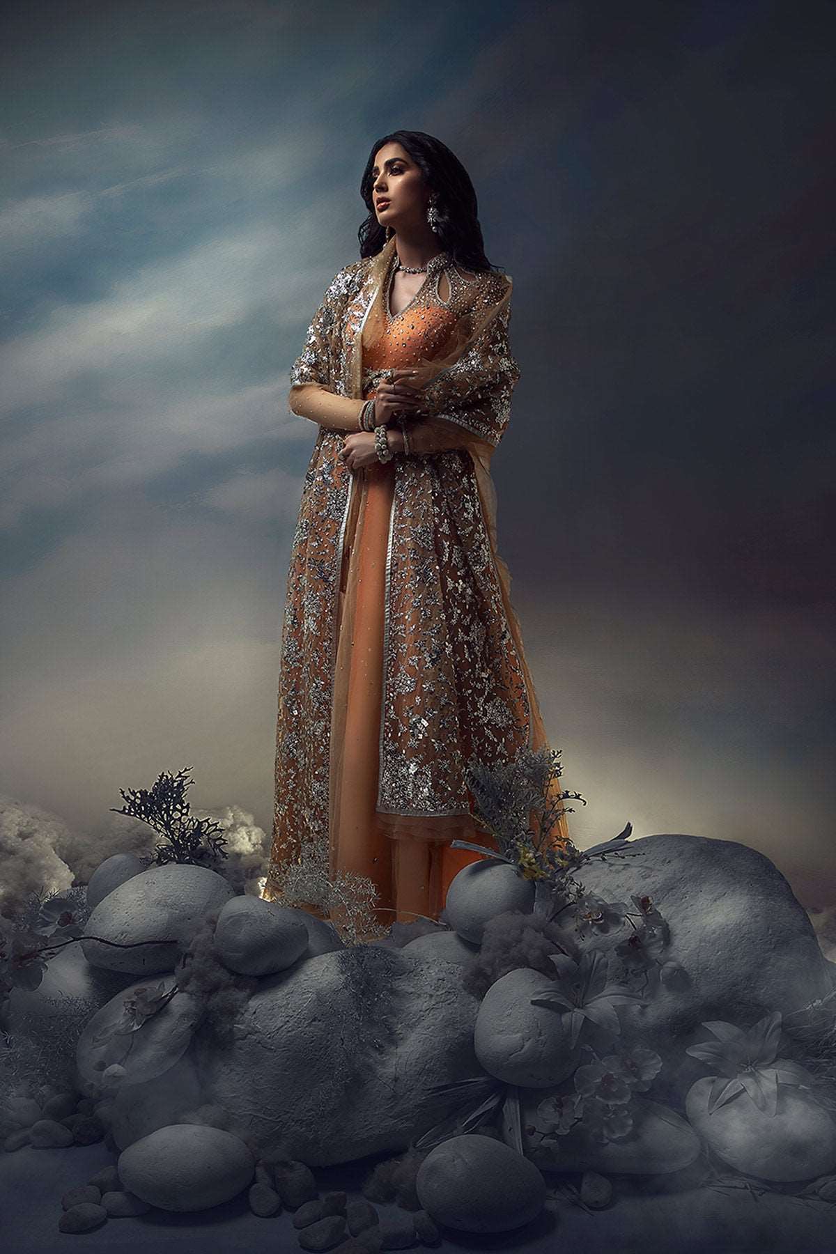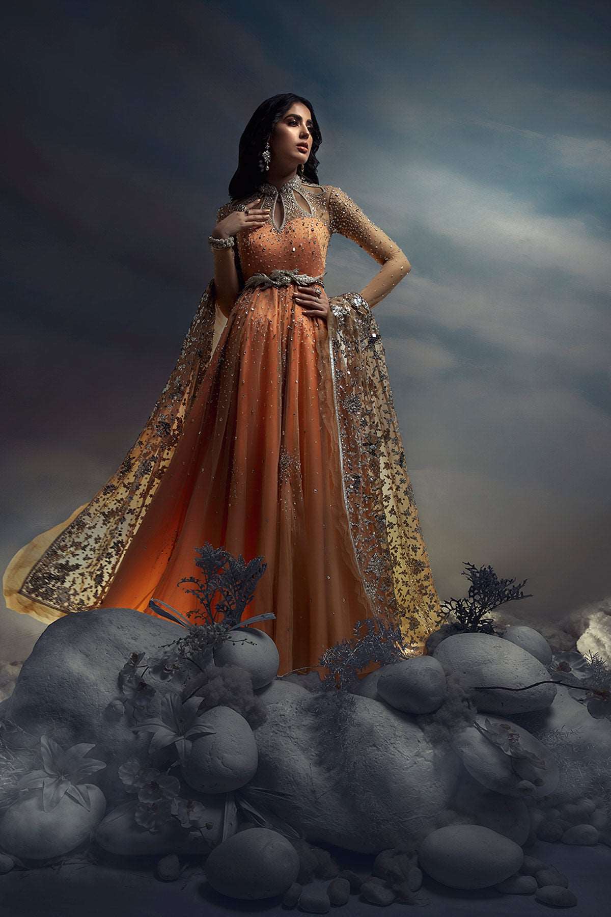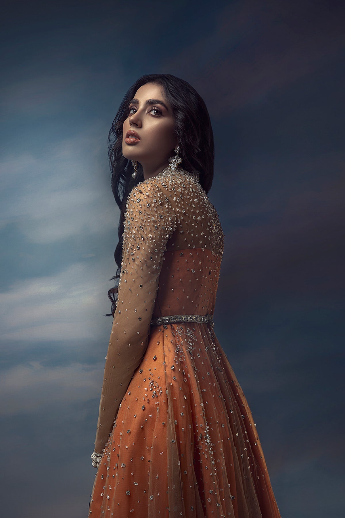 A timeless romance between classic and modern sensibilities. An artistic disperse of crystals on coral rose tulle comes together with delicately hand-worked sequins on an exquisitely finished stole. Our signature bejewelled belt tells a tale of two hand-crafted angelfish tying the knot on layers of silk.