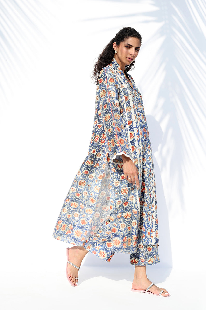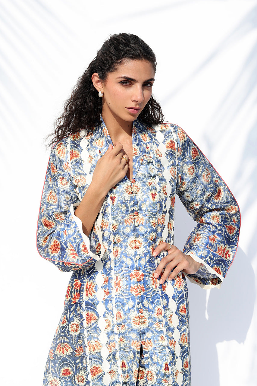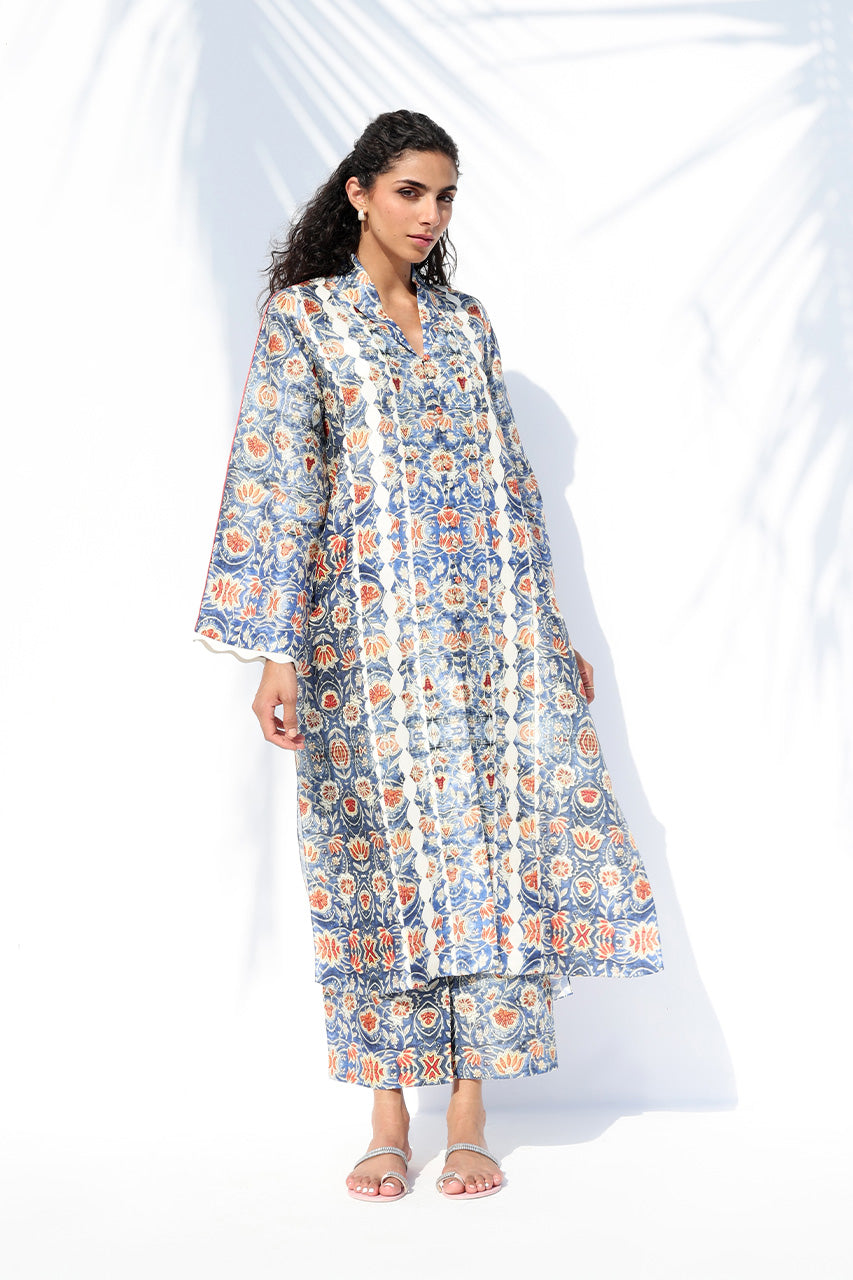 A striking ensemble in pure Raw Silk, this look celebrates artisanal print and effortless ease. The long, relaxed kurta showcases an intricate pattern inspired by traditional tilework, rendered in tones of cobalt, amber, and ivory. Intricately textured vines created through fabric manipulation trace the front, while a collared neckline and scalloped sleeves lend refined detail. Paired with matching printed culottes, the ensemble captures contemporary sophistication with handcrafted charm.