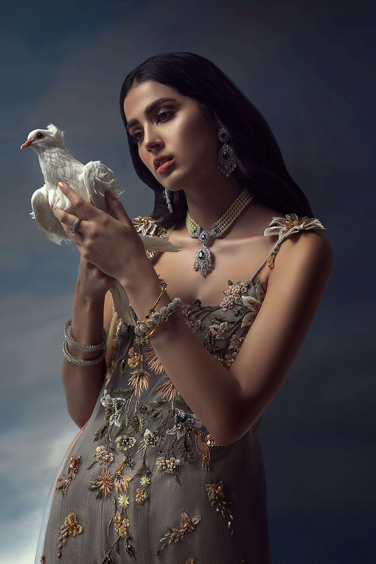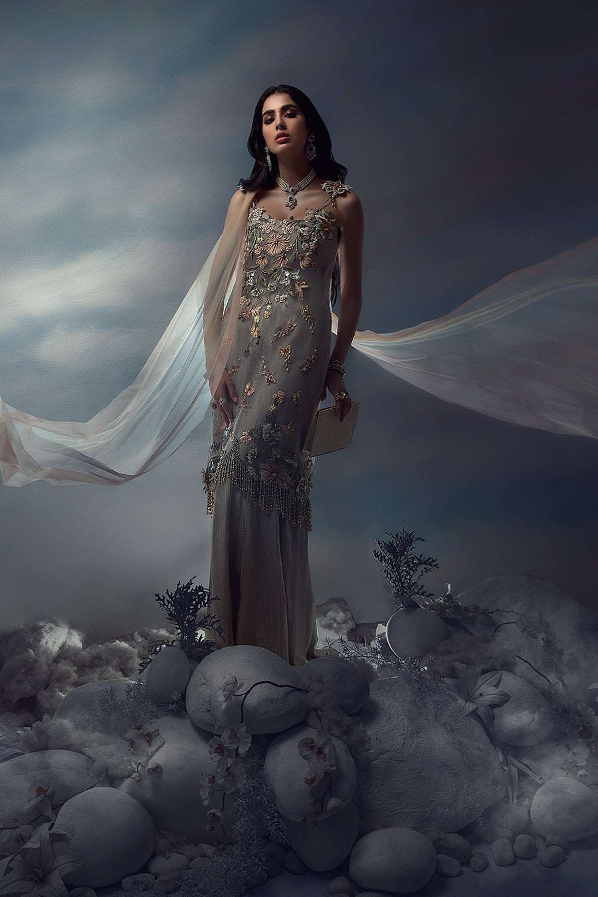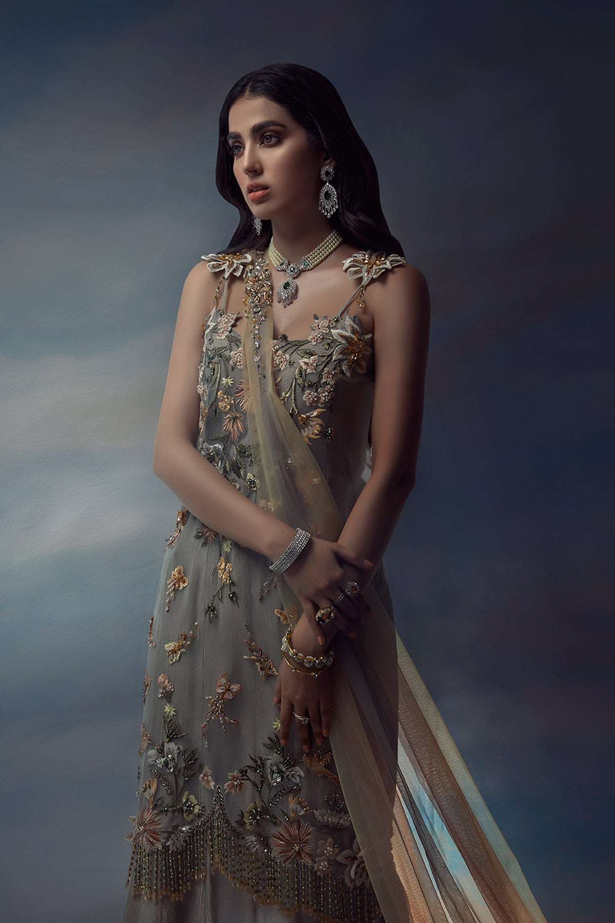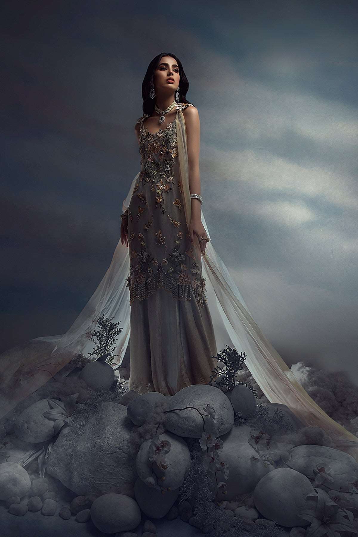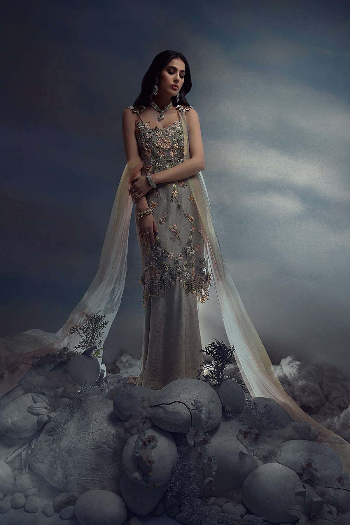 A monsoon dream comes to life as textures of silver tissue gracefully fall along her silhouette. Rain washed vibrance of hand-embellished details sparkle amidst subtle hues of pale peach and blush. Our summer tunic drapes upon a crushed flared dress with a uniquely multi-shaded tulle stole.